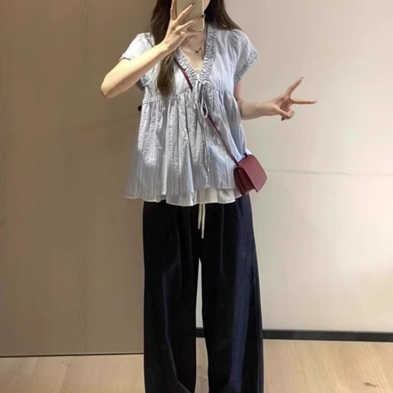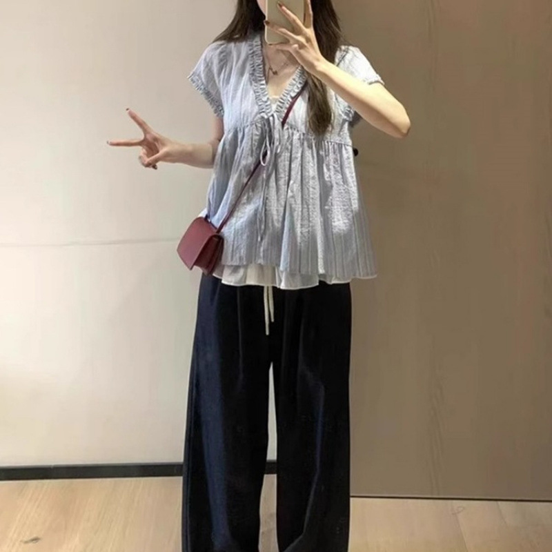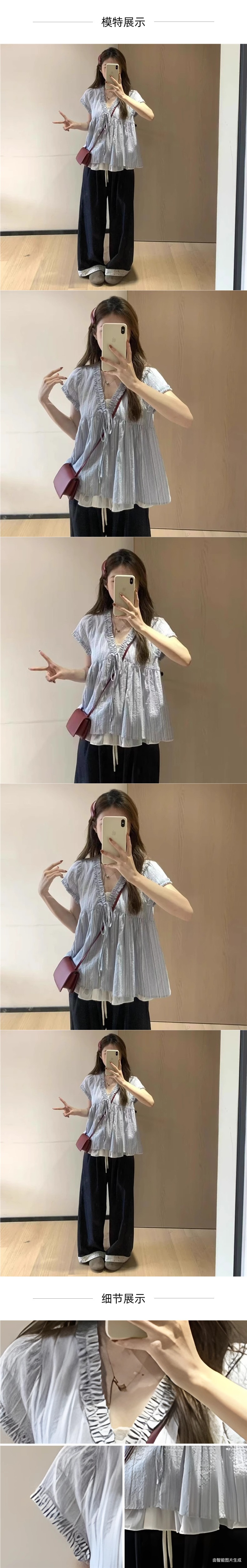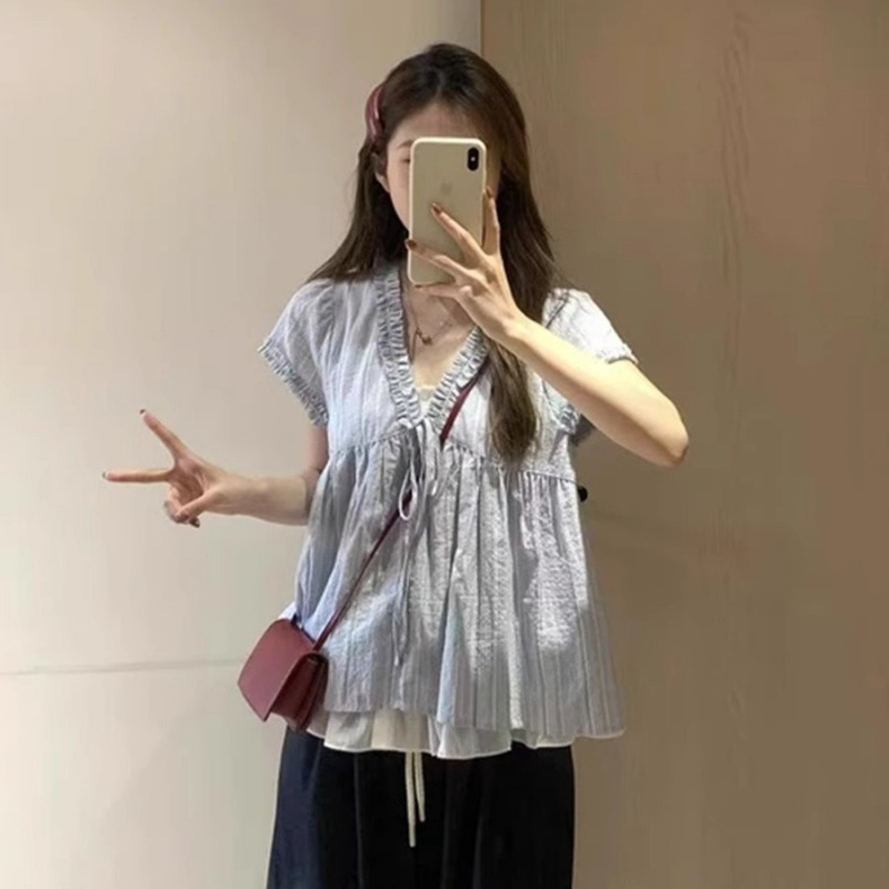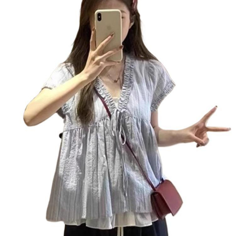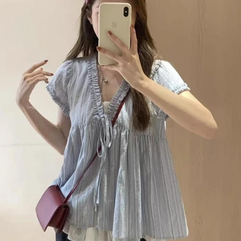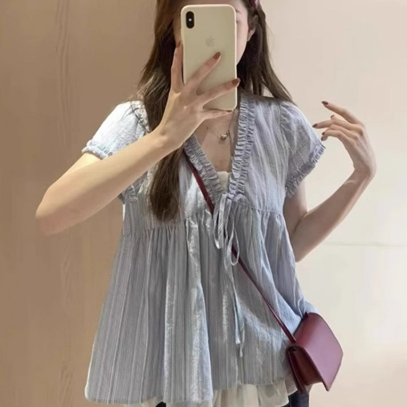 Синяя полосатая искусственная рубашка из двух частей с v-образным вырезом и короткими рукавами для женщин, летний дизайн, уменьшающий возраст, свободный топ-кукла