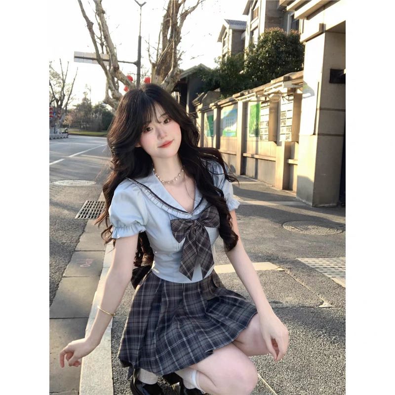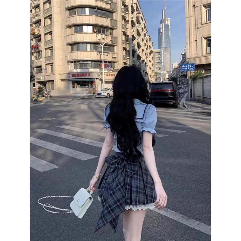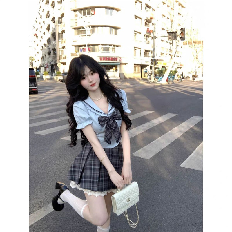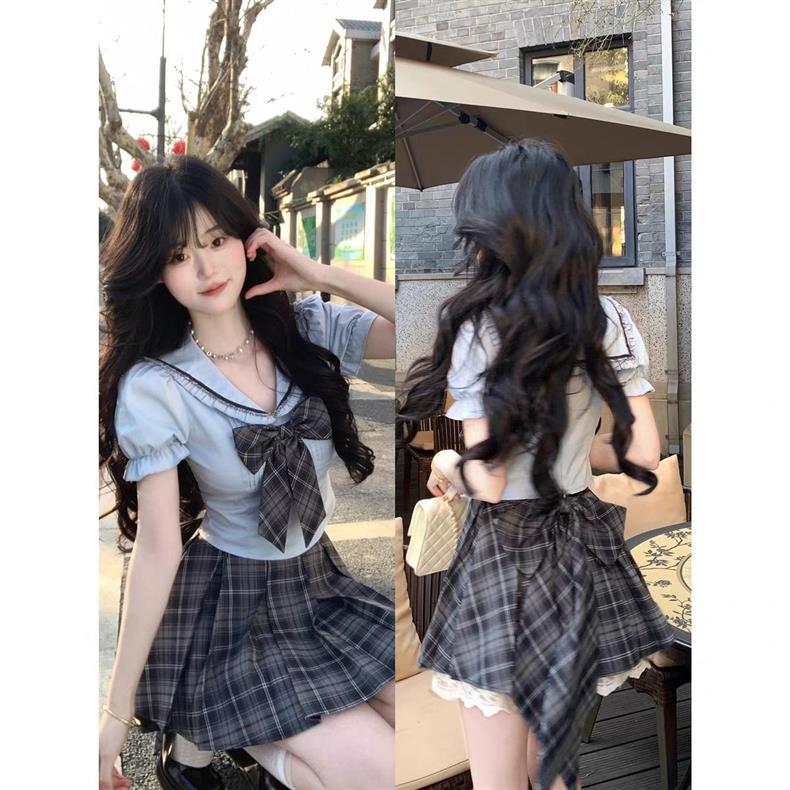 Костюм Lanyu Ge College с бантом, темно-синяя рубашка с воротником + клетчатая юбка