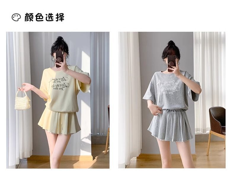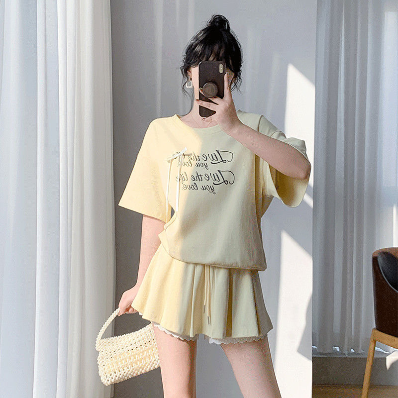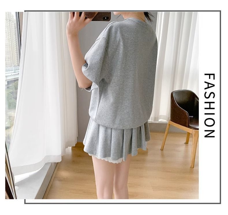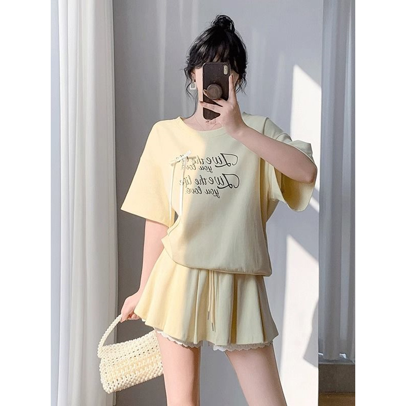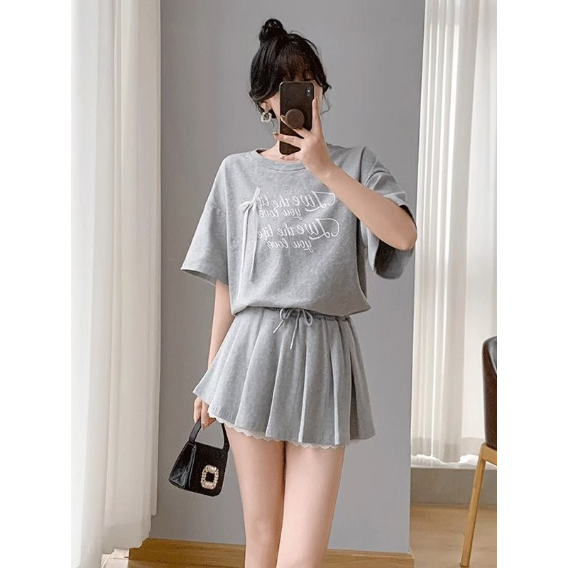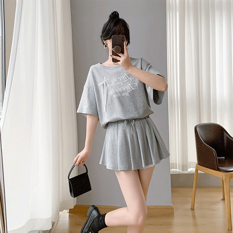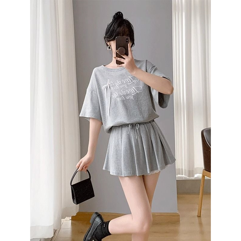 Плюс размер fat mm 150kg футболка с короткими рукавами и французским бантом, женская летняя плиссированная юбка трапециевидной формы с высокой талией, комплект из двух предметов