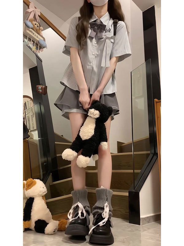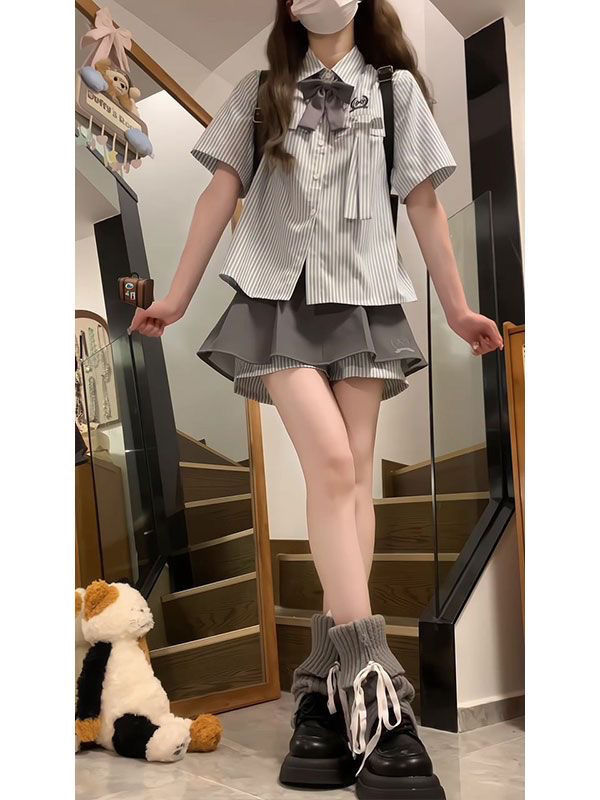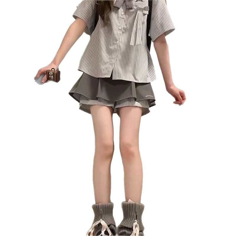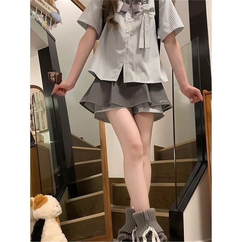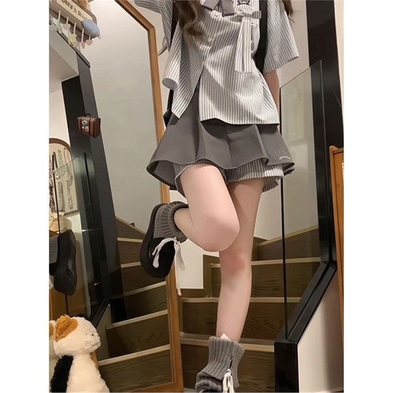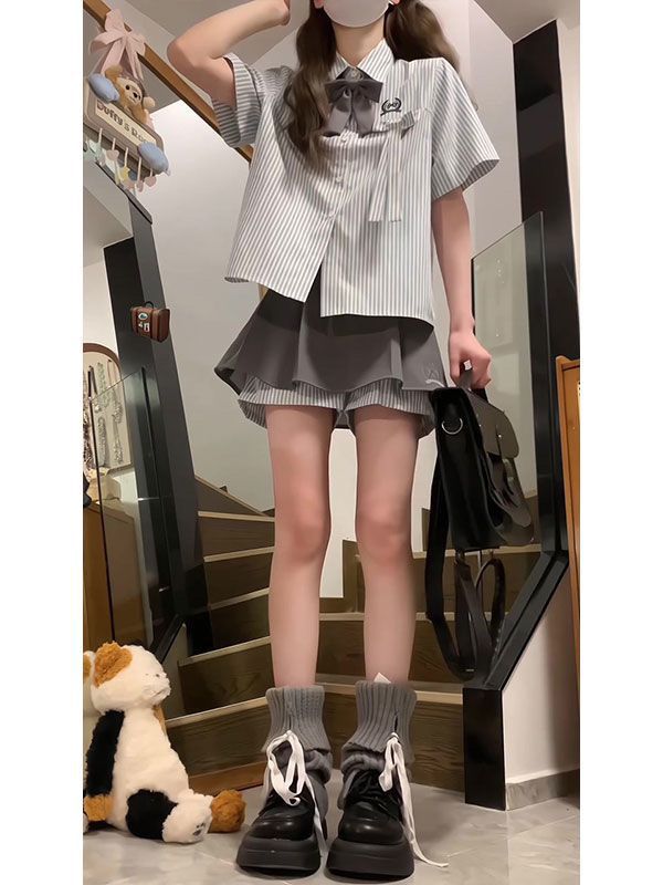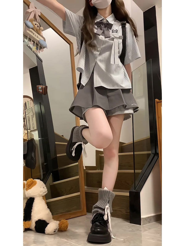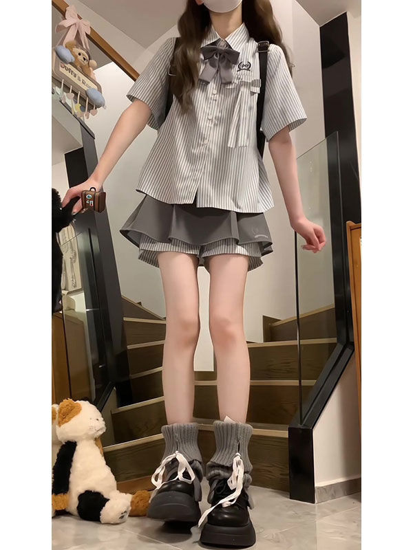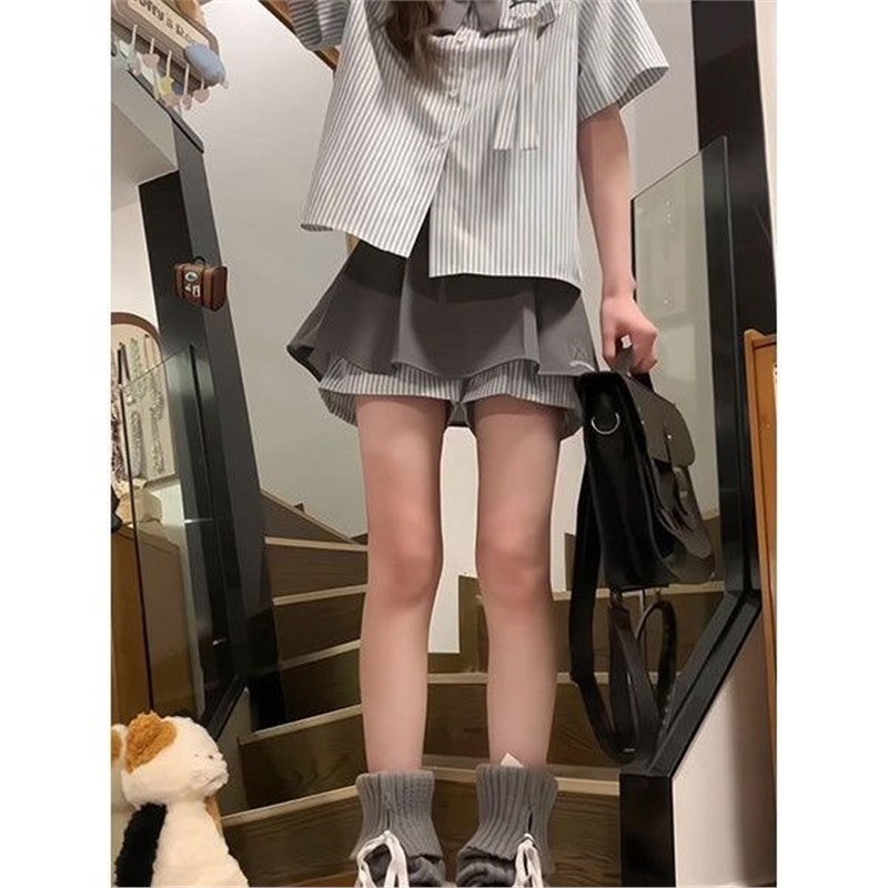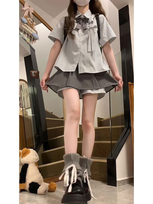 Летний костюм в корейском стиле, молодежный, с короткими рукавами, полосатая рубашка, плиссированная юбка с высокой талией, комплект из двух предметов