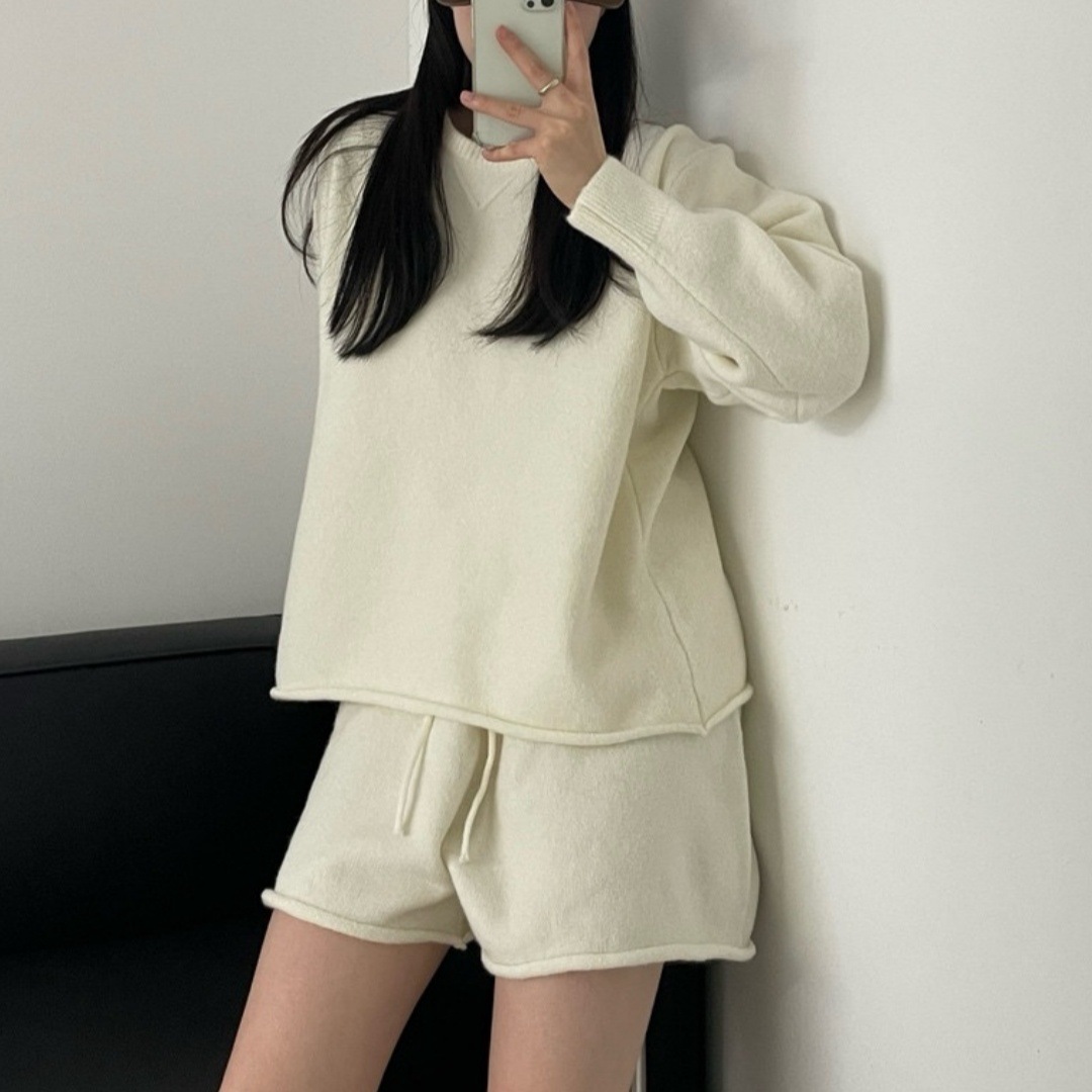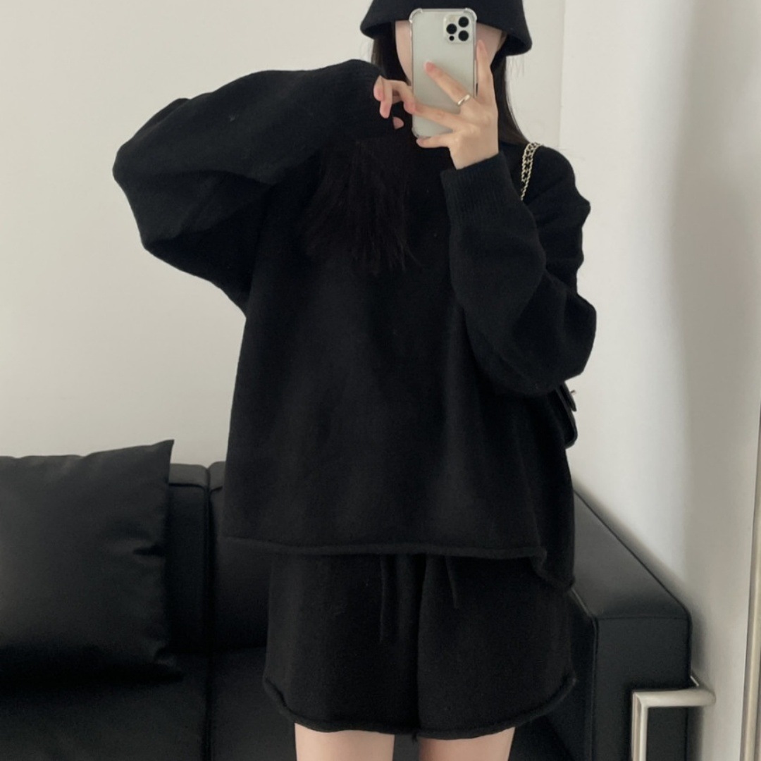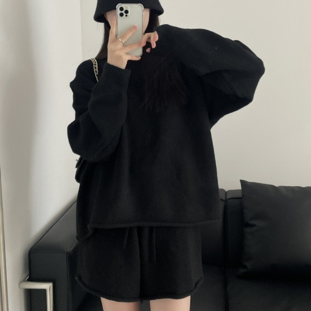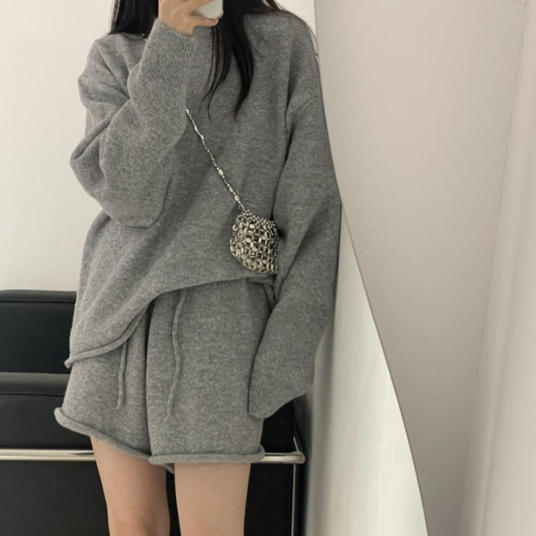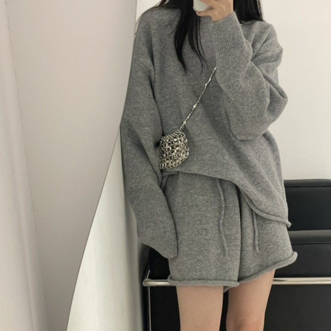 Корейский стиль: полный комплект женского свободного свитера с круглым вырезом + повседневные шорты, вязаный комплект из двух предметов