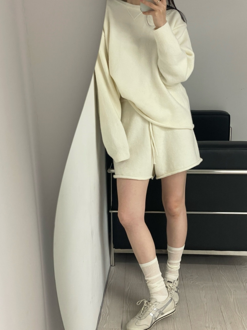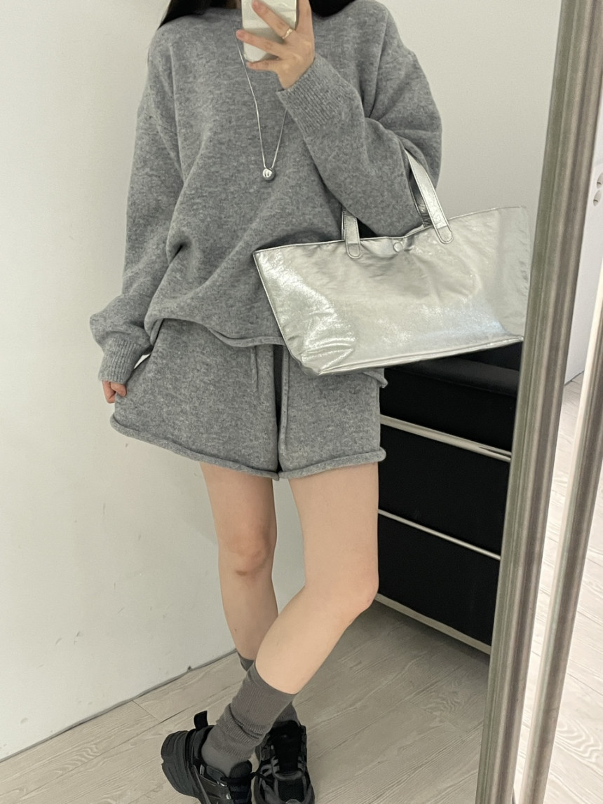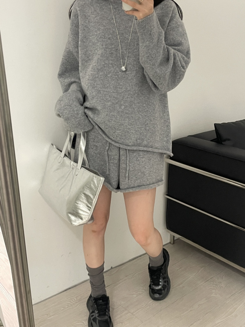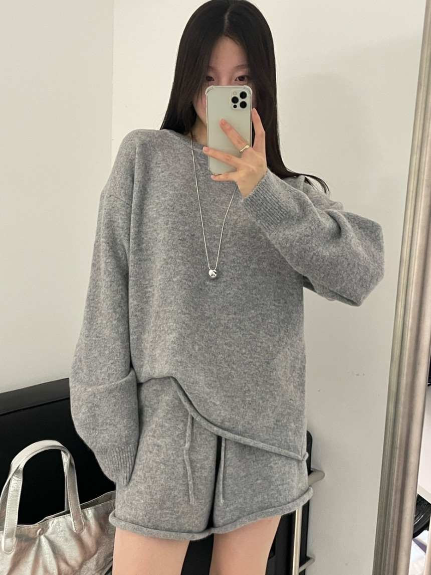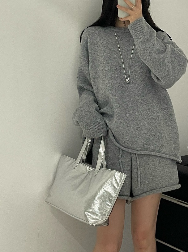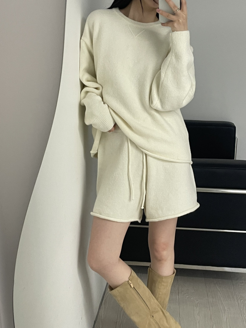 Корейский стиль: полный комплект женского свободного свитера с круглым вырезом + повседневные шорты, вязаный комплект из двух предметов