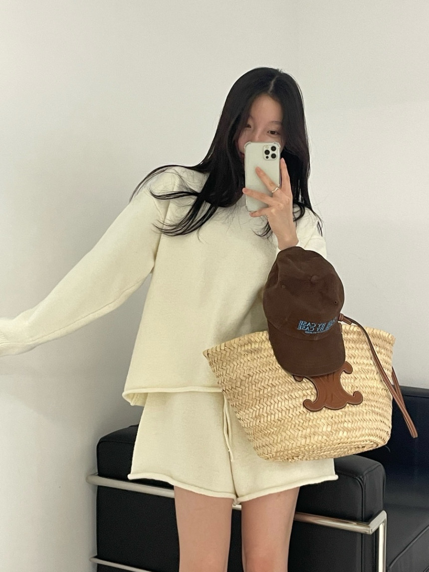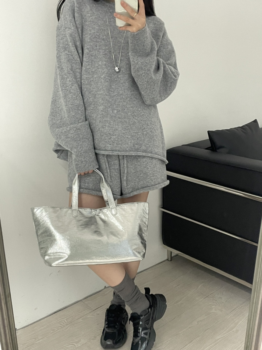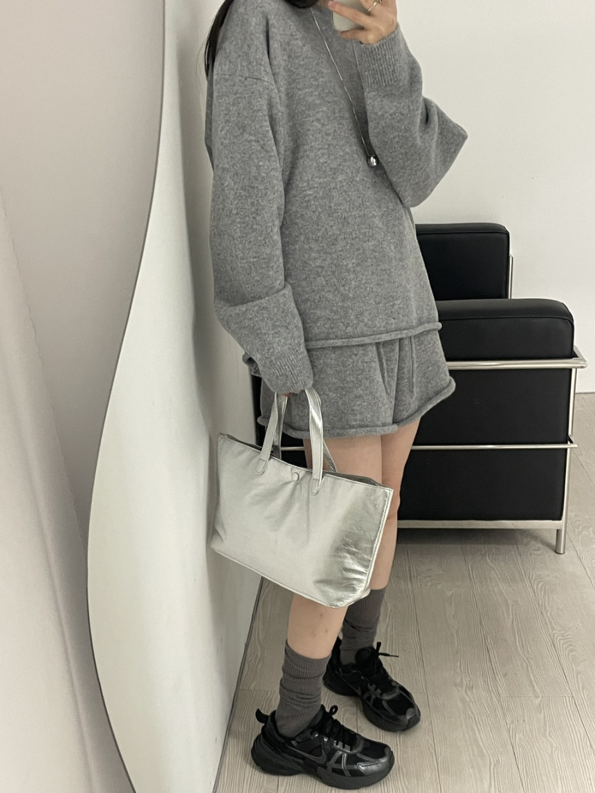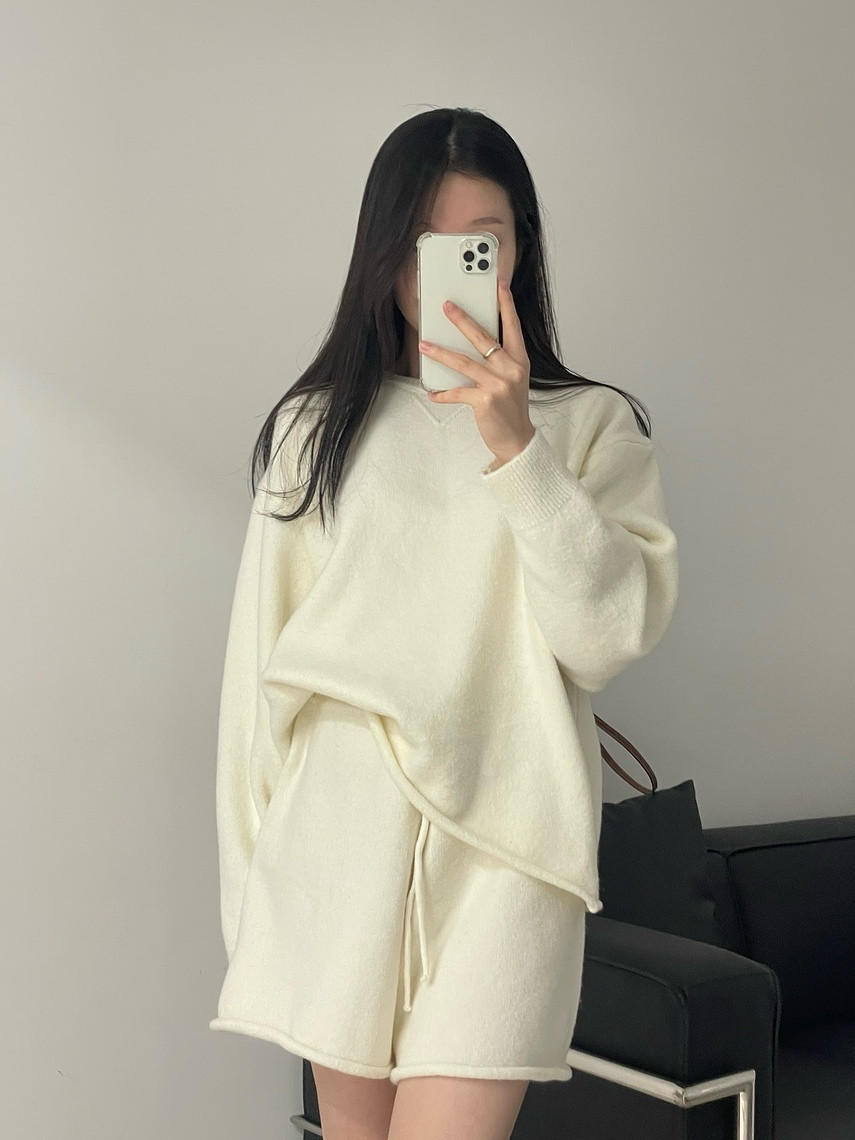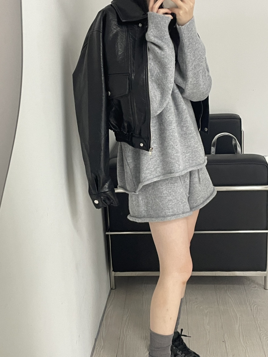 Корейский стиль: полный комплект женского свободного свитера с круглым вырезом + повседневные шорты, вязаный комплект из двух предметов
