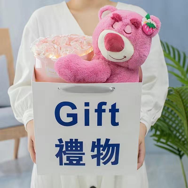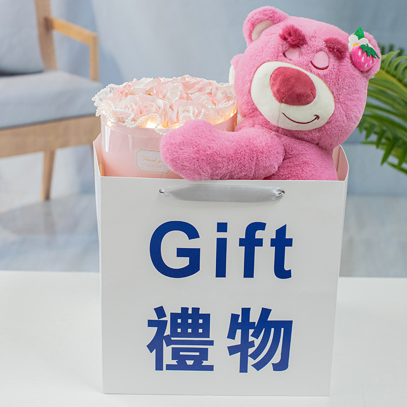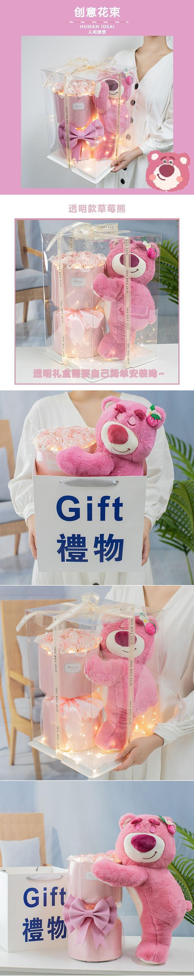 Розовый букет из 6 цветов (лента) + маленький клубничный мишка 30см + подарочная сумочка 25*25*26 + световая нить; Розовый букет 6 цветов (лента) + маленький клубничный мишка 30см + коробочка для торта + световая нить; 11 бантиков с розовым цветом + средний клубничный мишка 40см + подарочная сумочка 28*28*28 + световая веревочка; 11 бантиков с розовым цветом + средний клубничный мишка 40 см + коробка для торта + легкая веревка; 11 бантиков розового цвета + большой клубничный мишка 50см + подарочная сумочка 28*28*28 + световая веревочка; Пожалуйста, свяжитесь со службой поддержки клиентов для настройки