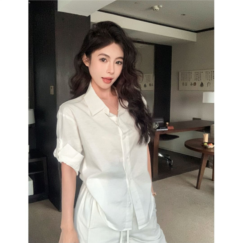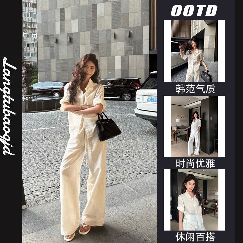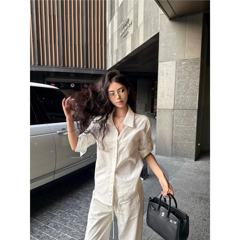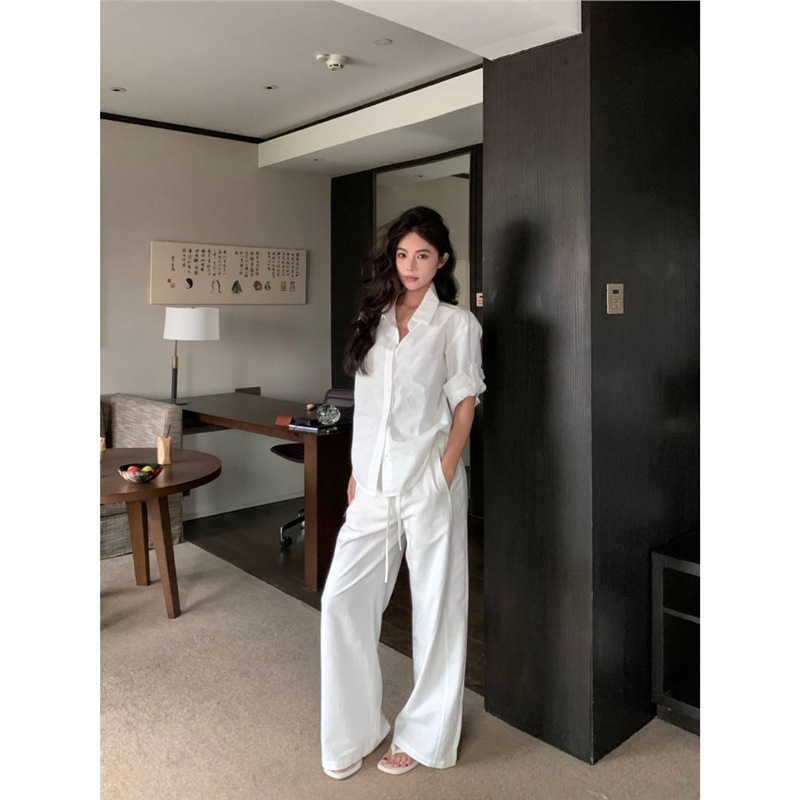 Релаксирующий костюм, элегантная модная рубашка с воротником-поло и половиной рукавов, женская летняя одежда, повседневные брюки, широкие брюки, комплект из двух предметов.