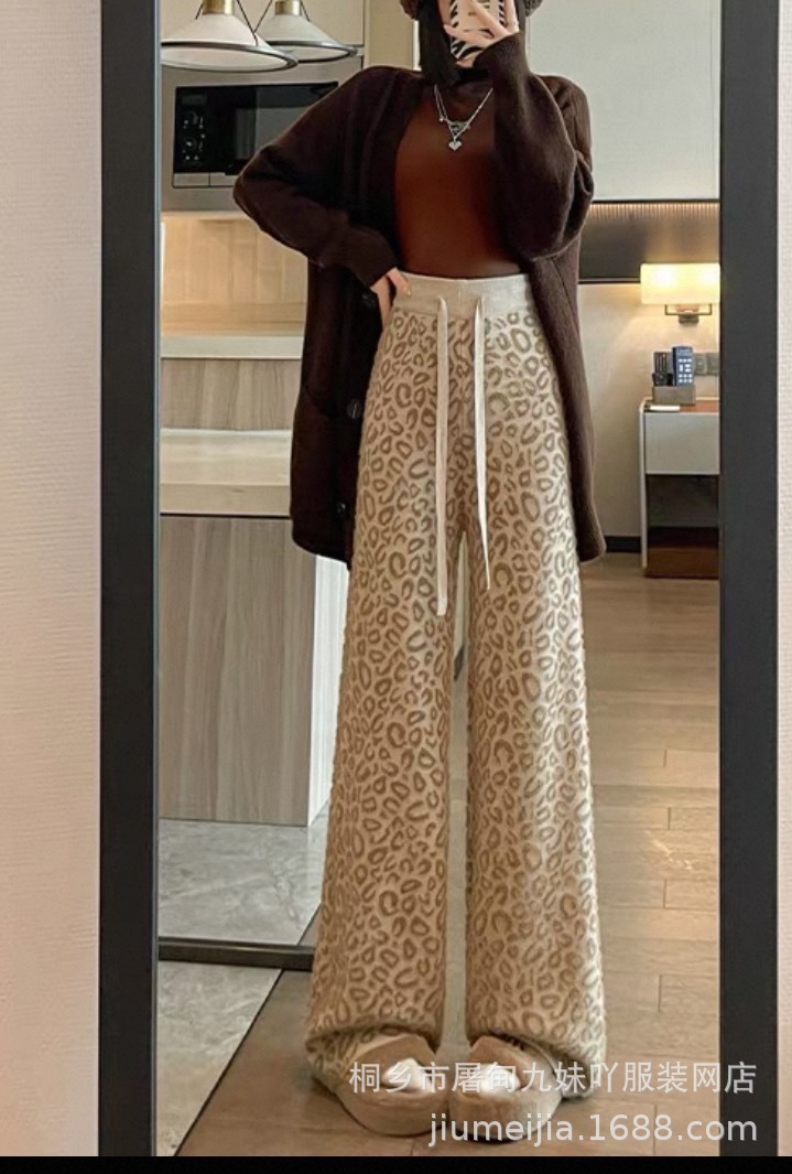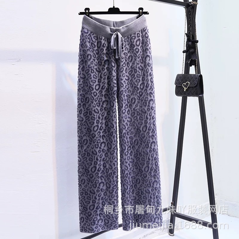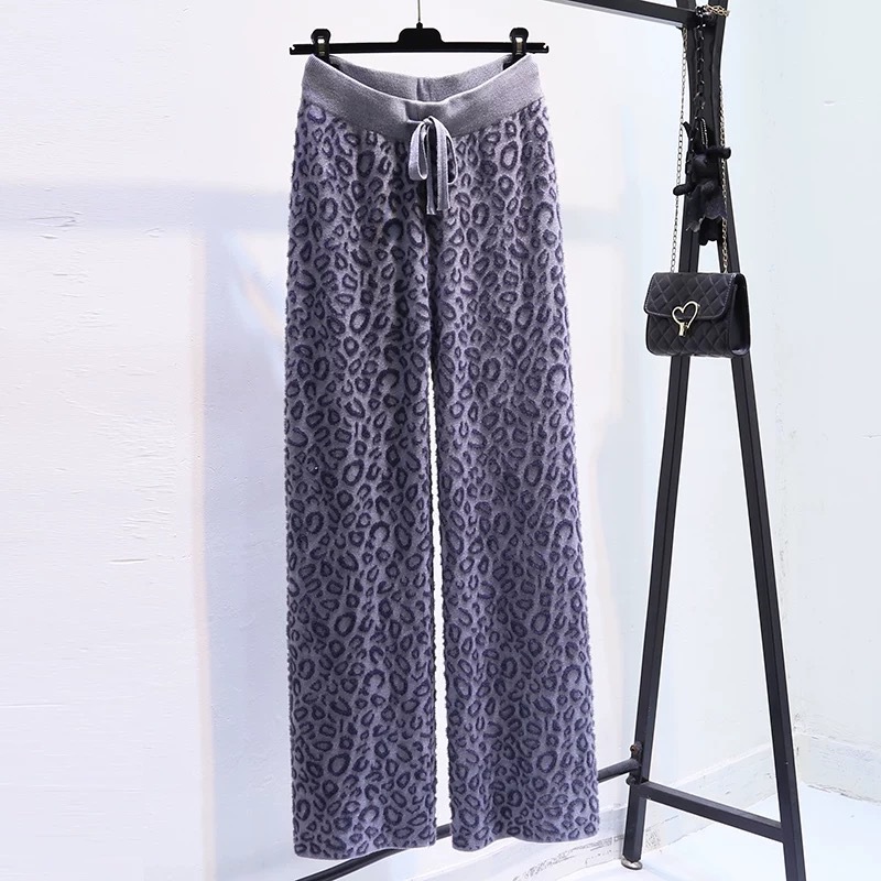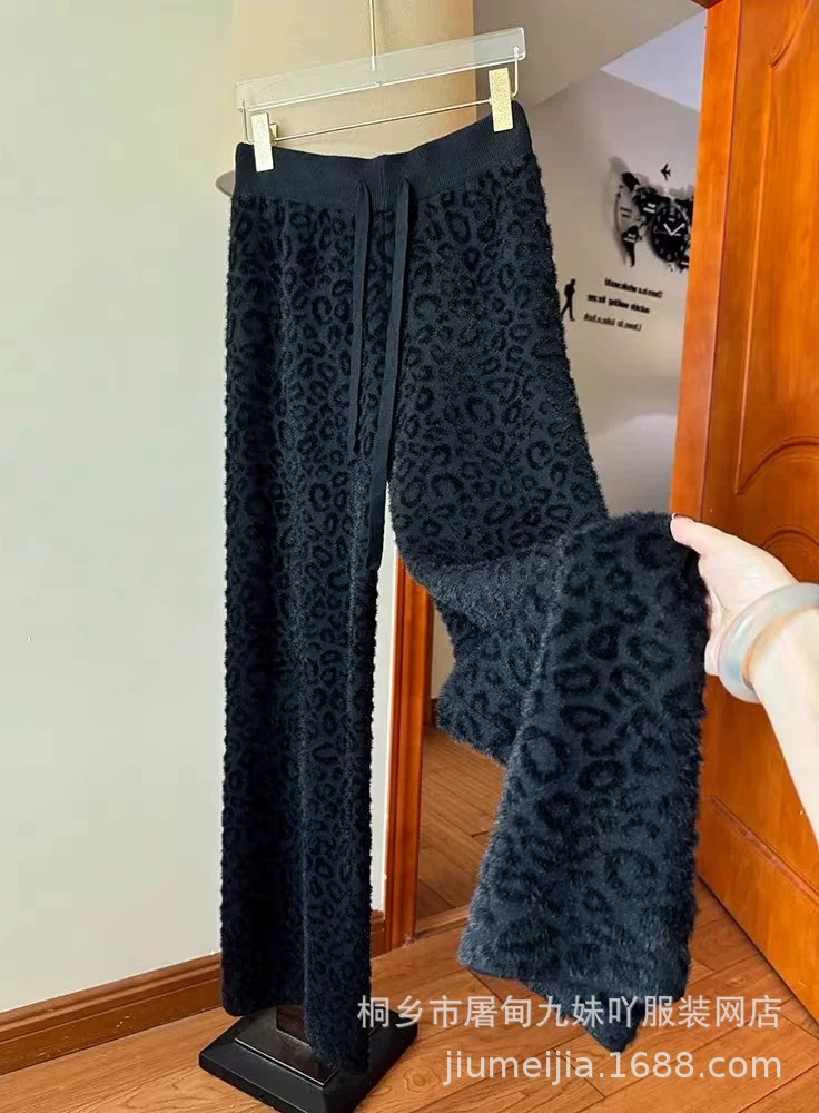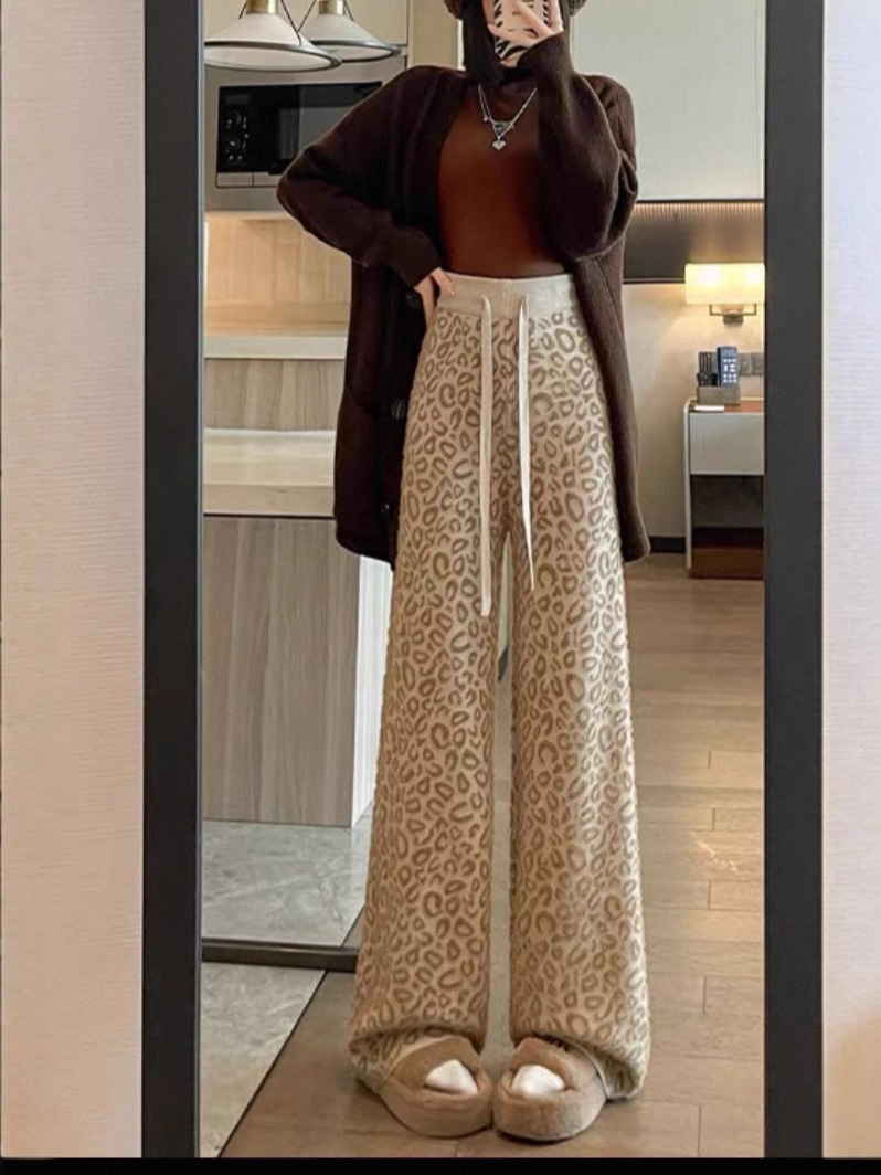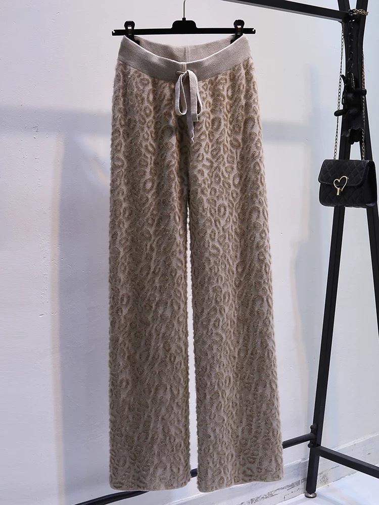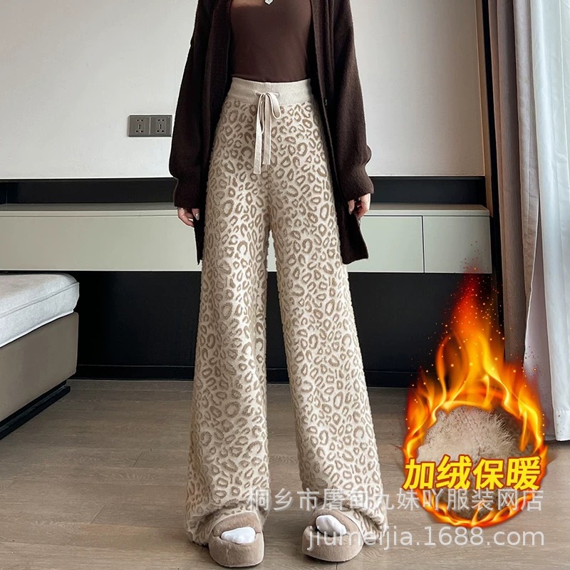 Вязаные широкие брюки с леопардовым принтом из искусственного норкового бархата для женщин, осень и зима 2025, новые утолщенные драпированные брюки длиной до пола с высокой талией, повседневные брюки
