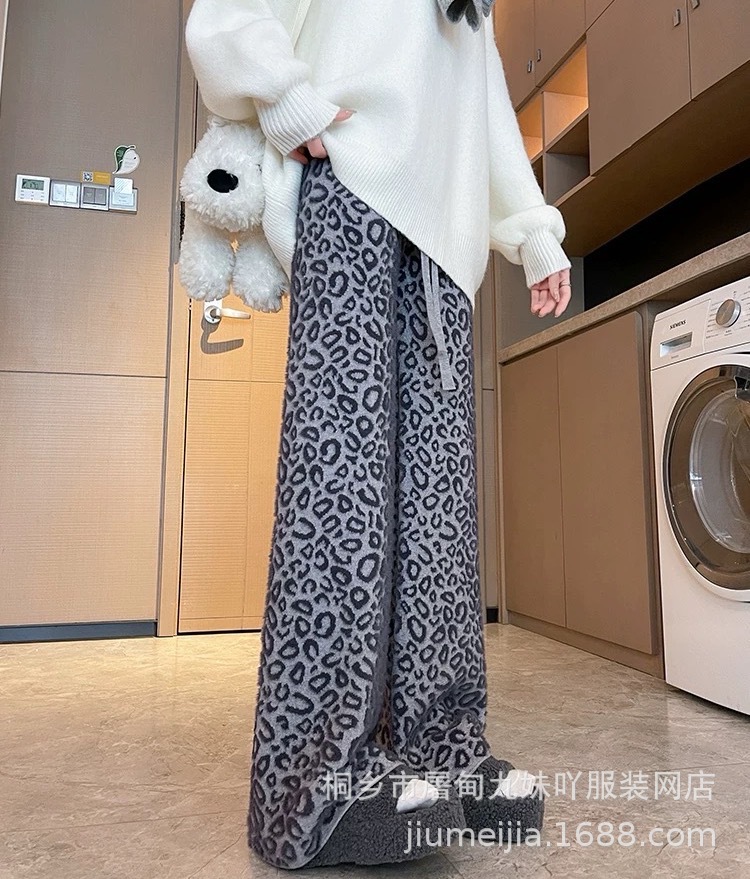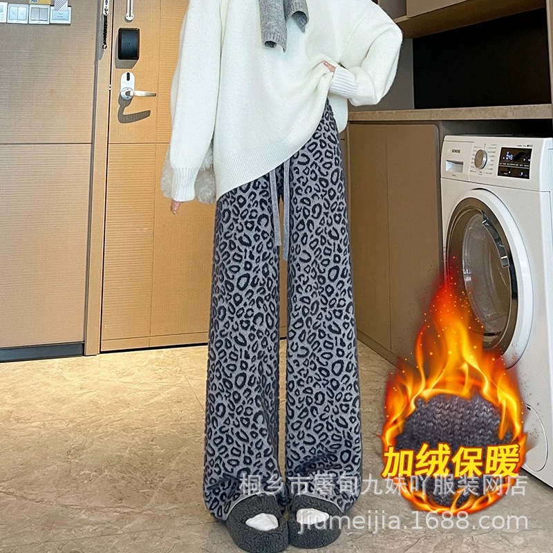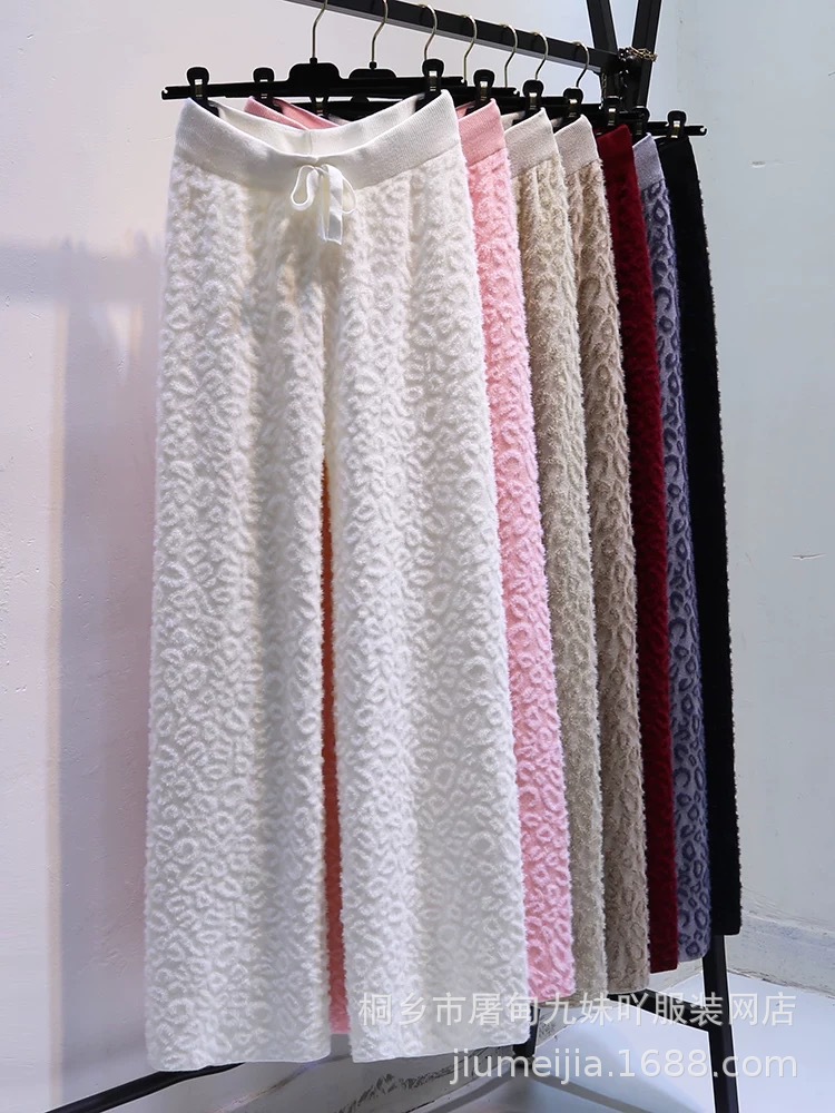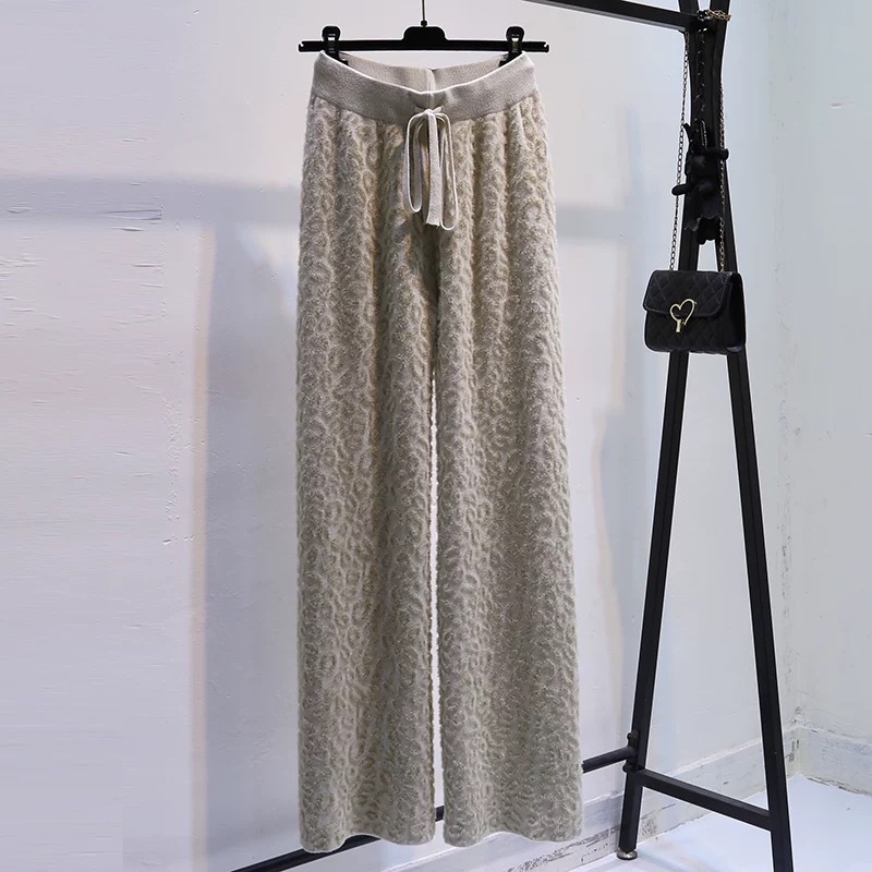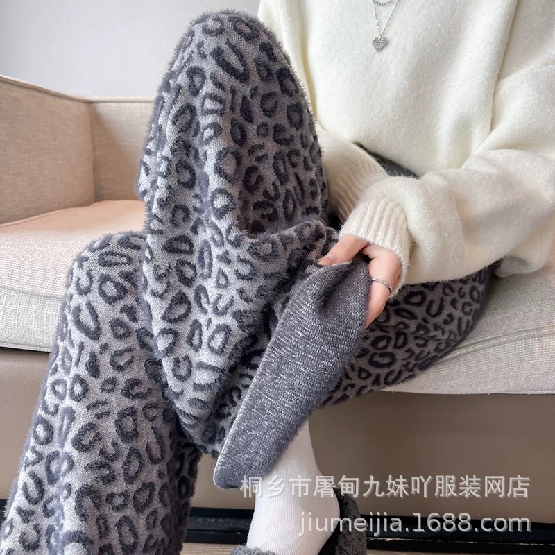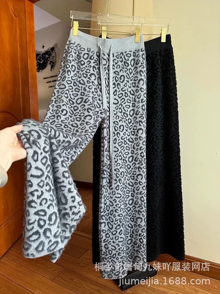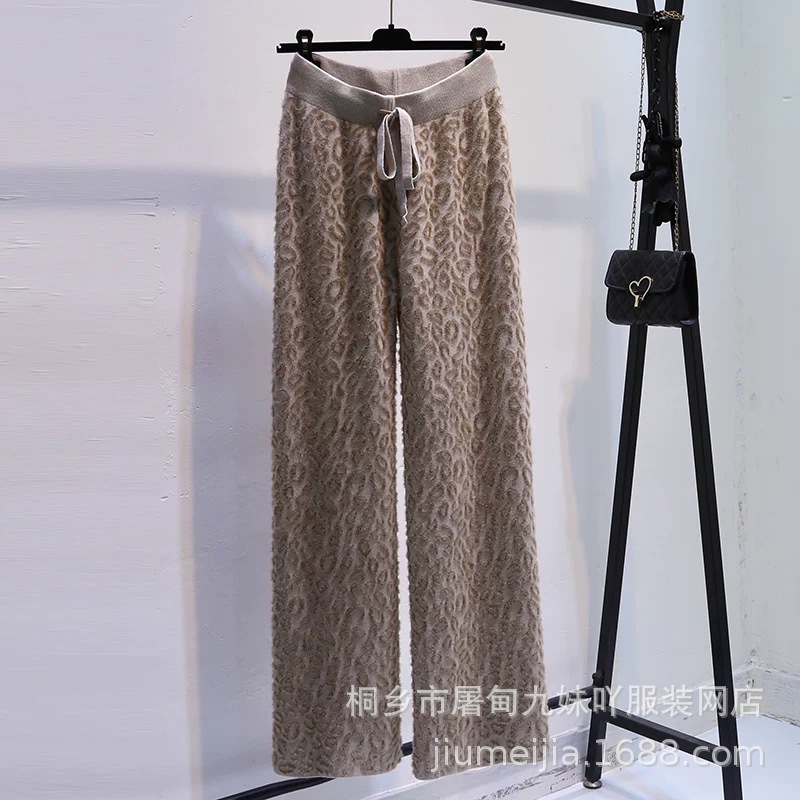 Вязаные широкие брюки с леопардовым принтом из искусственного норкового бархата для женщин, осень и зима 2025, новые утолщенные драпированные брюки длиной до пола с высокой талией, повседневные брюки