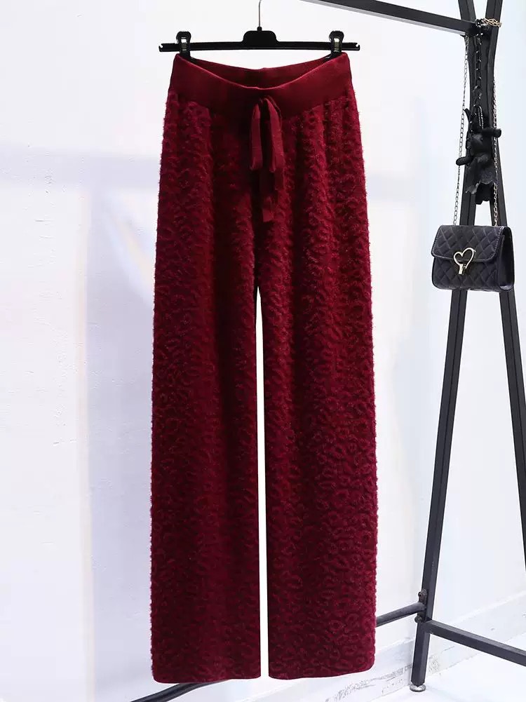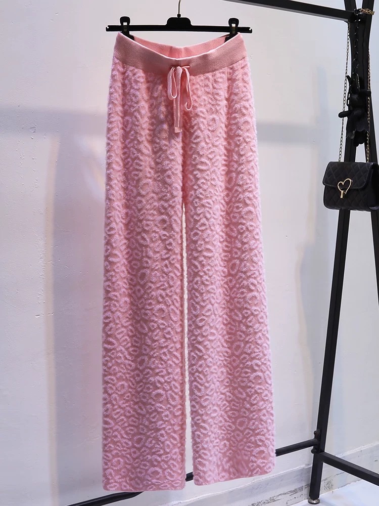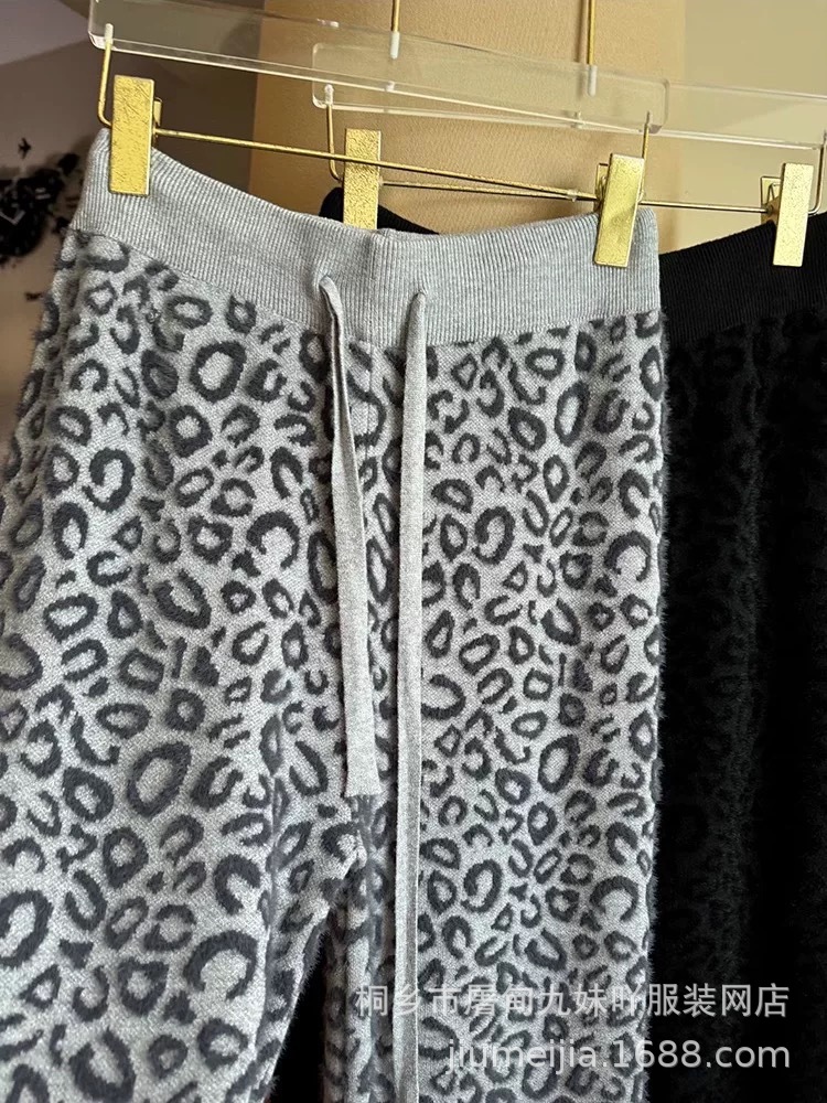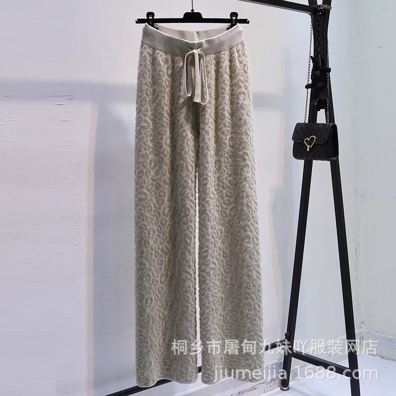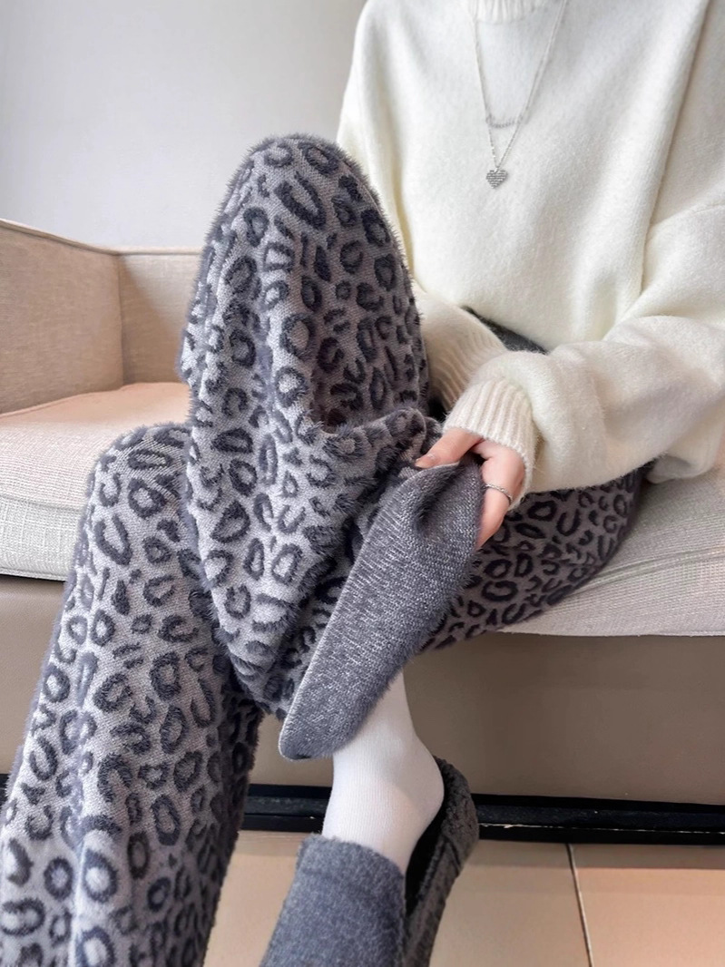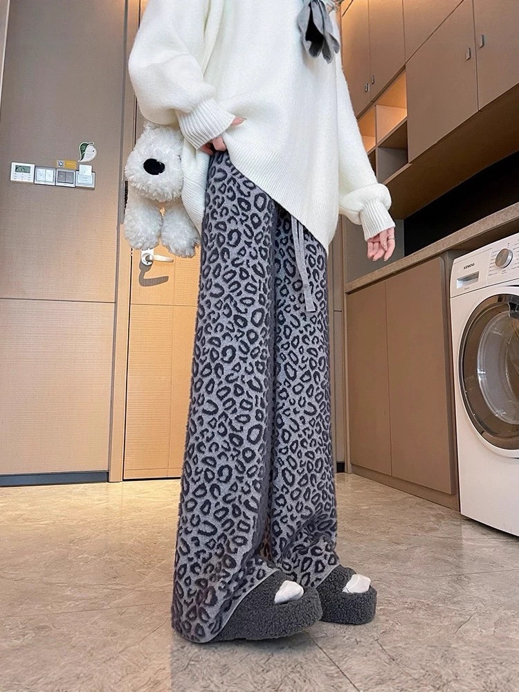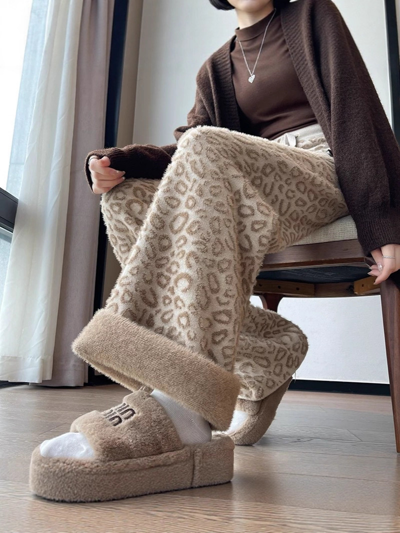 Вязаные широкие брюки с леопардовым принтом из искусственного норкового бархата для женщин, осень и зима 2025, новые утолщенные драпированные брюки длиной до пола с высокой талией, повседневные брюки