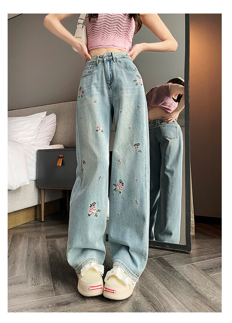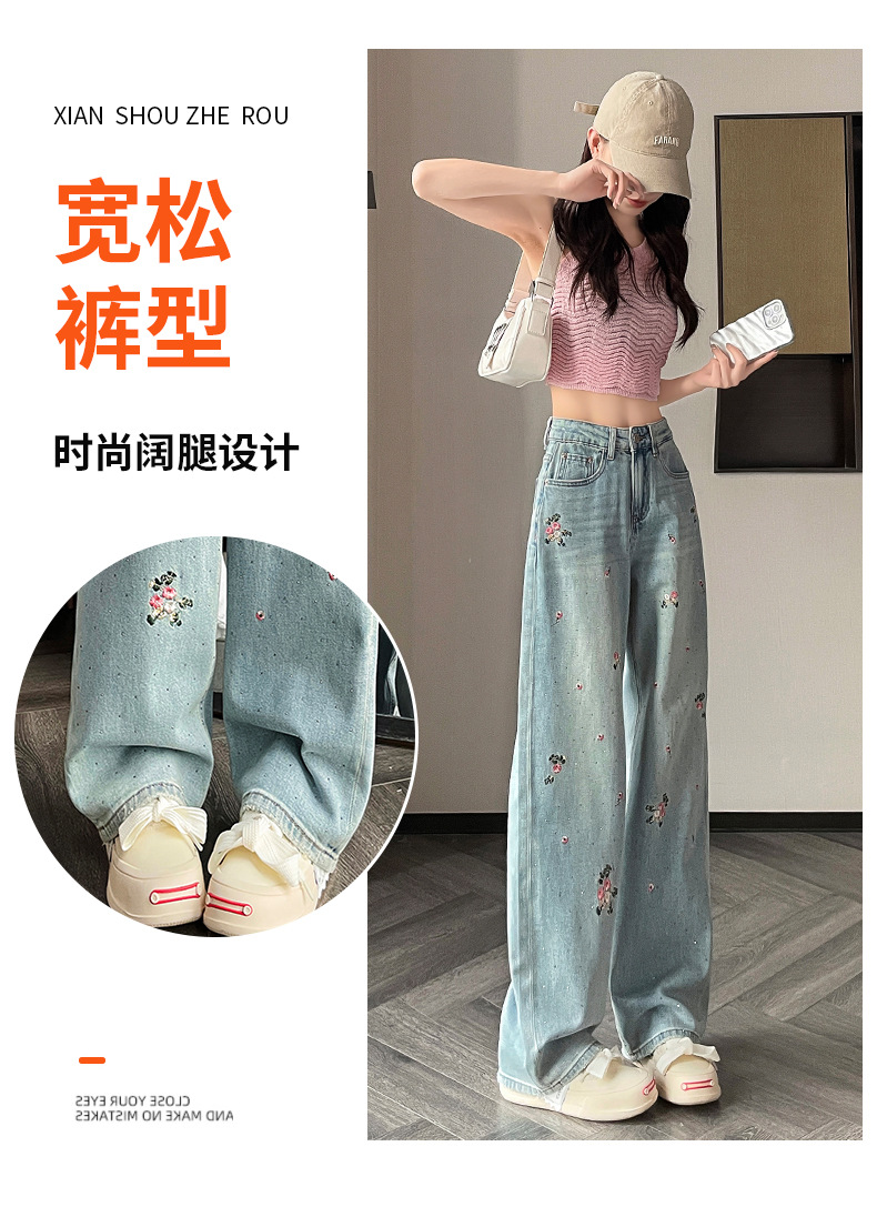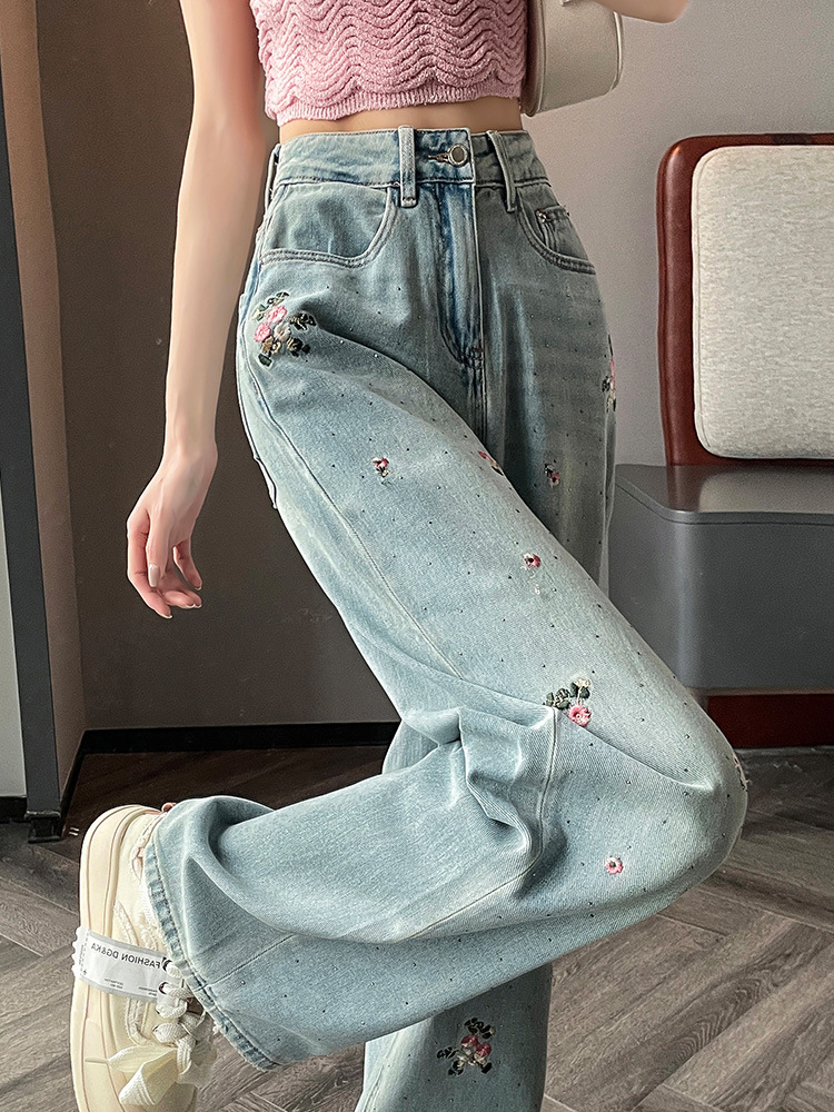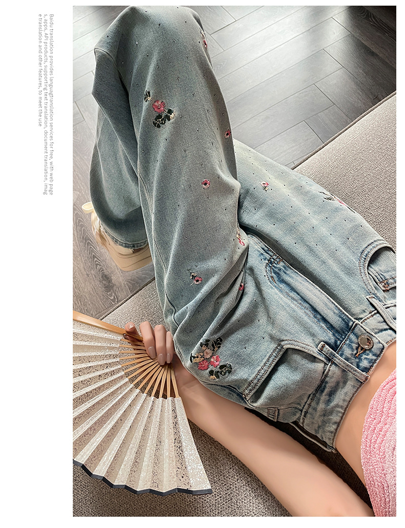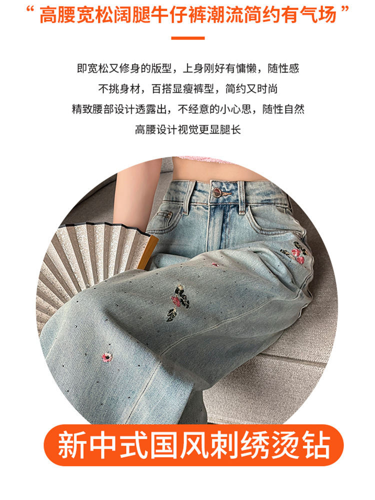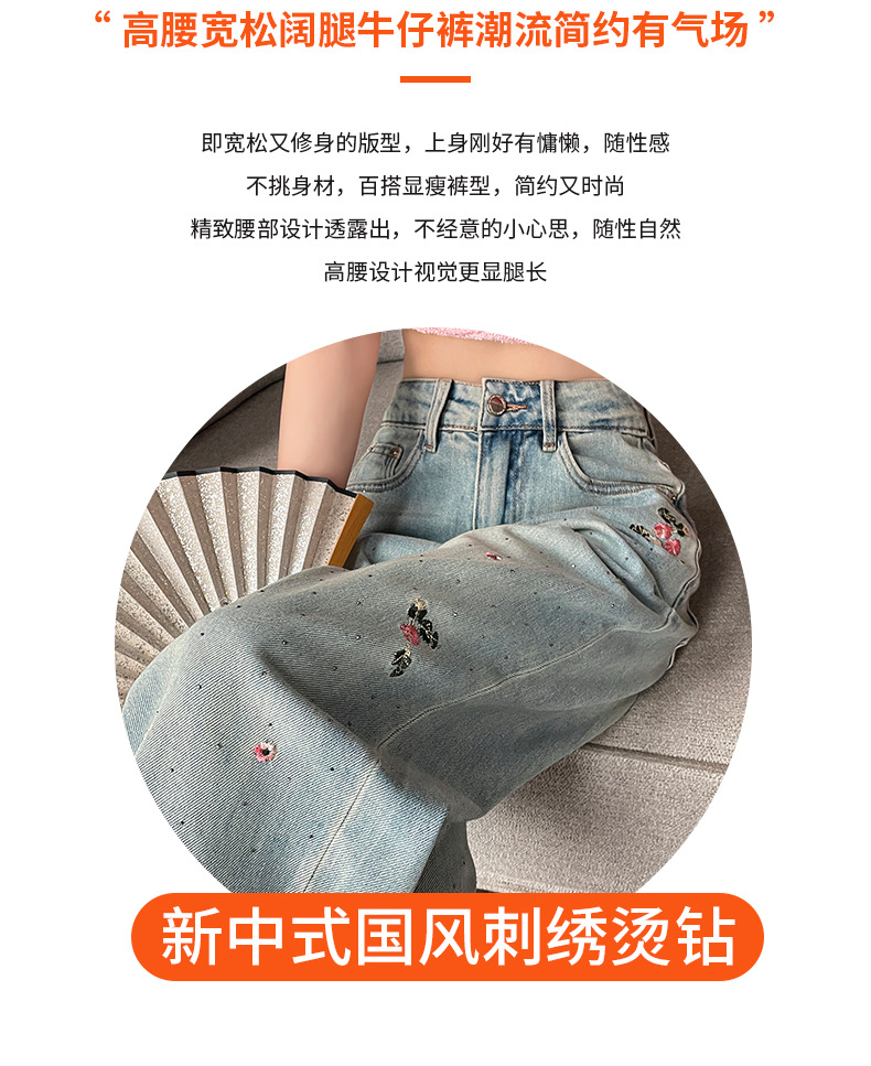 Новые широкие джинсы в китайском стиле с вышивкой и стразами для женщин, лето 2025, свободные узкие брюки длиной до пола с вышивкой