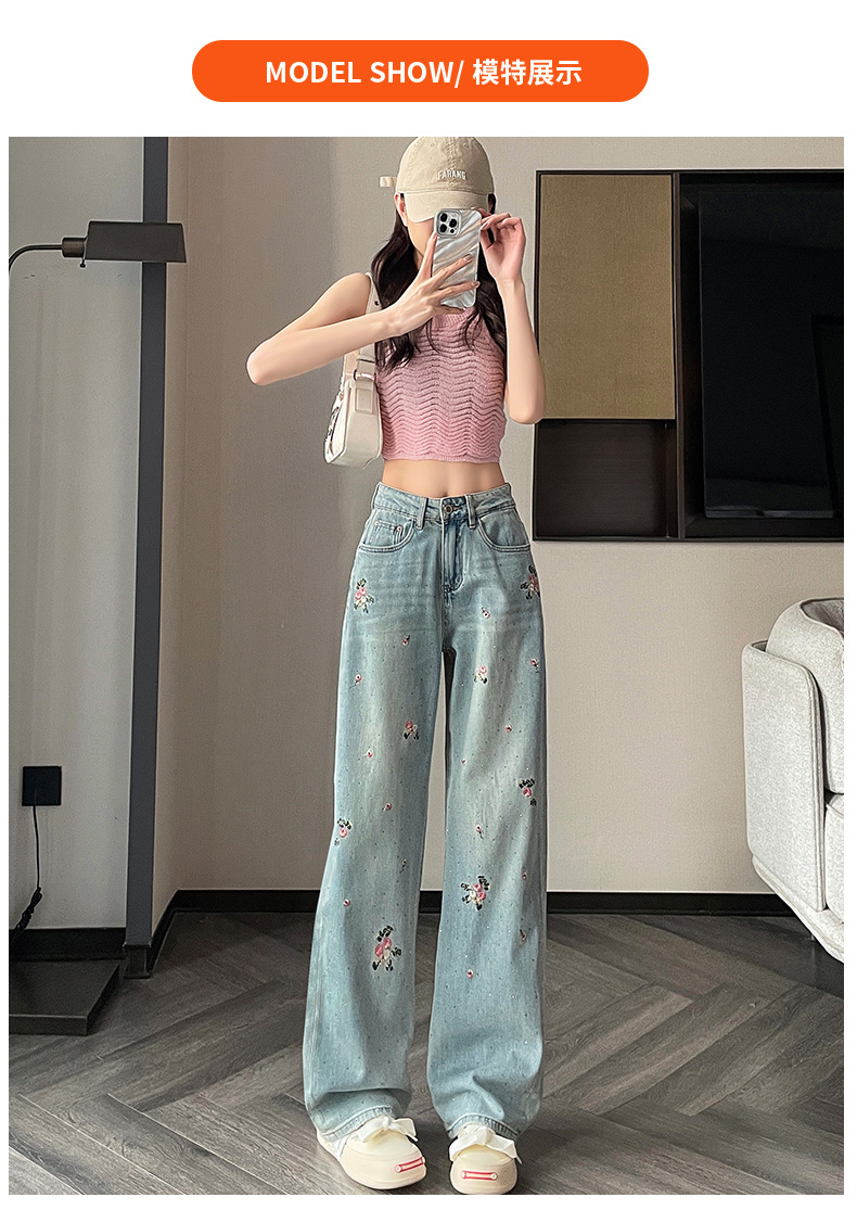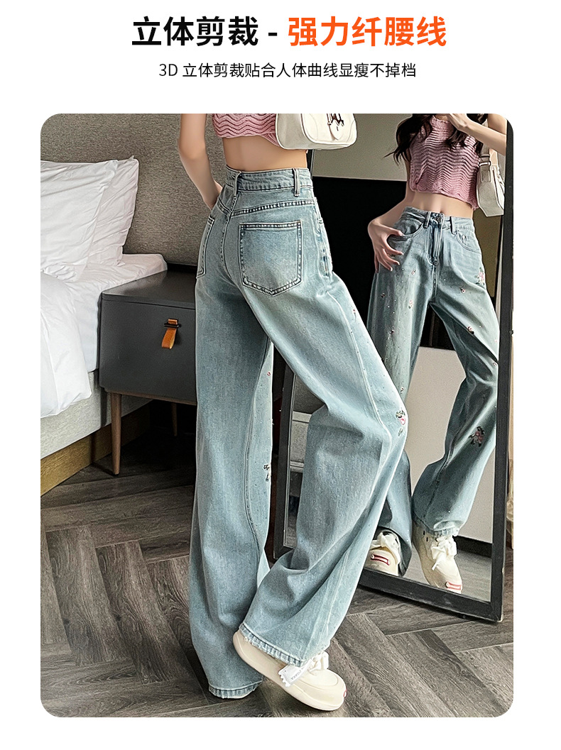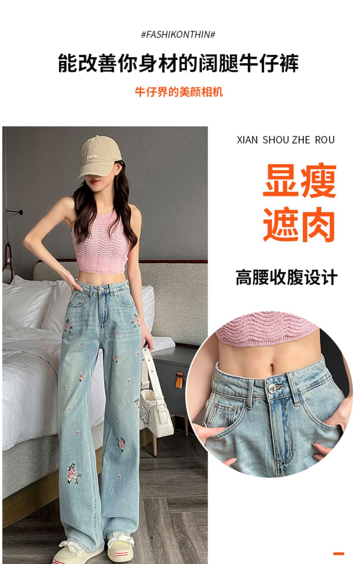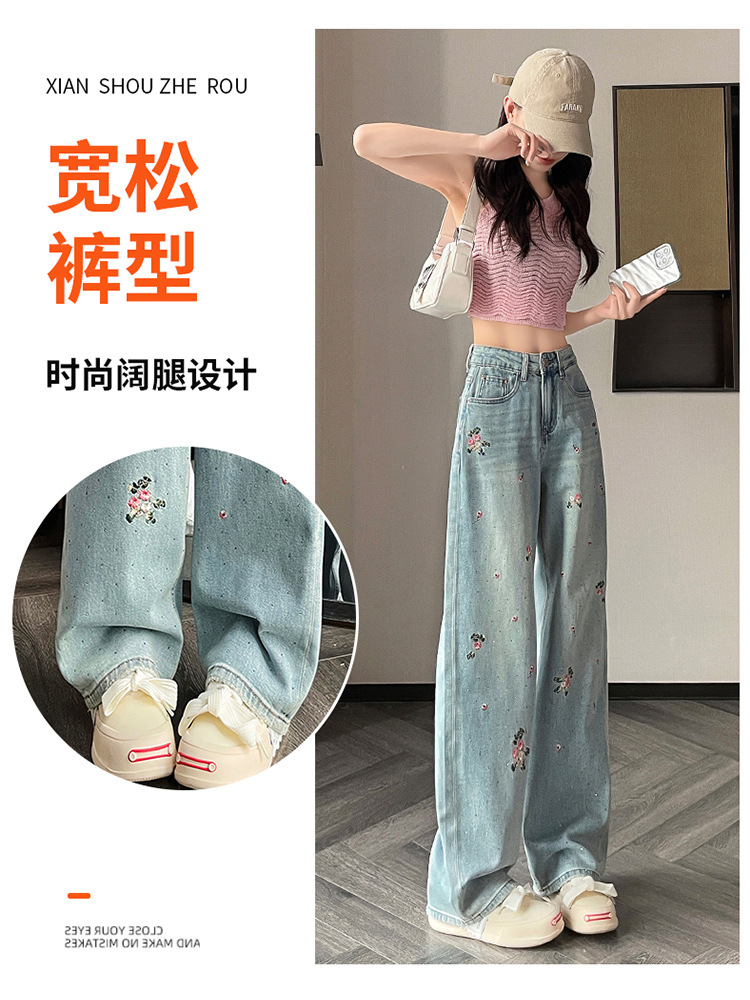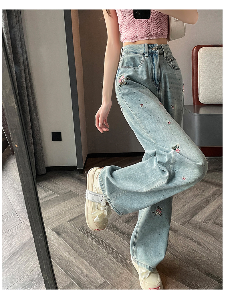 Новые широкие джинсы в китайском стиле с вышивкой и стразами для женщин, лето 2025, свободные узкие брюки длиной до пола с вышивкой