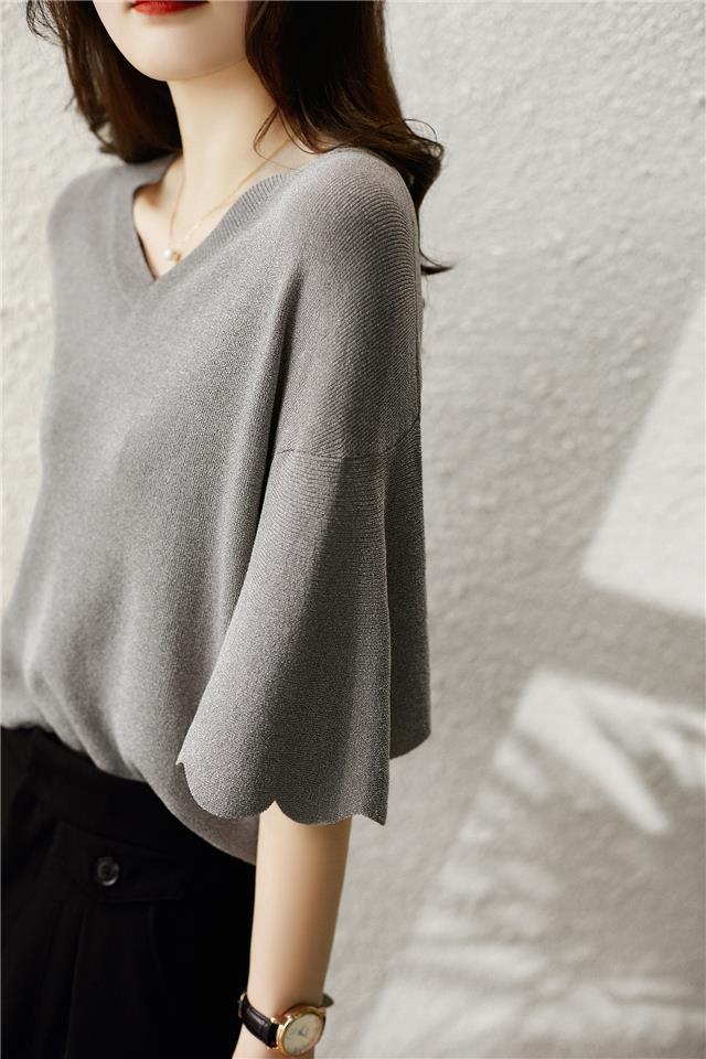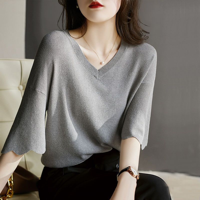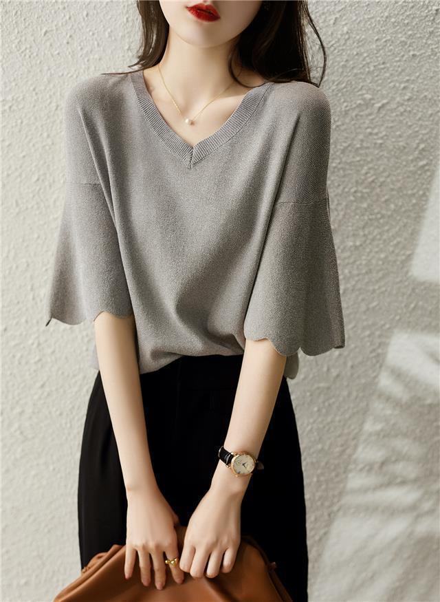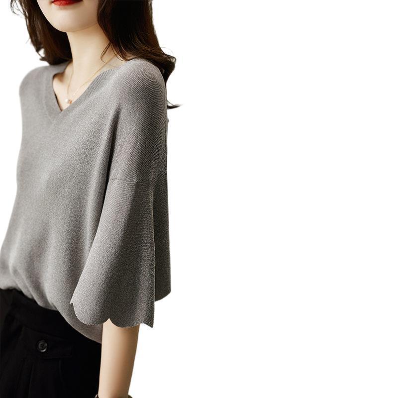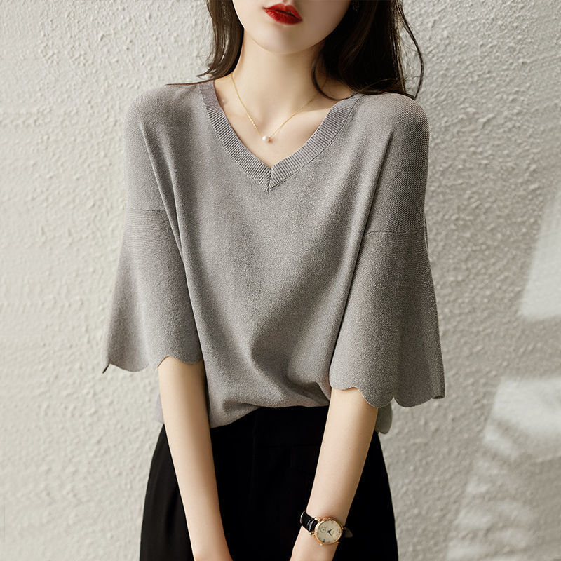 Женская трикотажная рубашка из ледяного шелка в твидовом стиле с v-образным вырезом и короткими рукавами, лето 2025, универсальная свободная футболка с колокольчатыми рукавами, тонкий топ