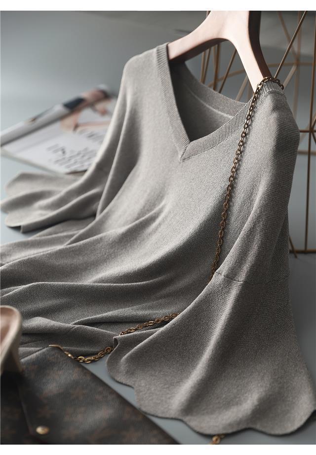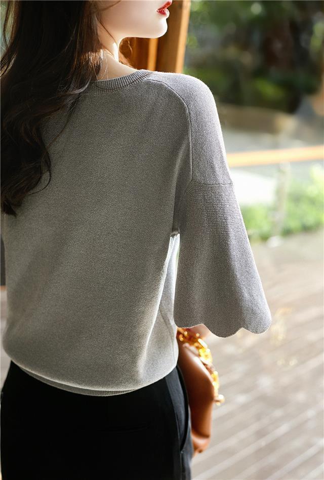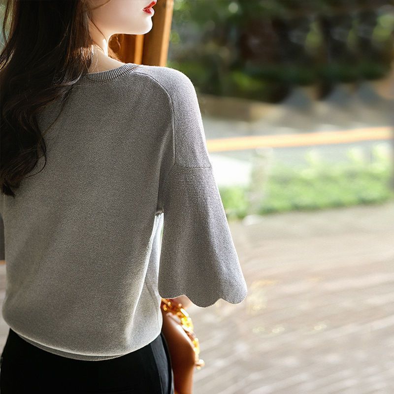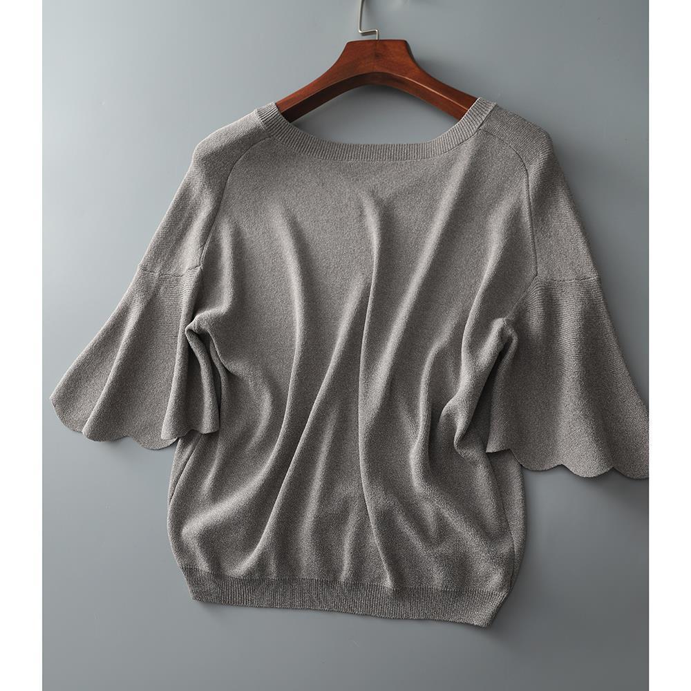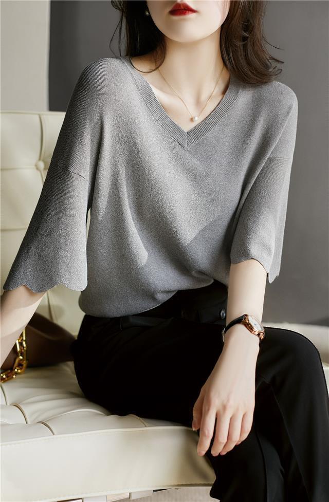 Женская трикотажная рубашка из ледяного шелка в твидовом стиле с v-образным вырезом и короткими рукавами, лето 2025, универсальная свободная футболка с колокольчатыми рукавами, тонкий топ