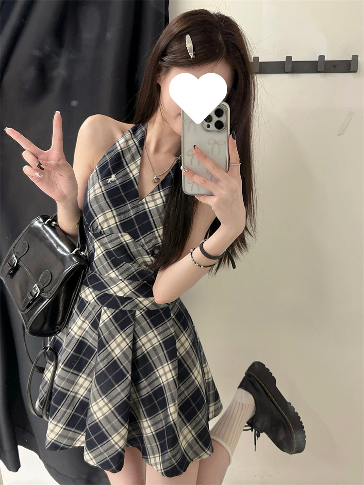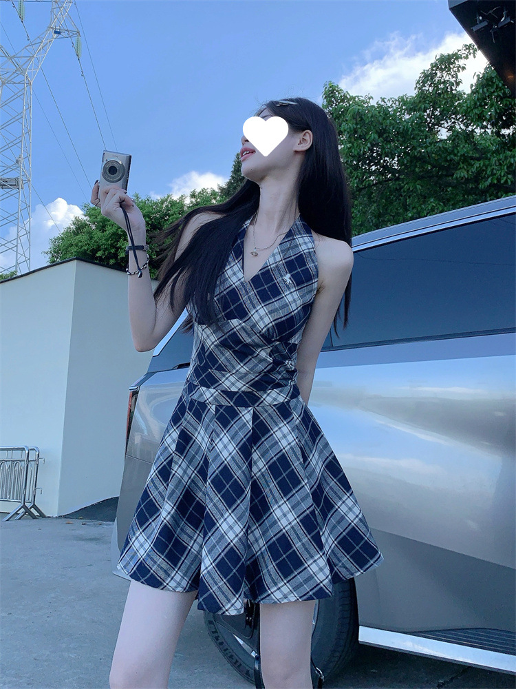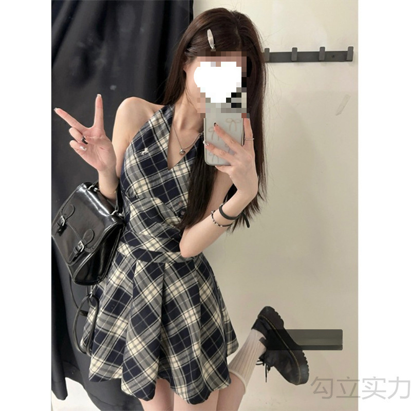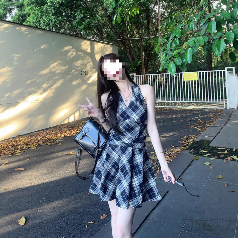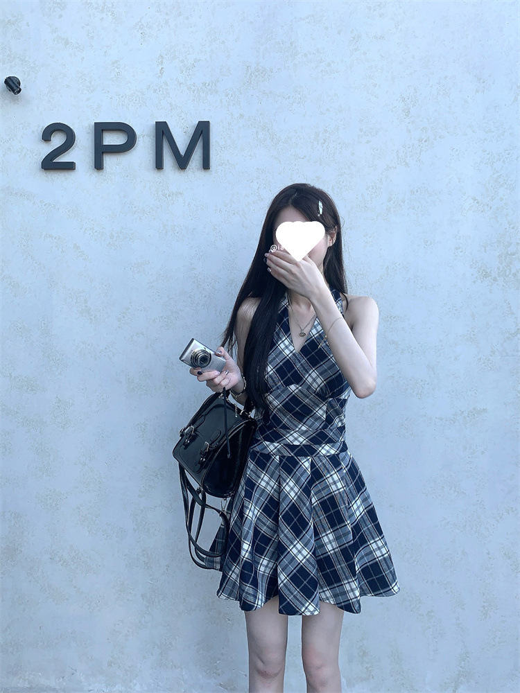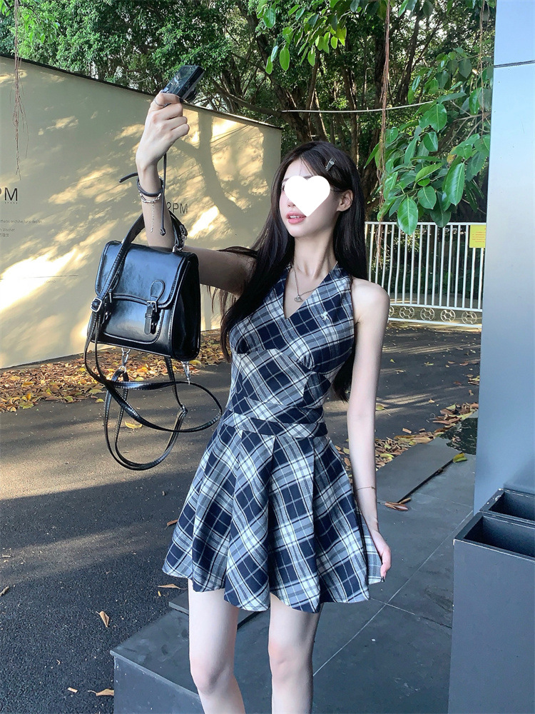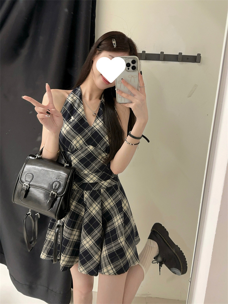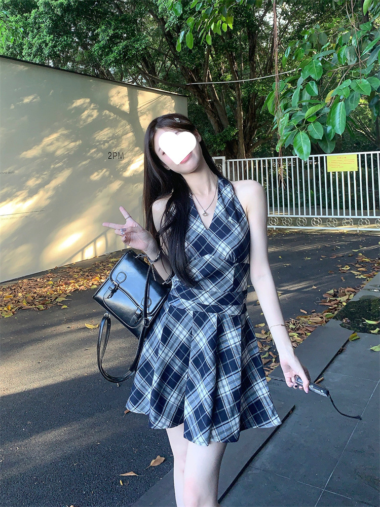 黑白格子v领挂脖系带连衣裙女夏季2025新款甜辣妹收腰百褶A字短裙