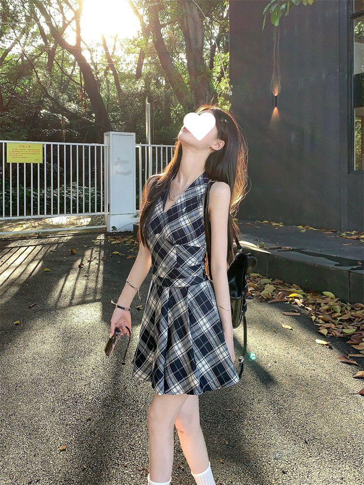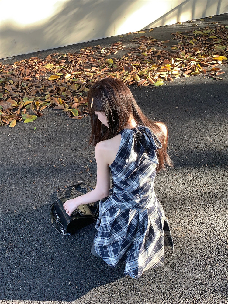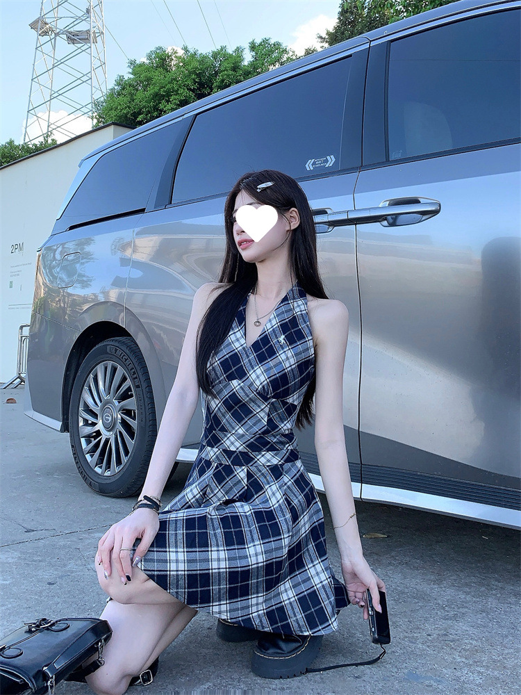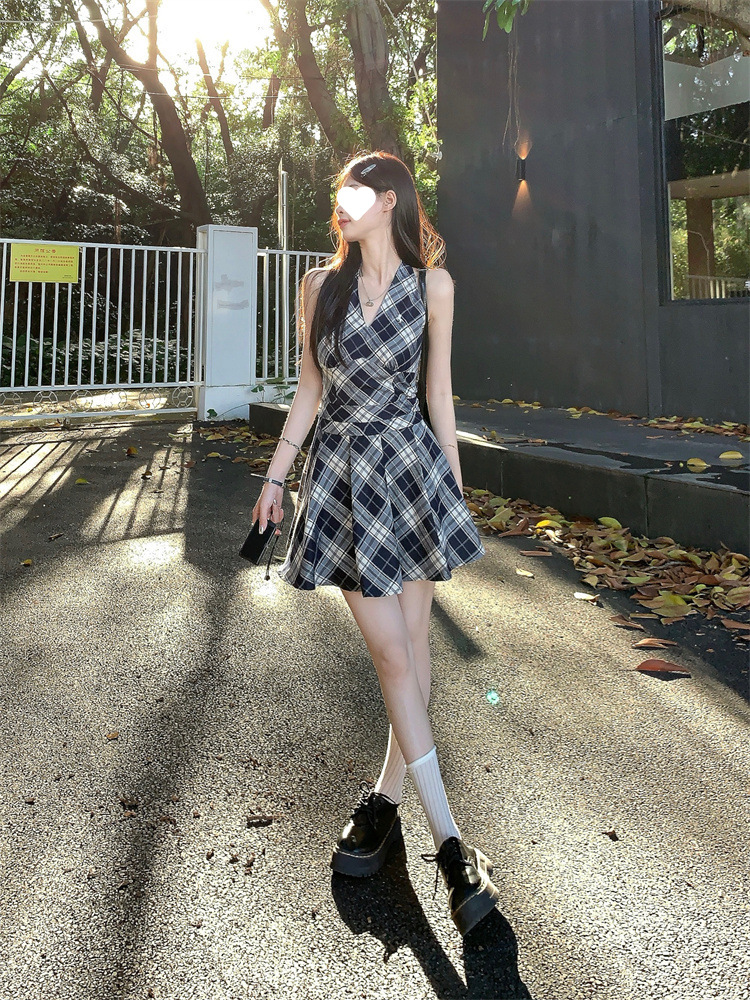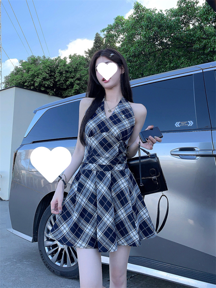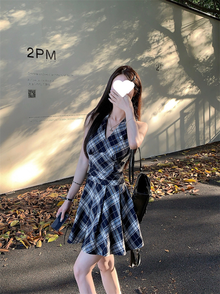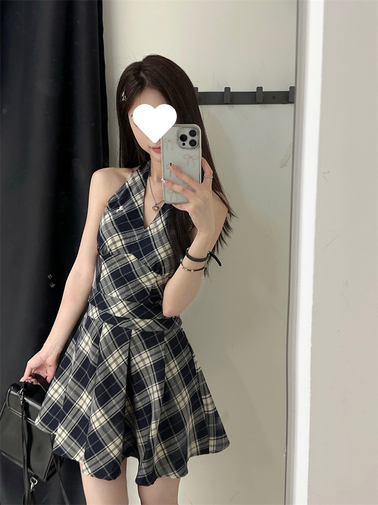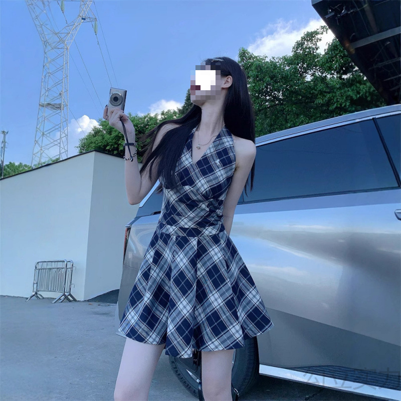 黑白格子v领挂脖系带连衣裙女夏季2025新款甜辣妹收腰百褶A字短裙