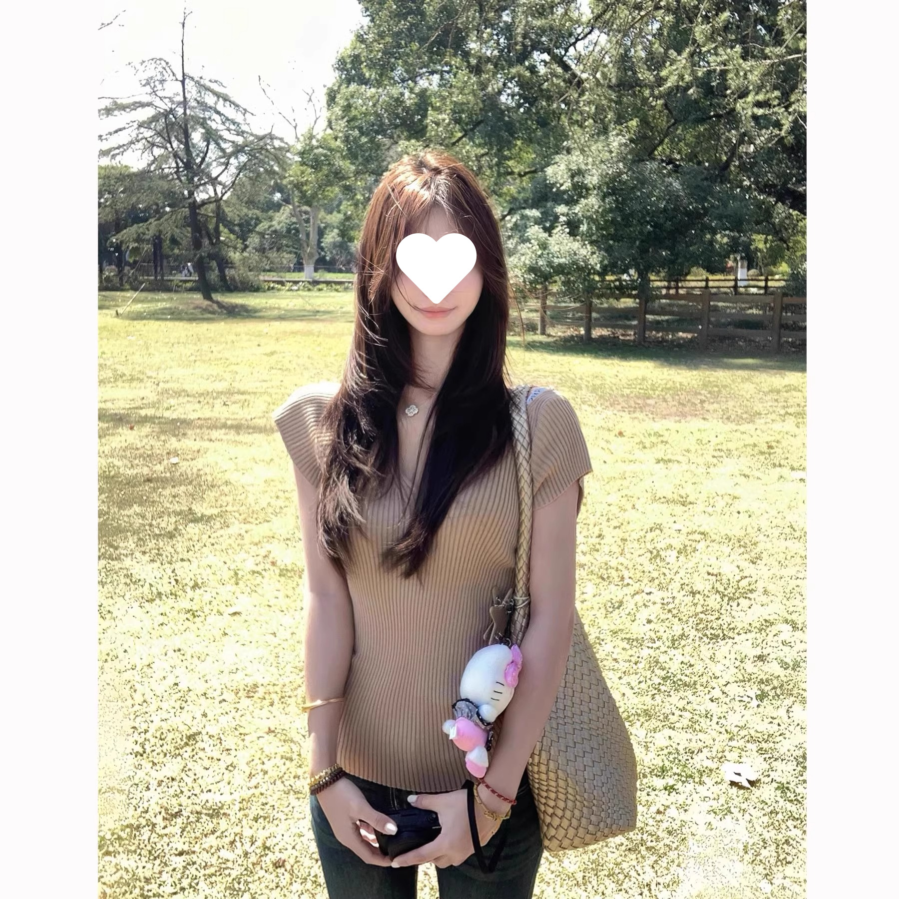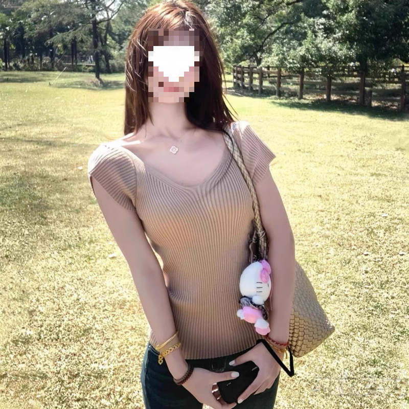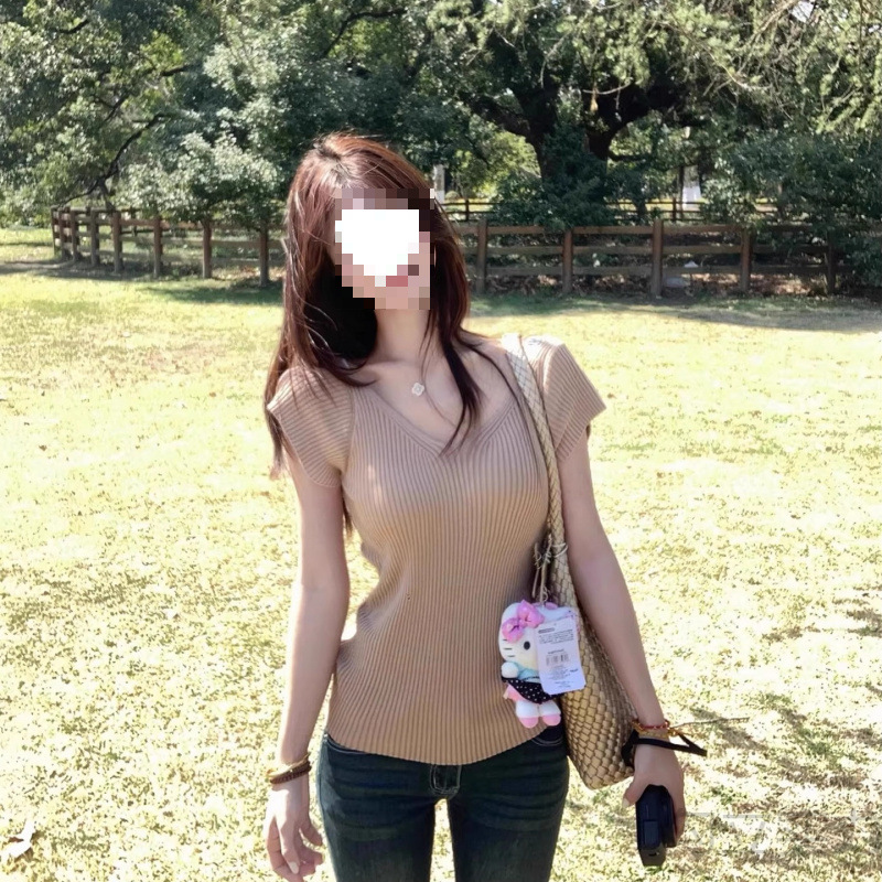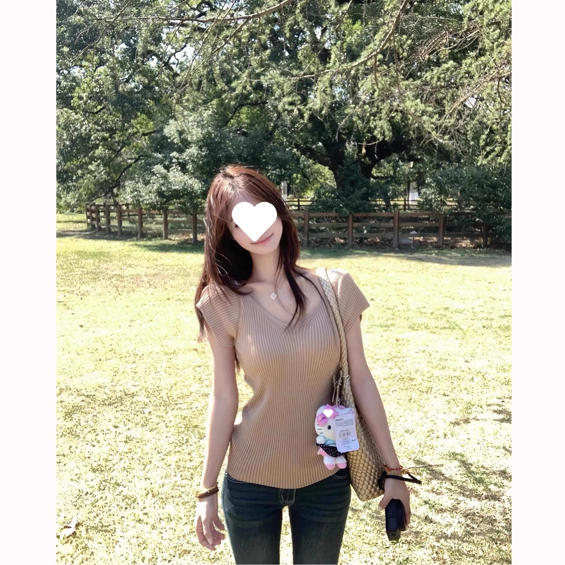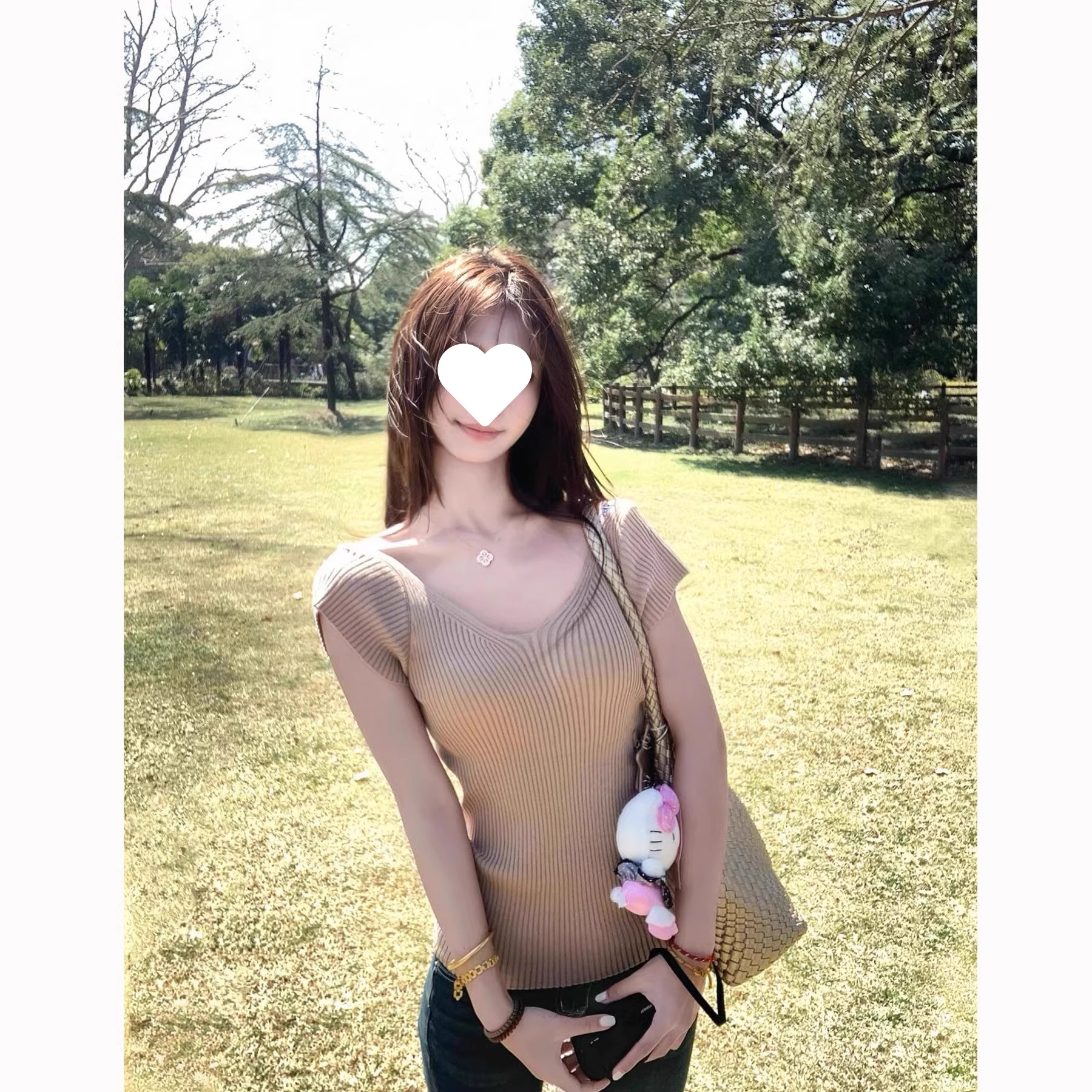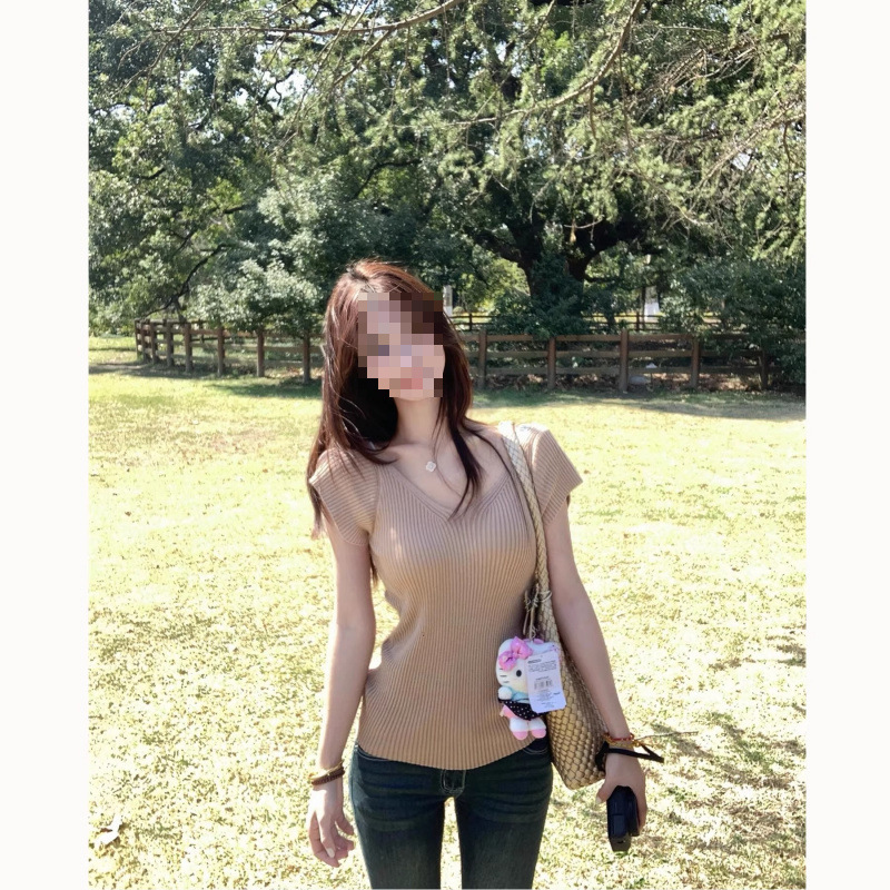 小飞袖冰丝短袖针织衫女T恤2025夏季新款韩系V领修身显瘦薄上衣