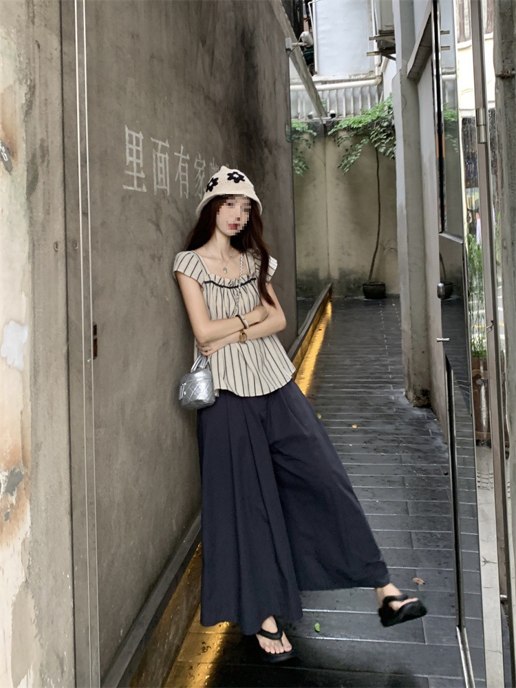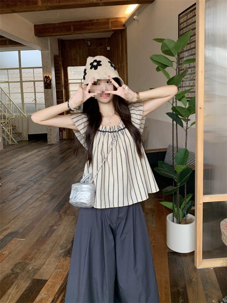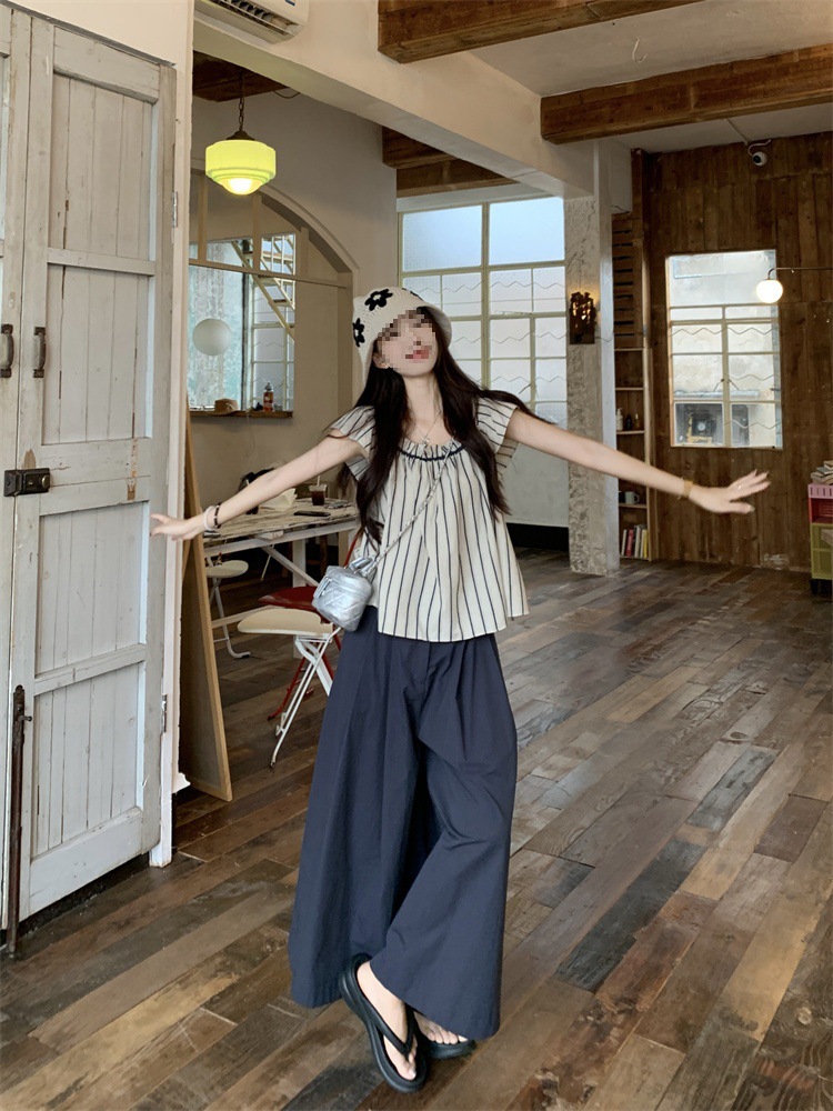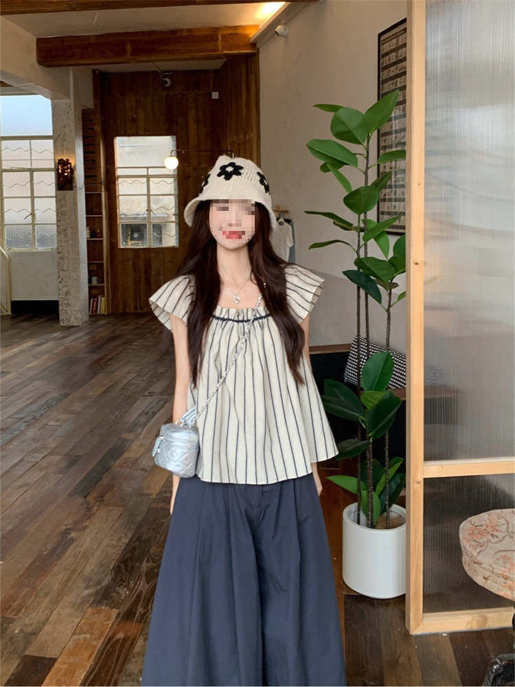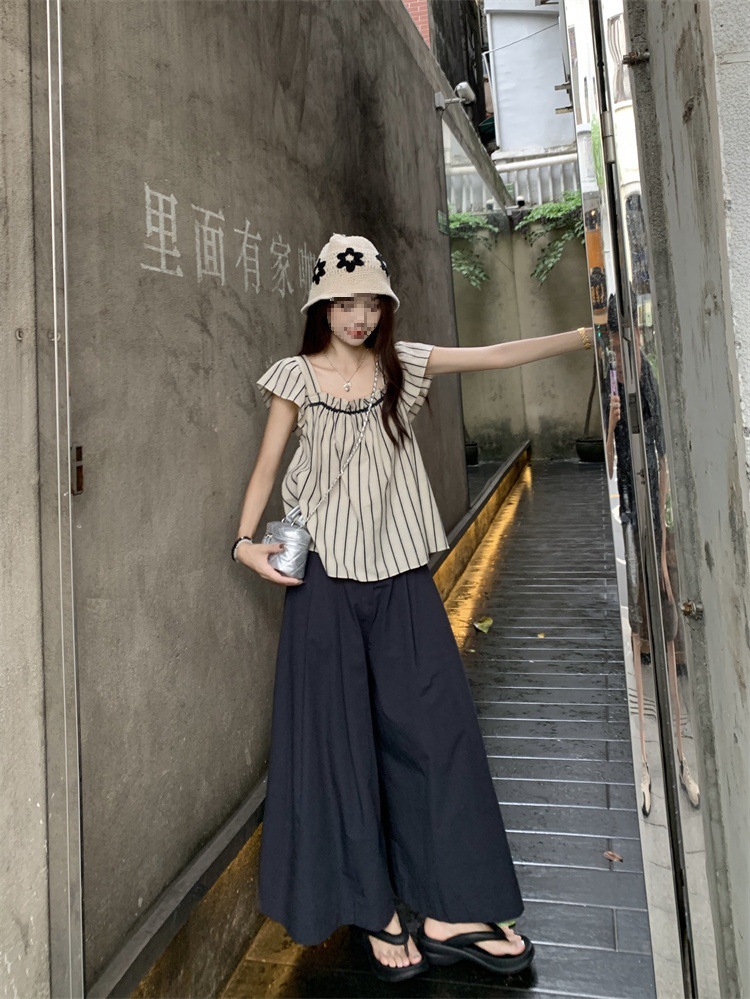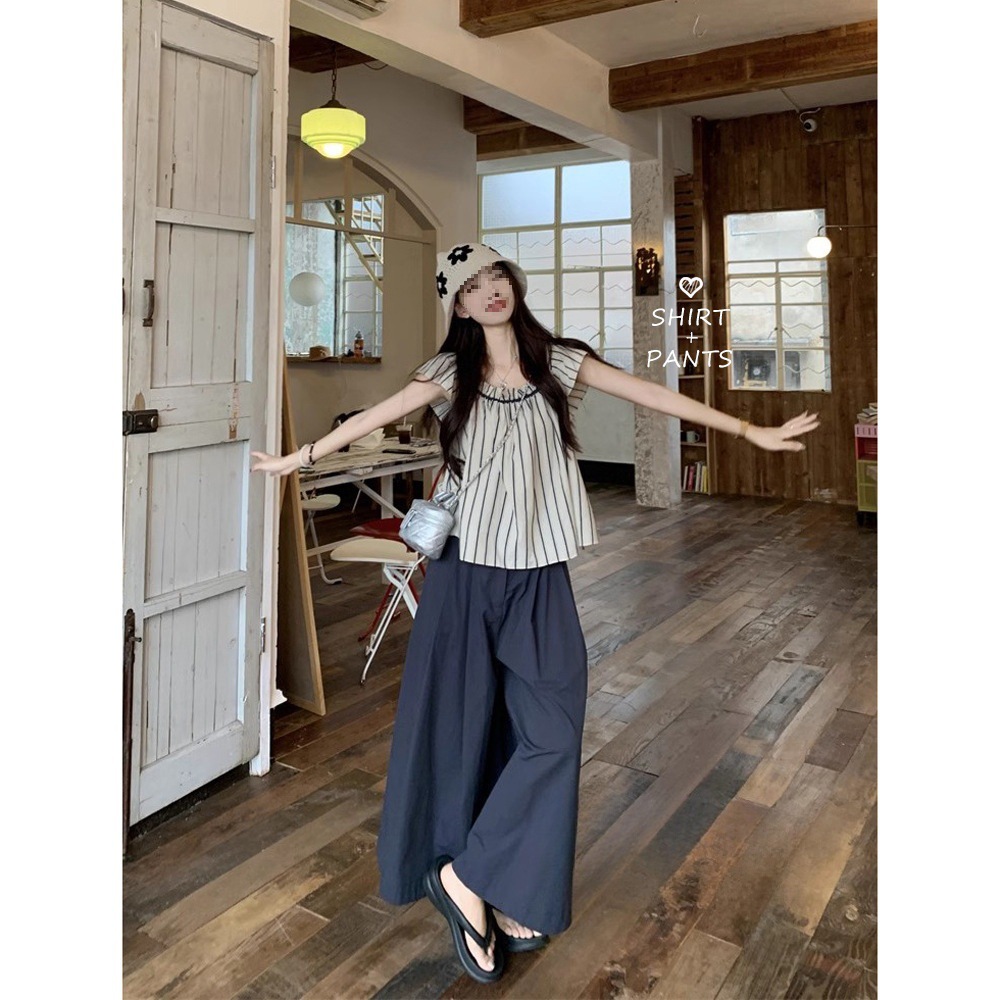 Сладкий полосатый утягивающий топ с маленькими рукавами-крылышками, женская летняя новая свободная высокая талия, широкие брюки, модный комплект