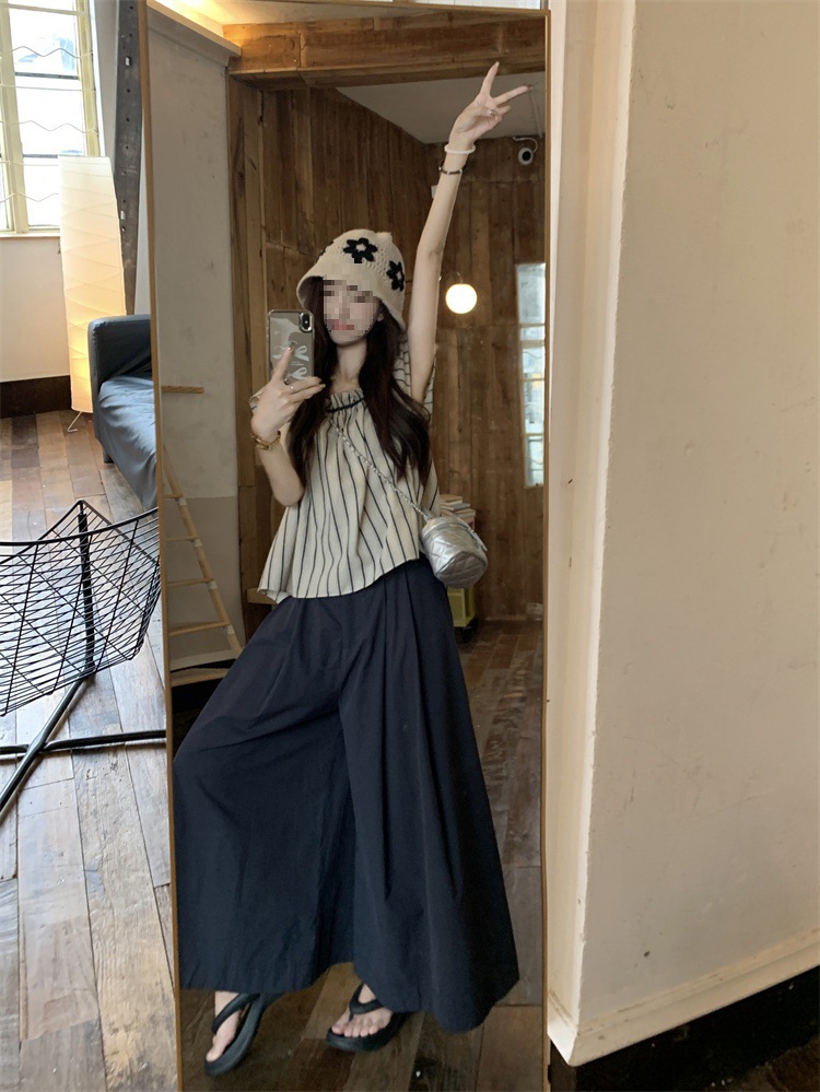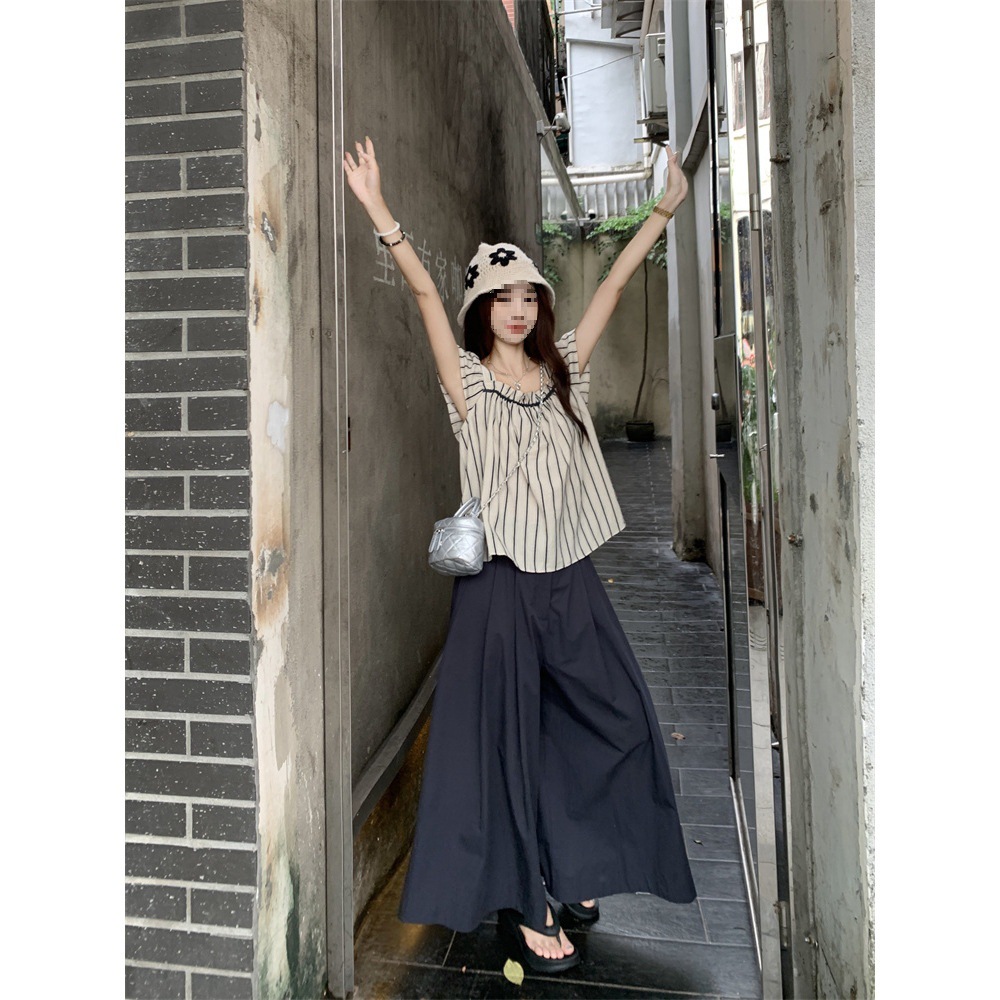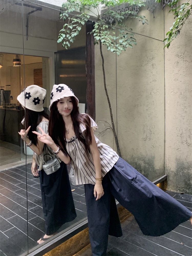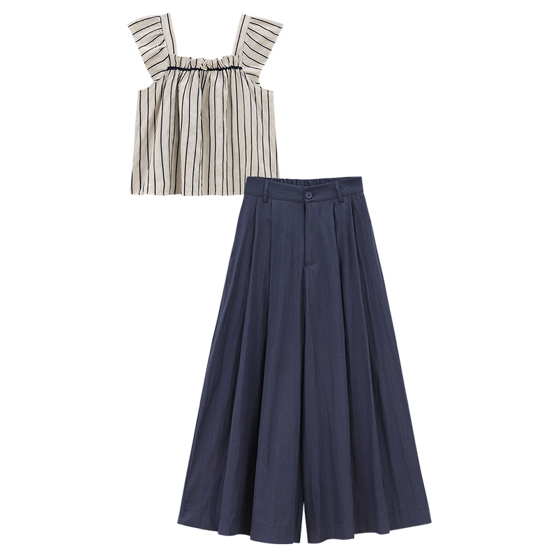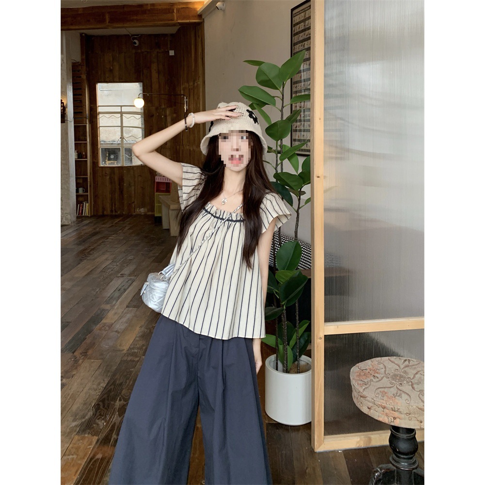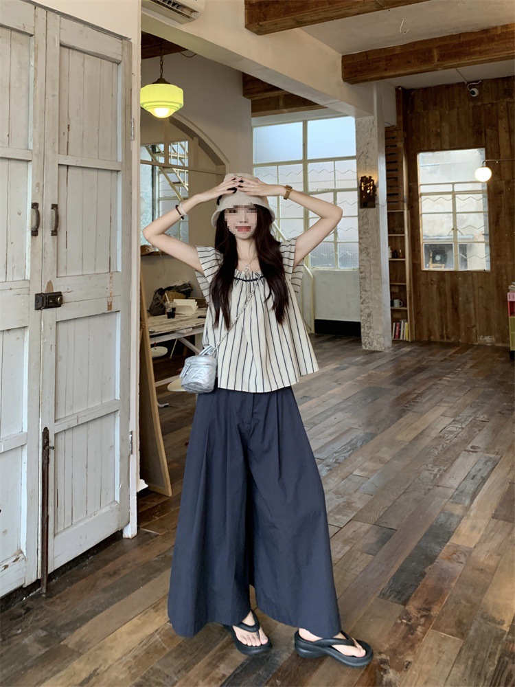Сладкий полосатый утягивающий топ с маленькими рукавами-крылышками, женская летняя новая свободная высокая талия, широкие брюки, модный комплект