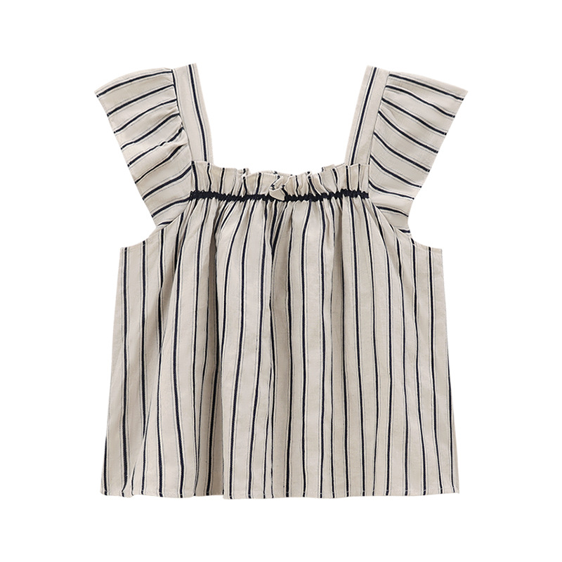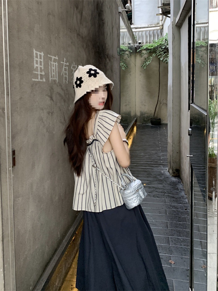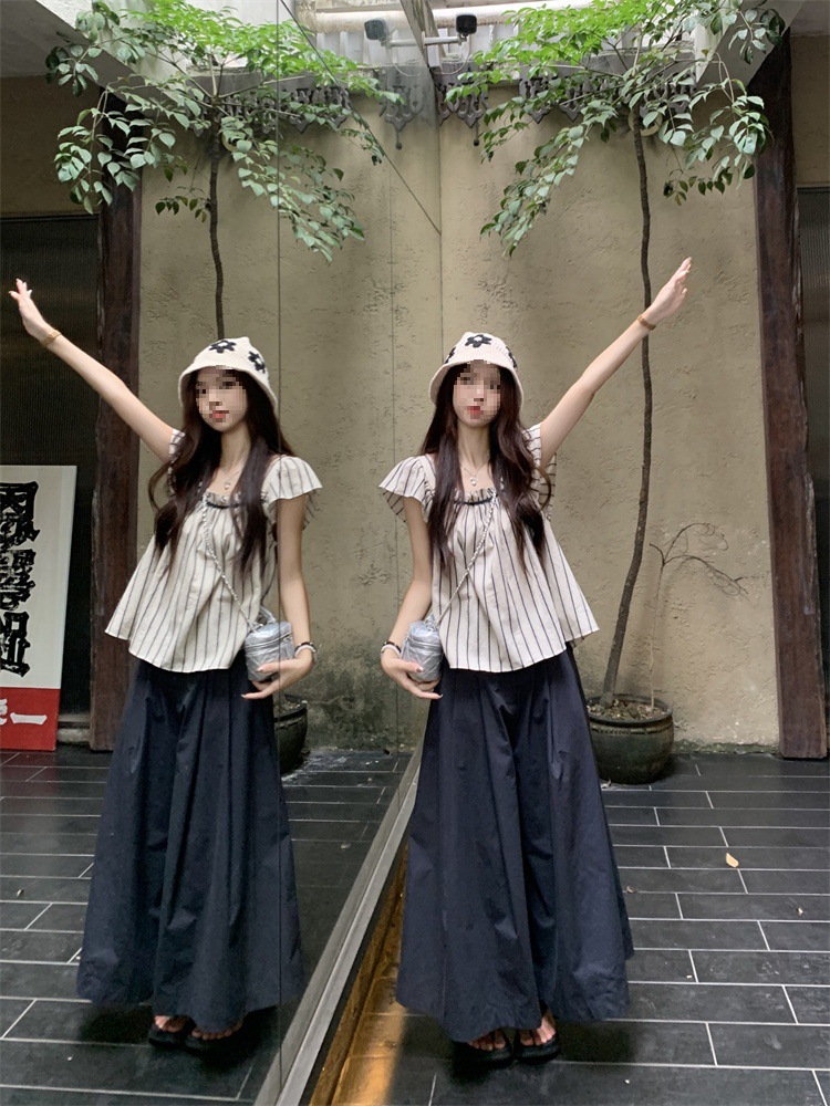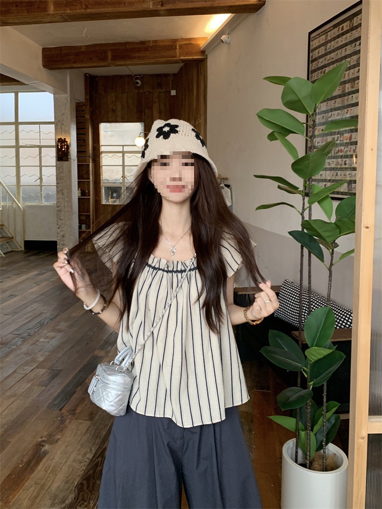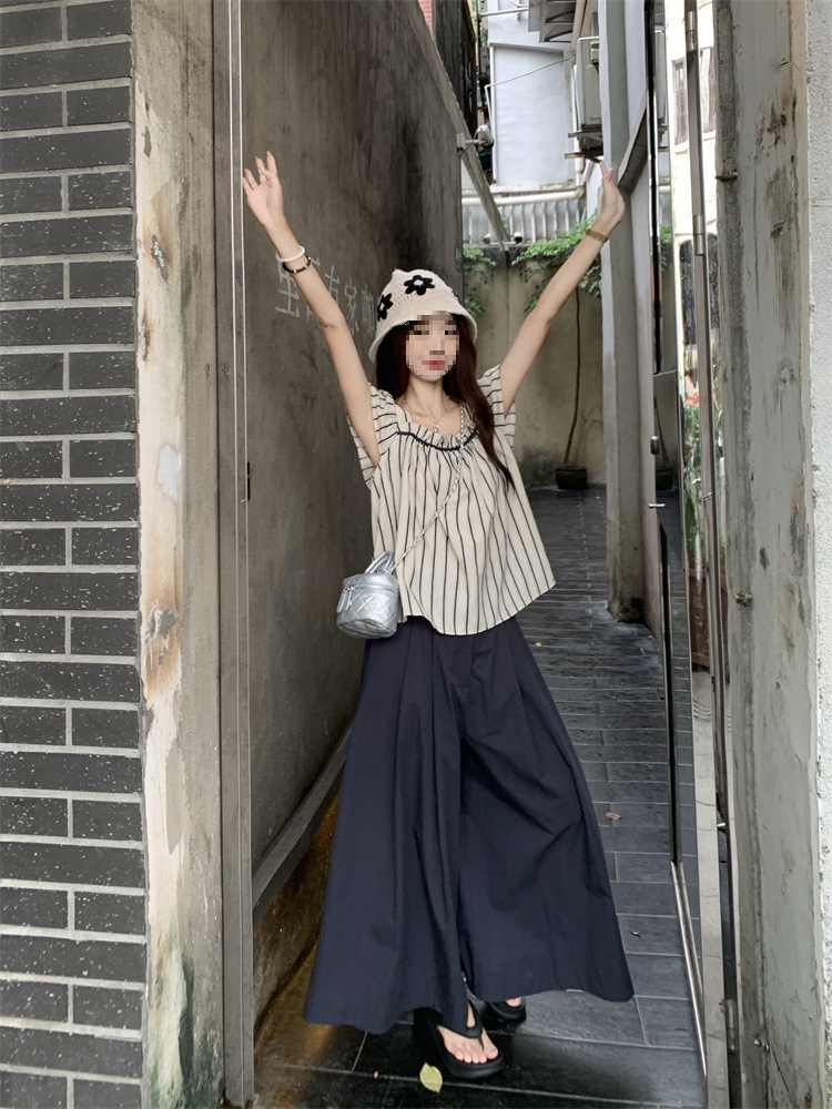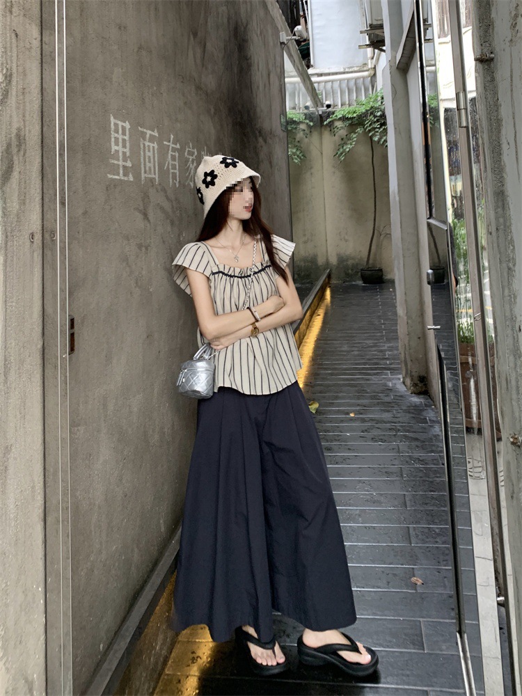 Сладкий полосатый утягивающий топ с маленькими рукавами-крылышками, женская летняя новая свободная высокая талия, широкие брюки, модный комплект