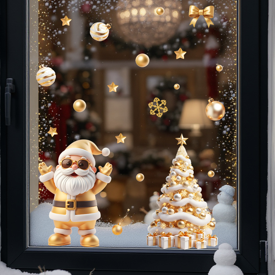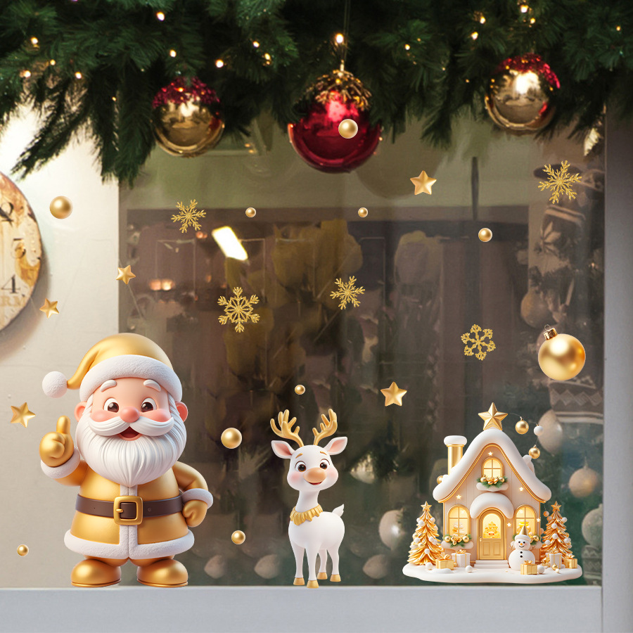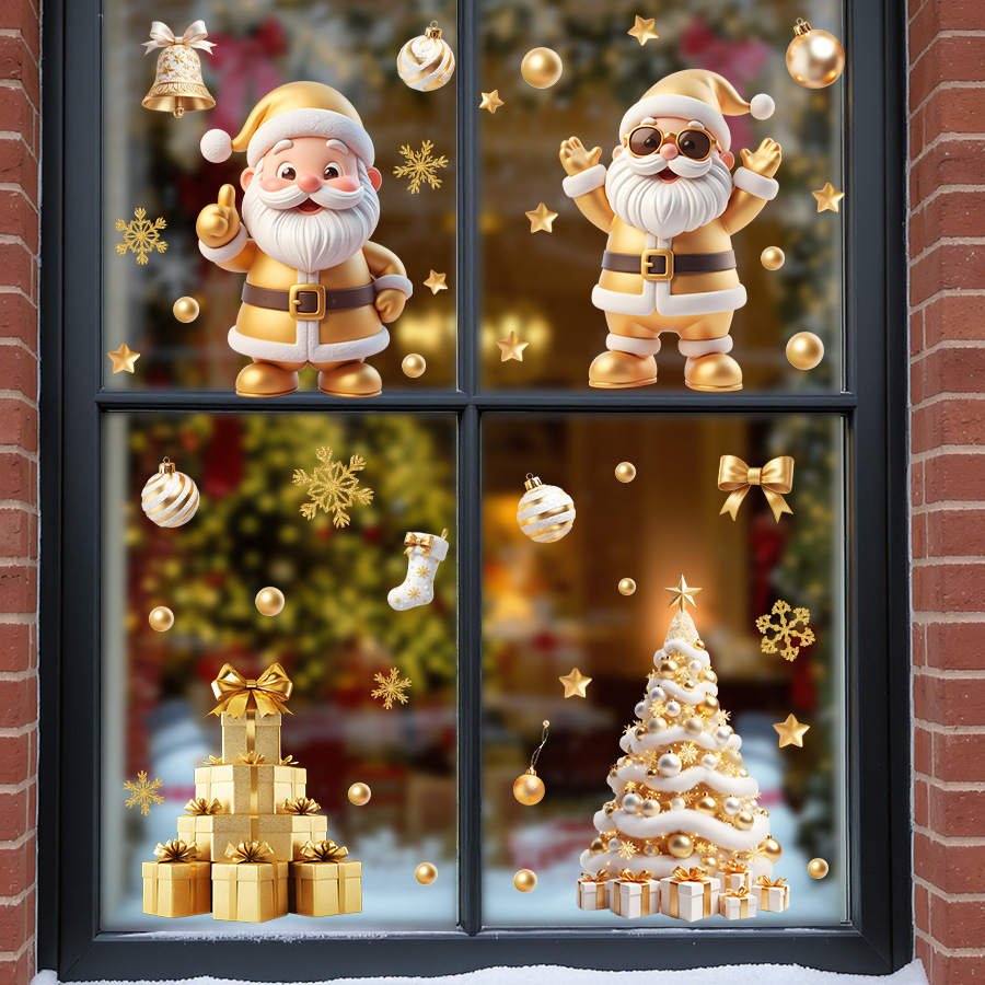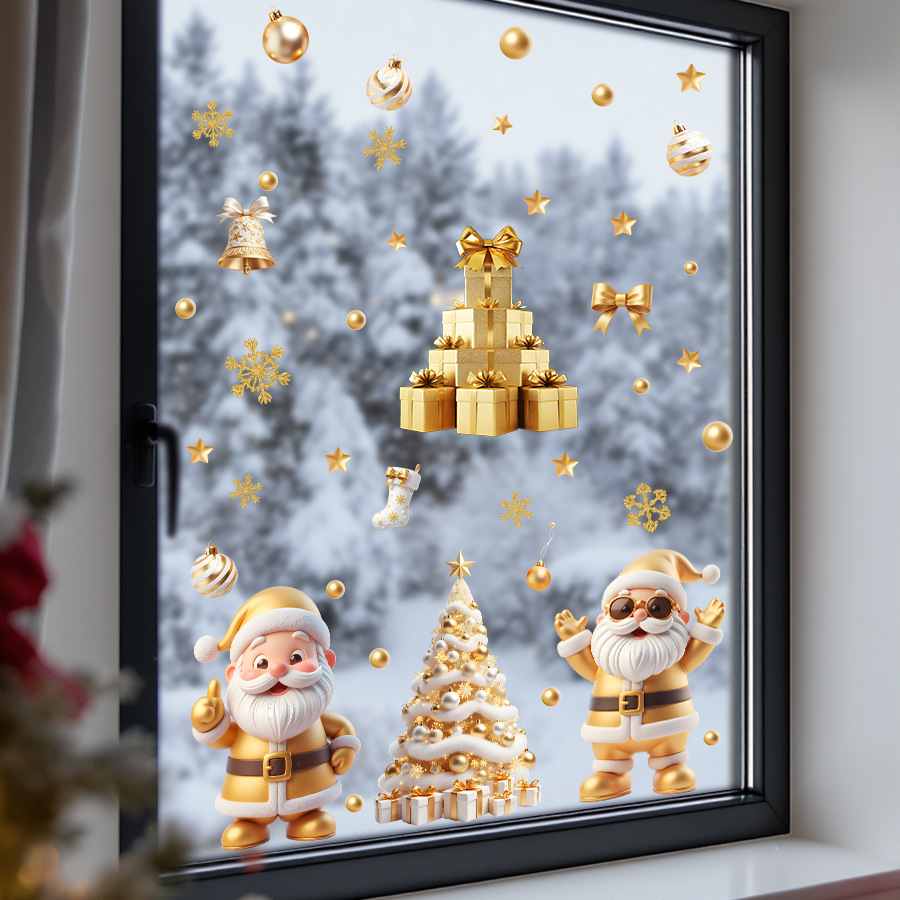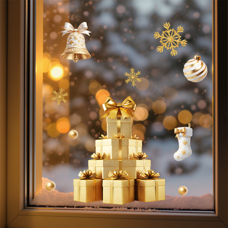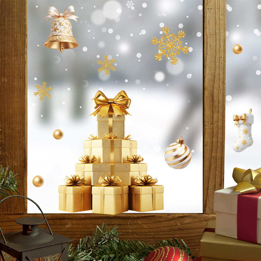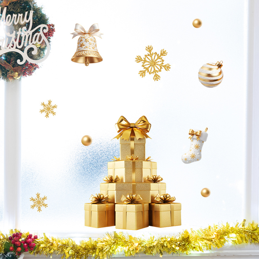 圣诞节金色轻奢静电窗贴铃铛雪花水晶球圣诞老人节日装饰窗贴纸