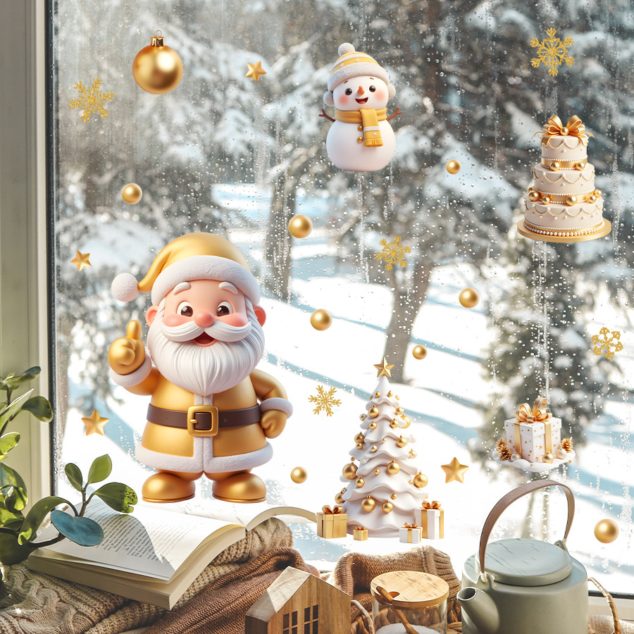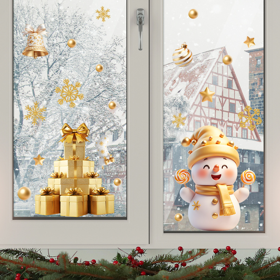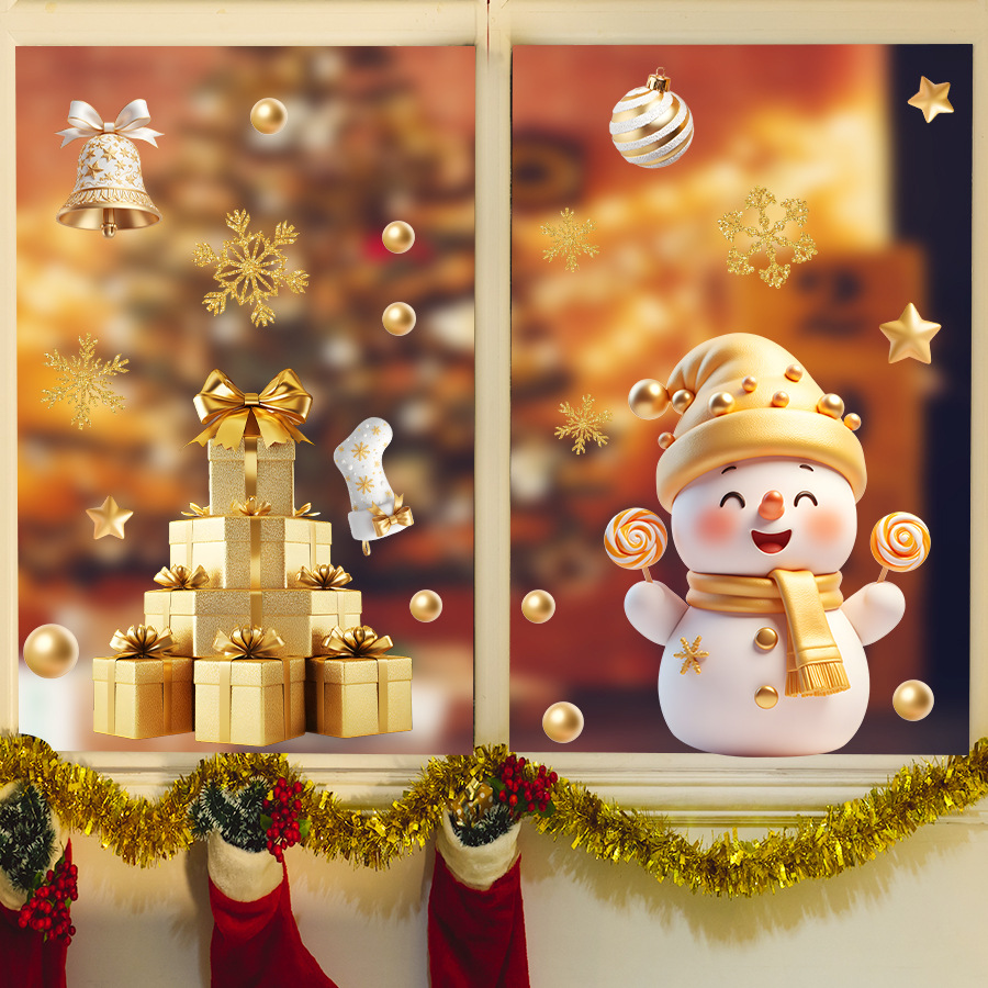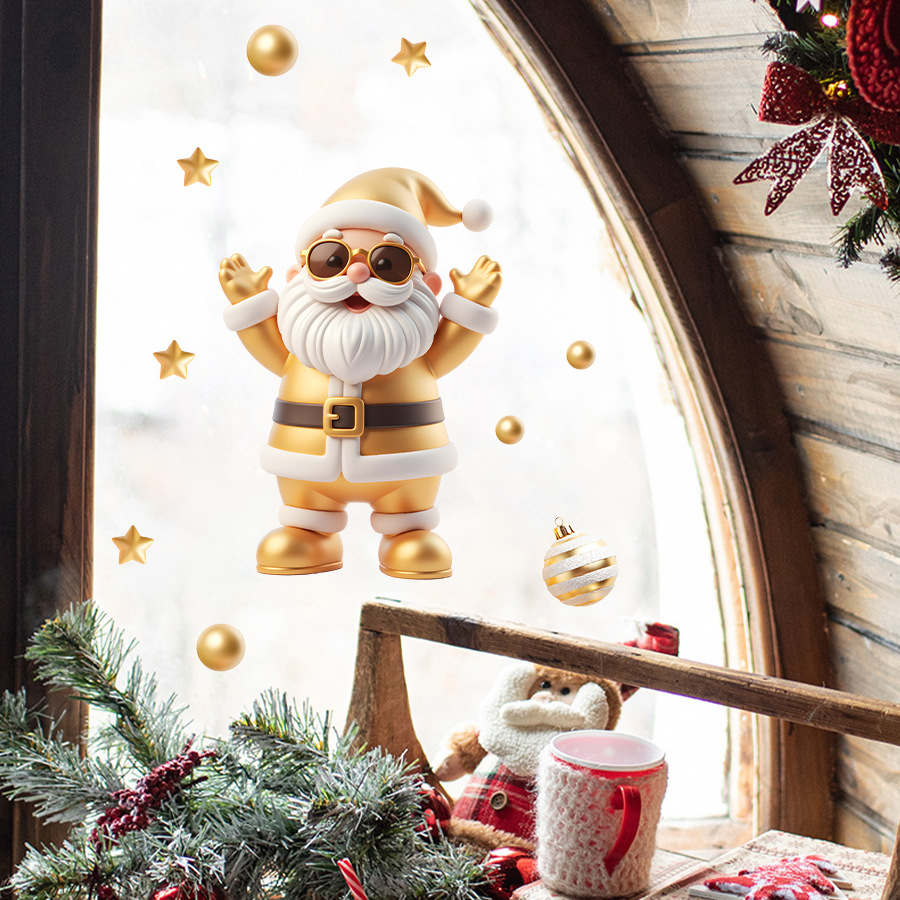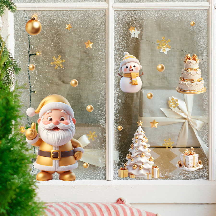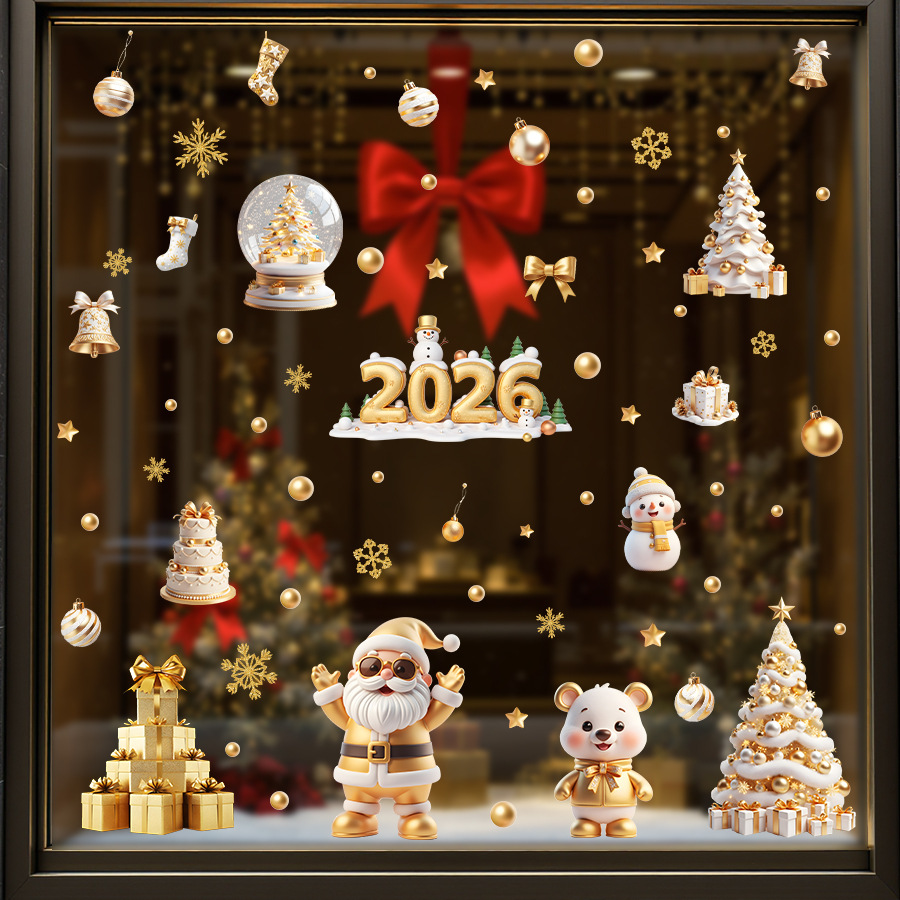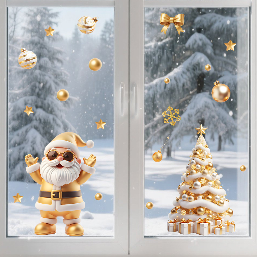 圣诞节金色轻奢静电窗贴铃铛雪花水晶球圣诞老人节日装饰窗贴纸