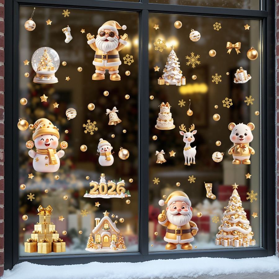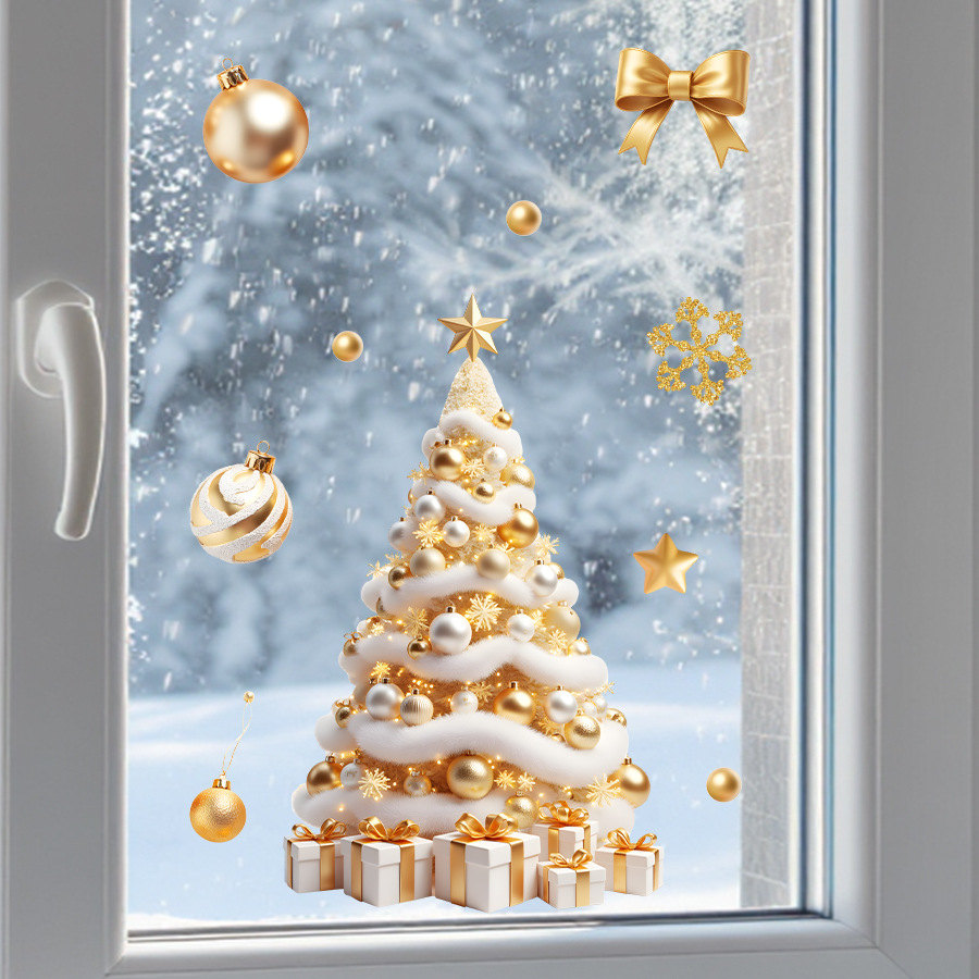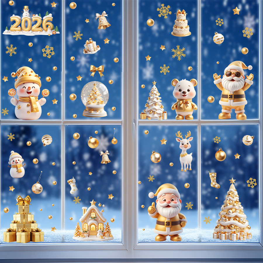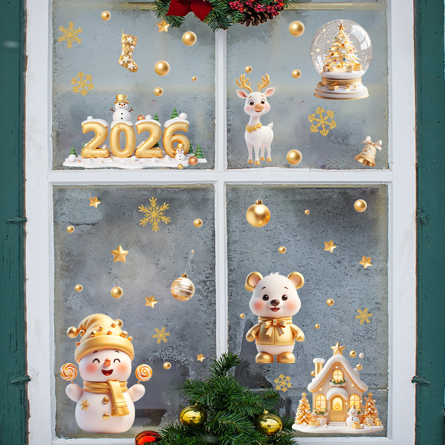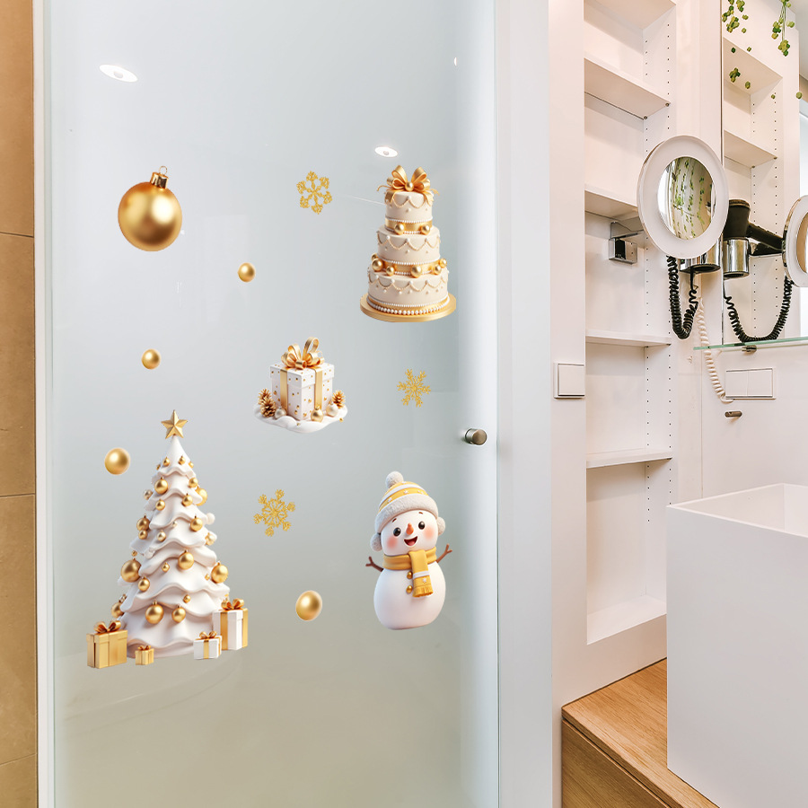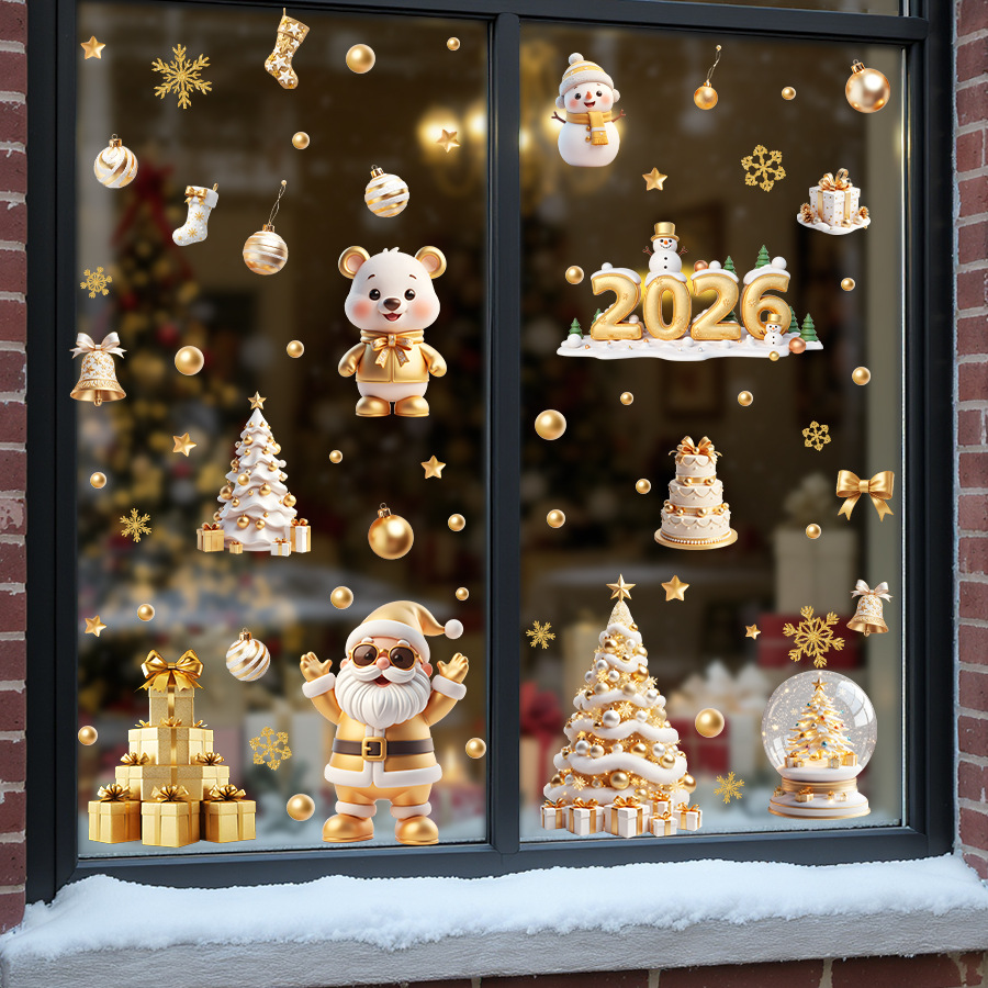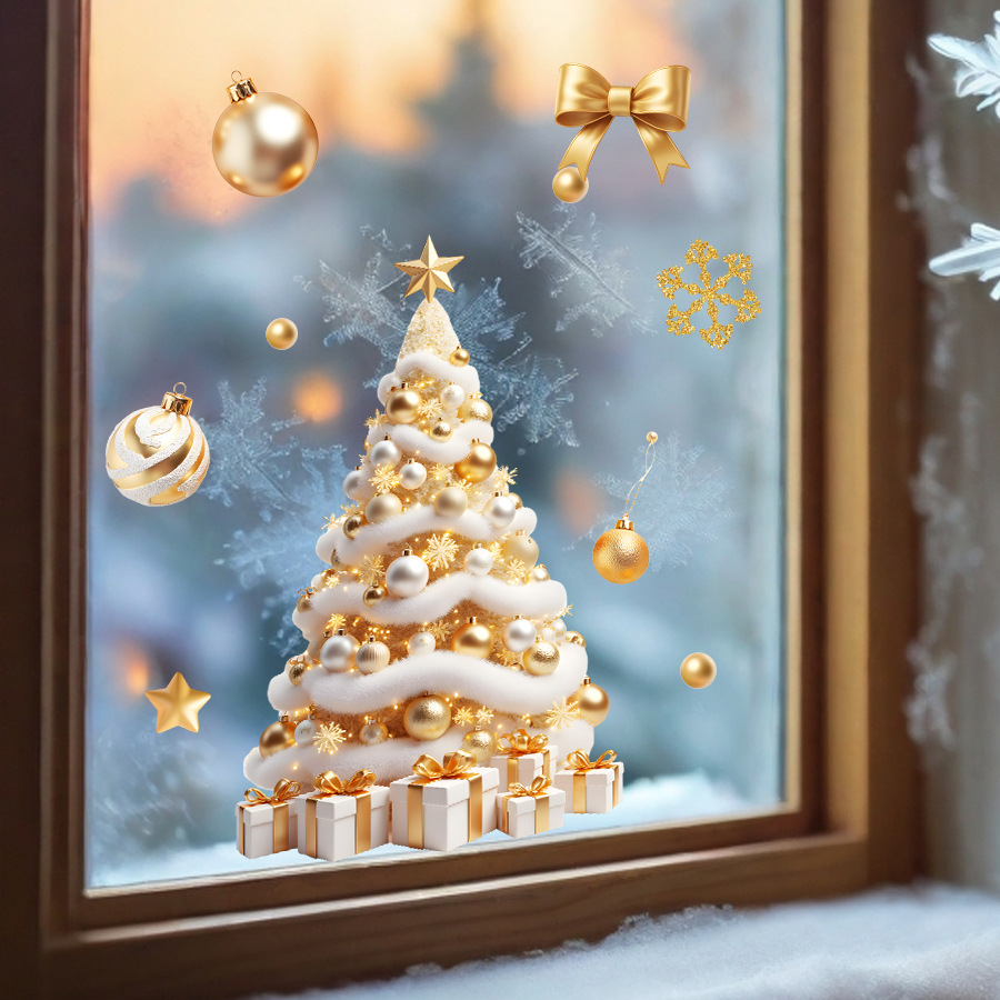 圣诞节金色轻奢静电窗贴铃铛雪花水晶球圣诞老人节日装饰窗贴纸