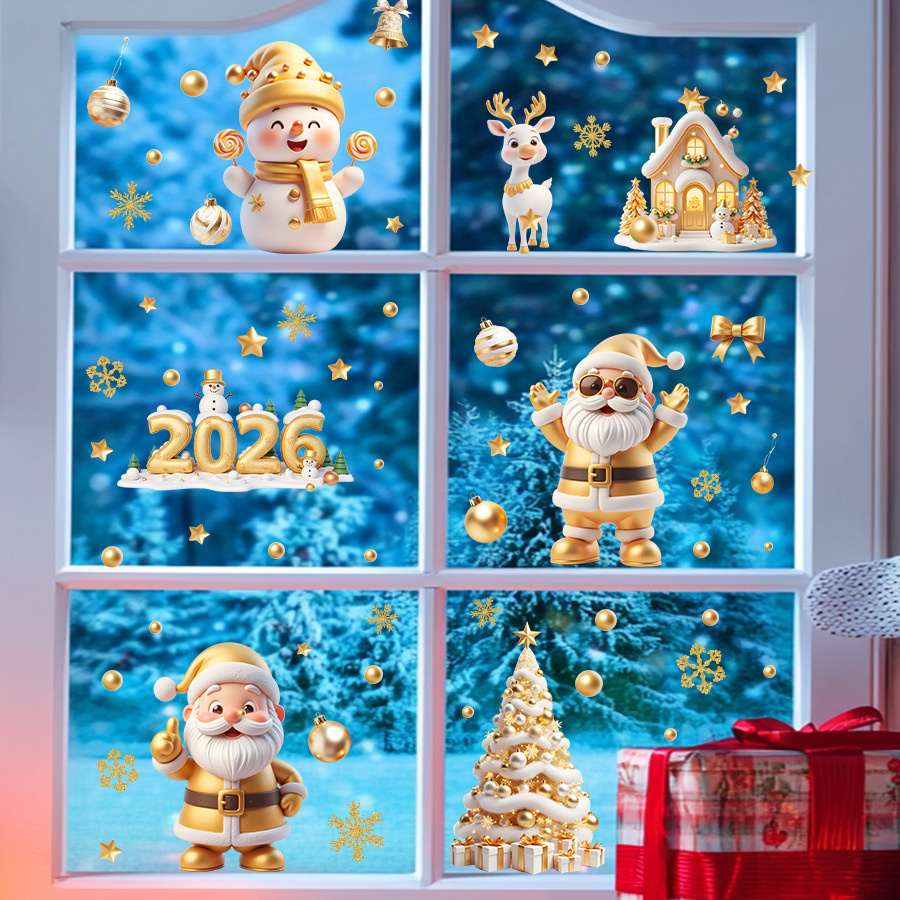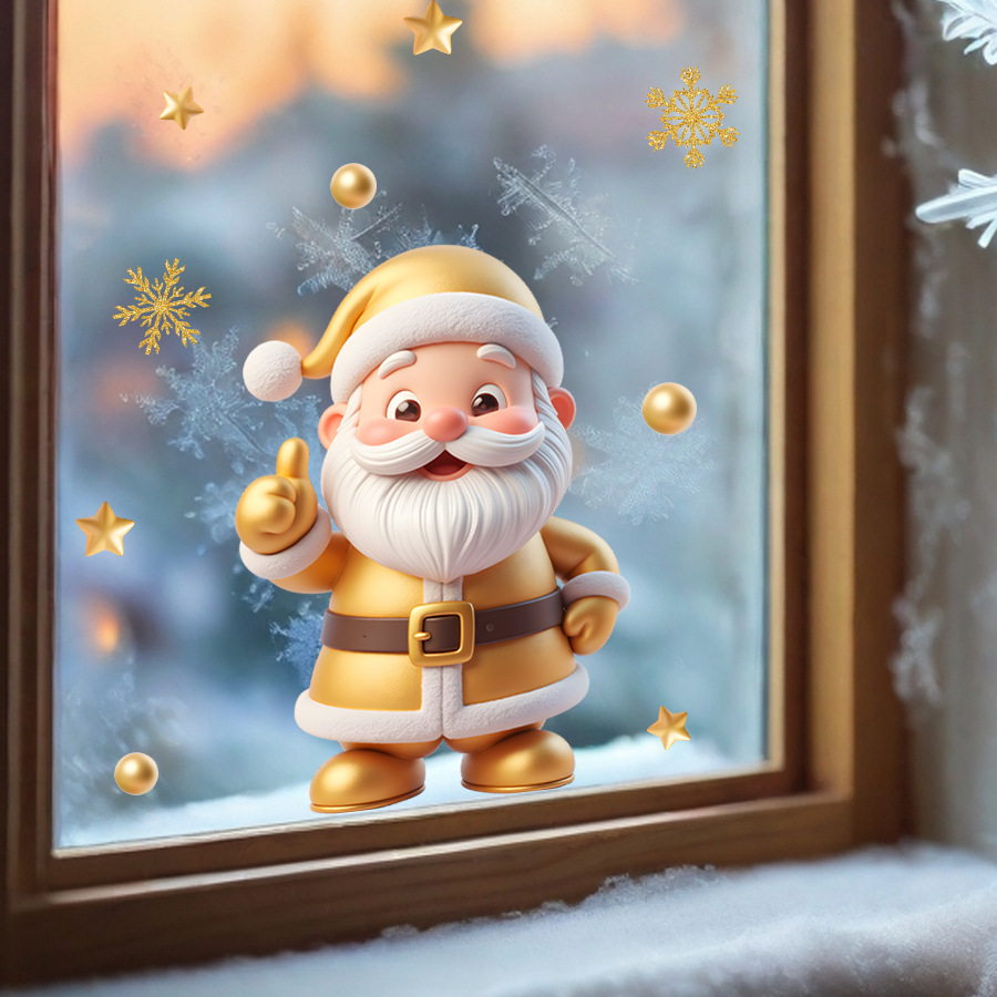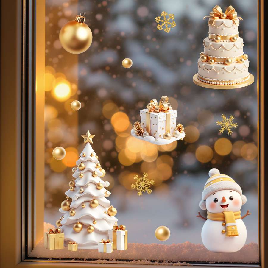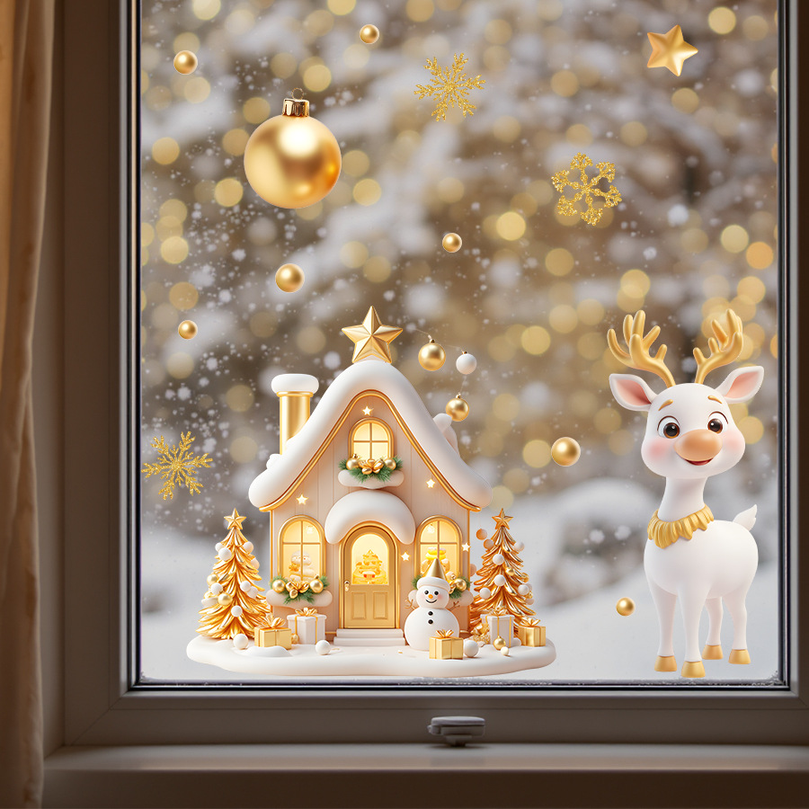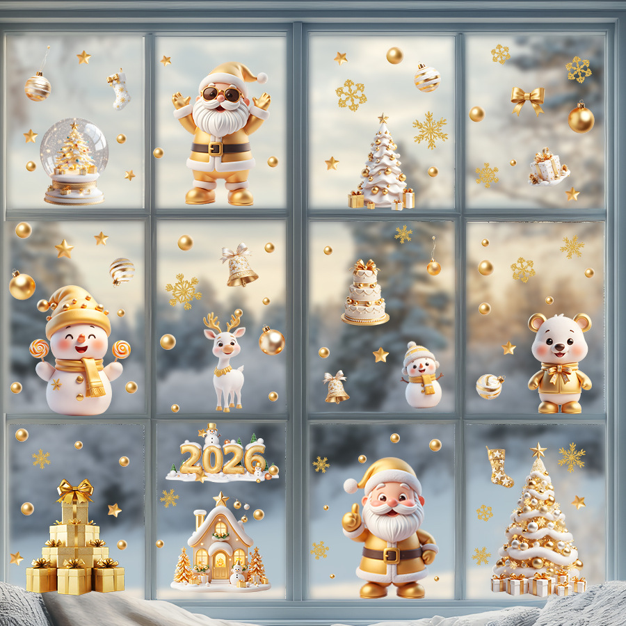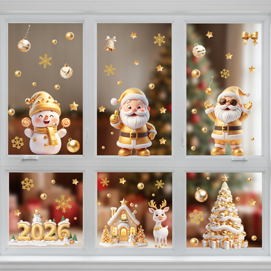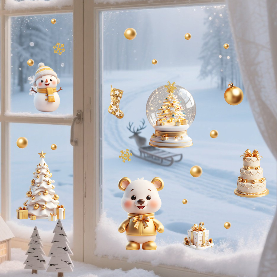 圣诞节金色轻奢静电窗贴铃铛雪花水晶球圣诞老人节日装饰窗贴纸