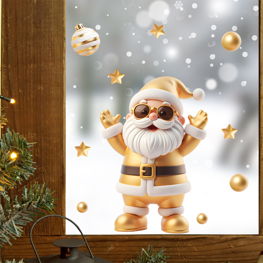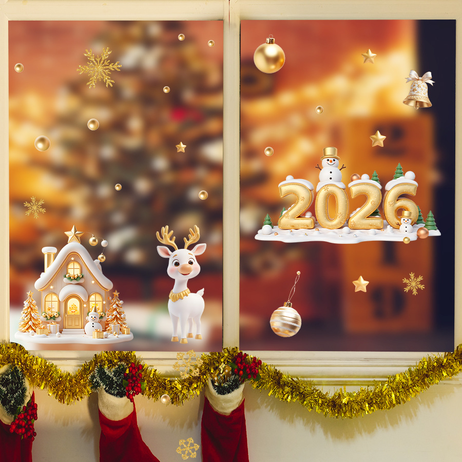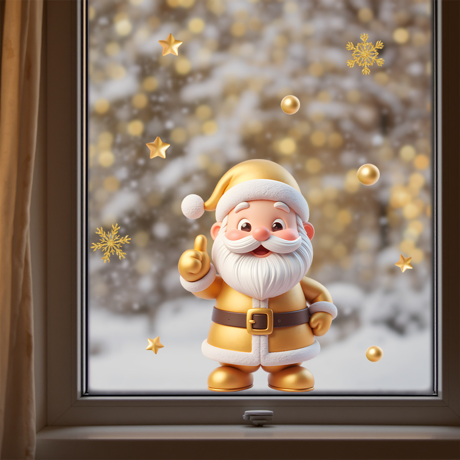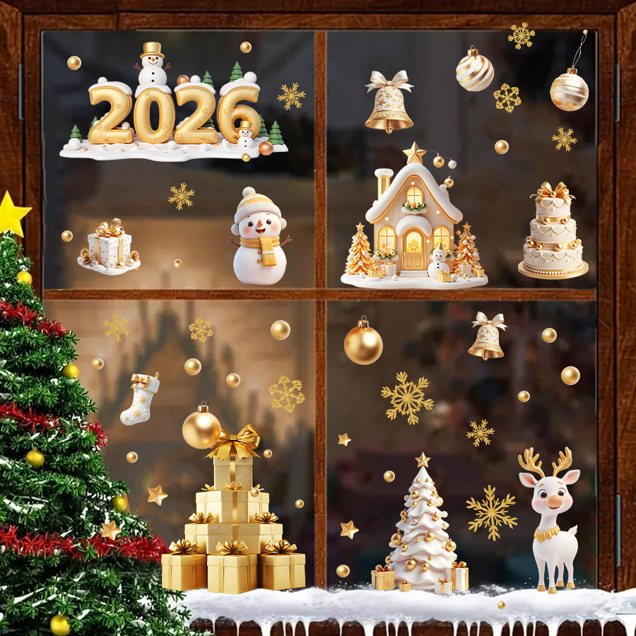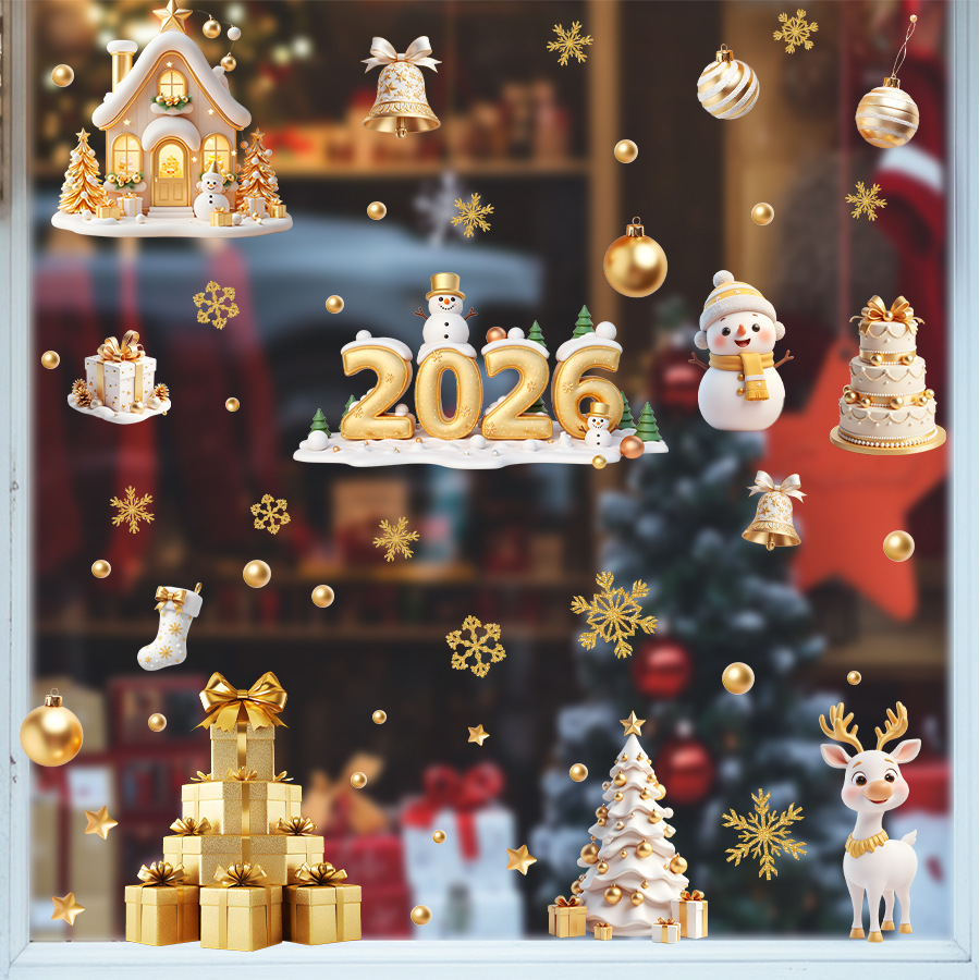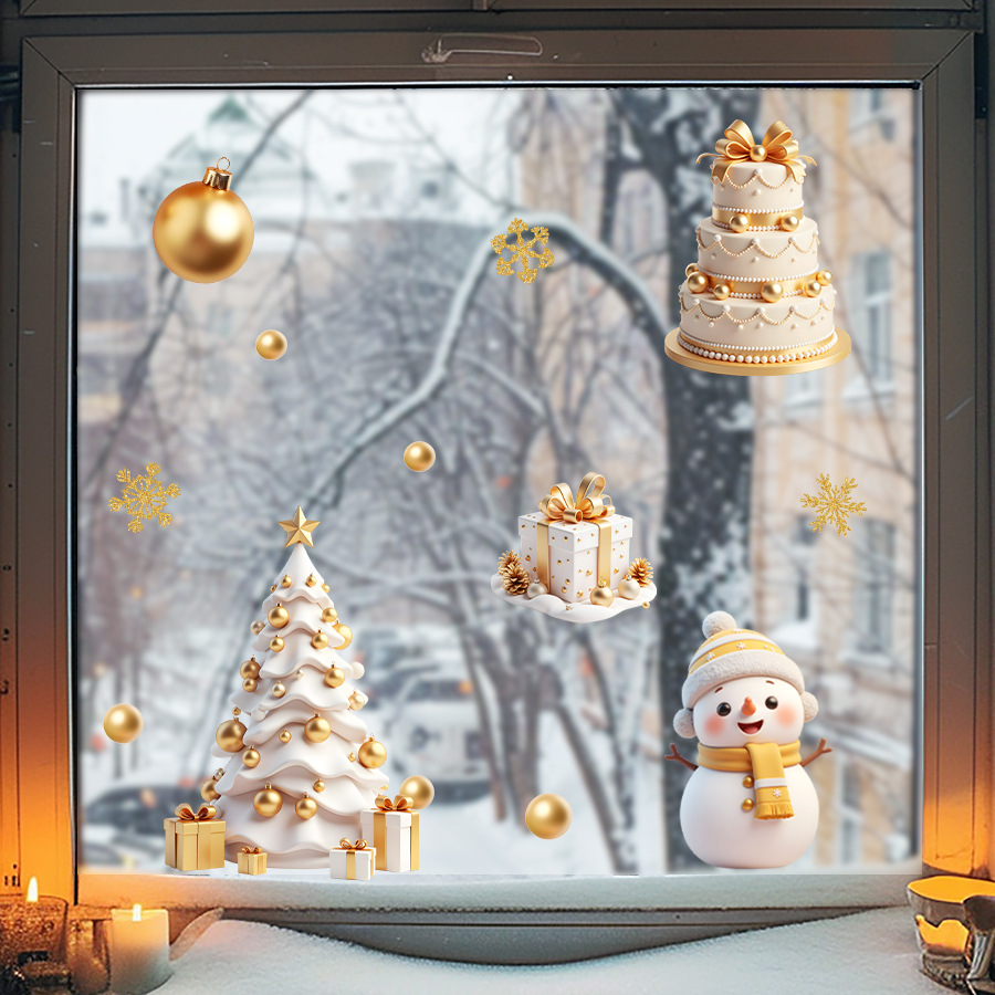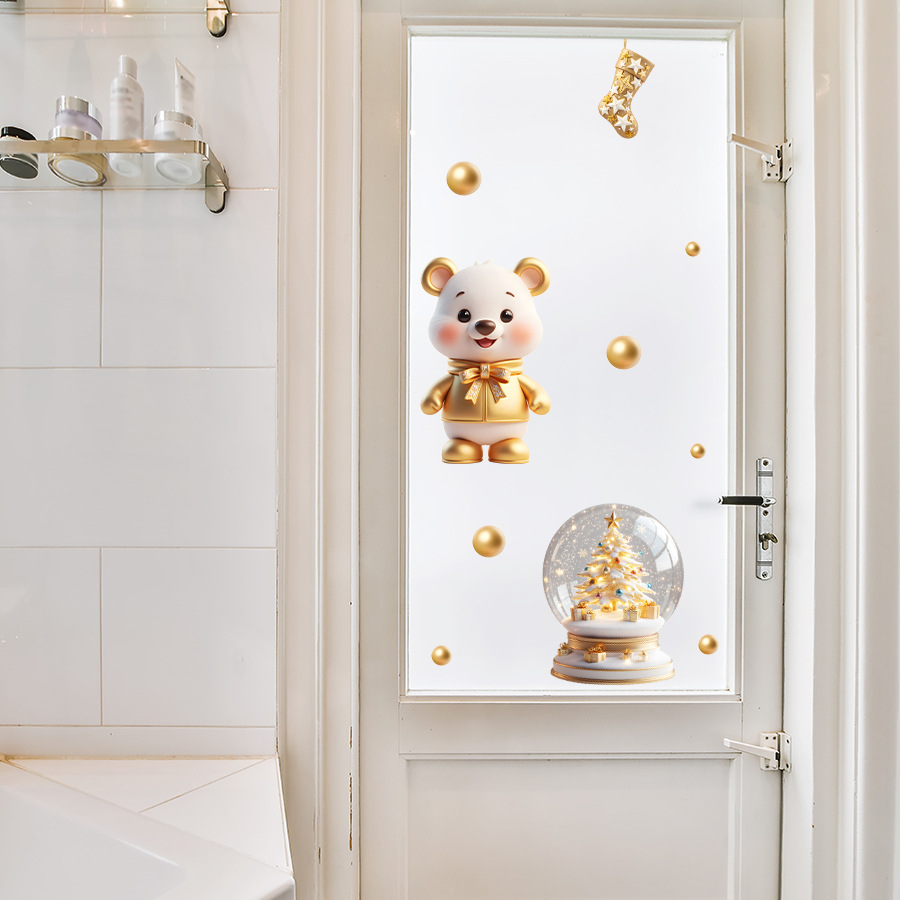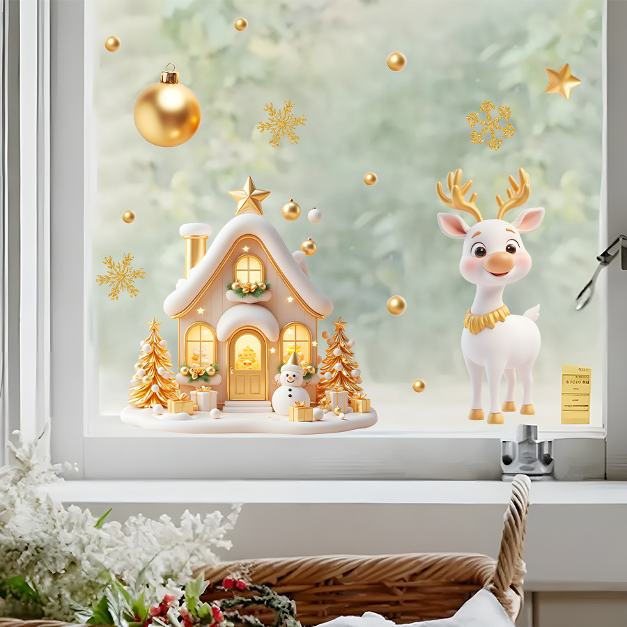 圣诞节金色轻奢静电窗贴铃铛雪花水晶球圣诞老人节日装饰窗贴纸