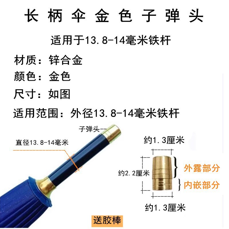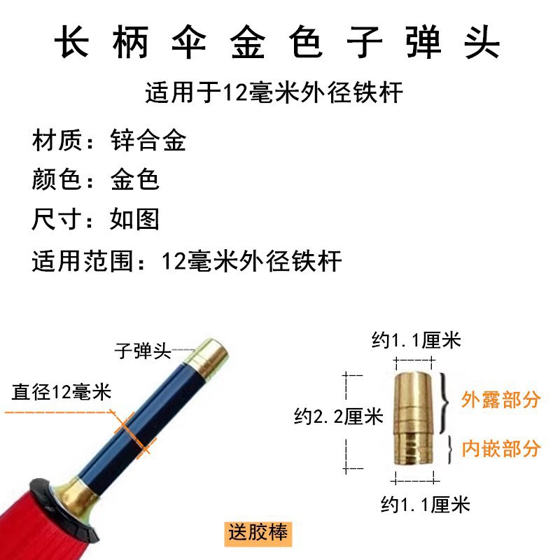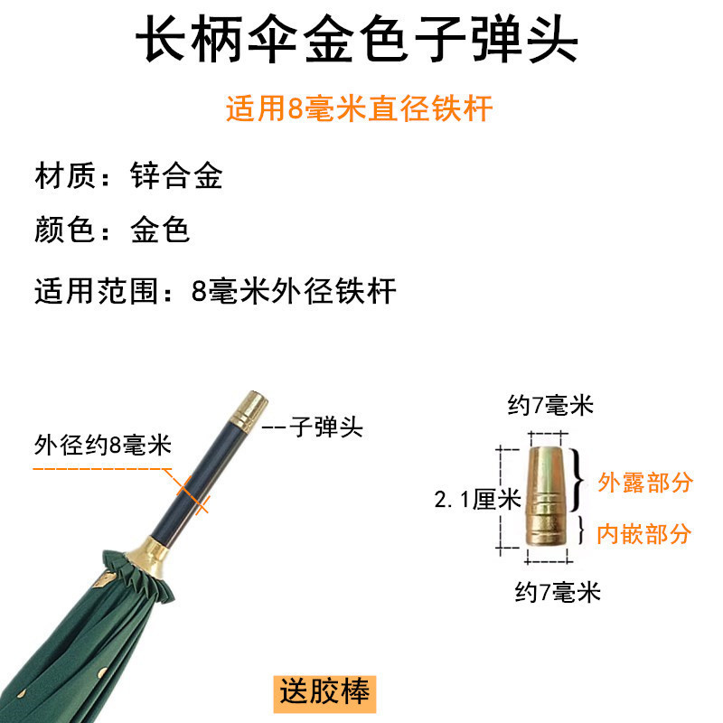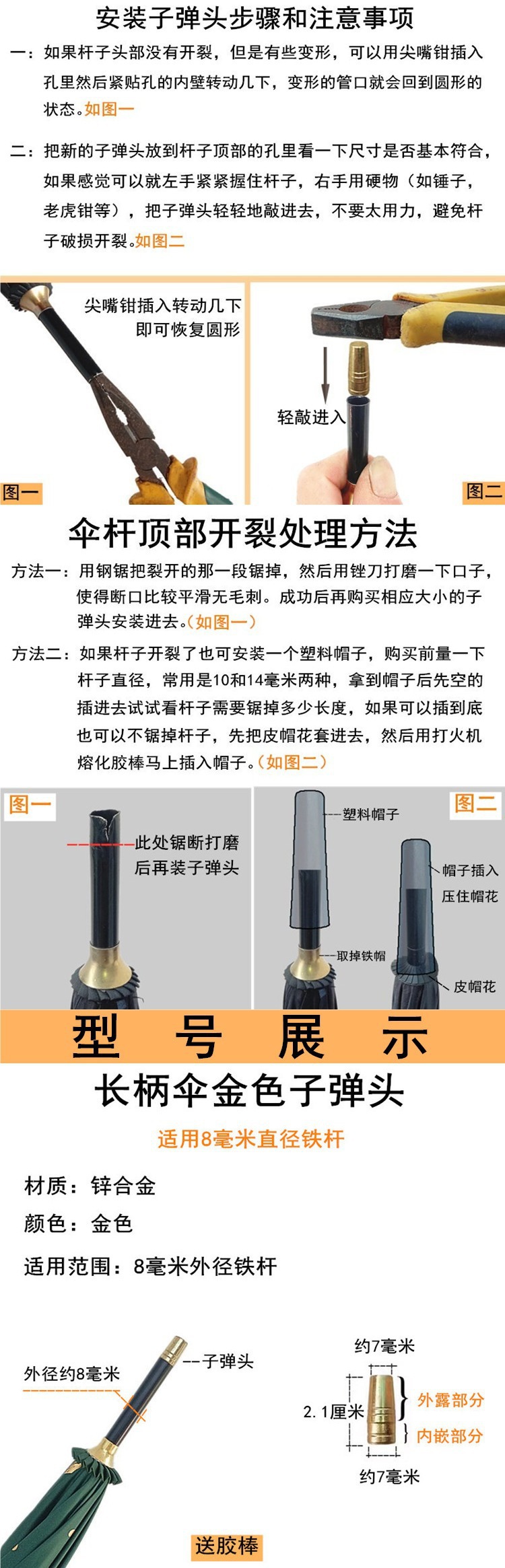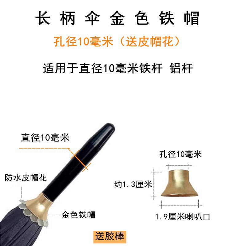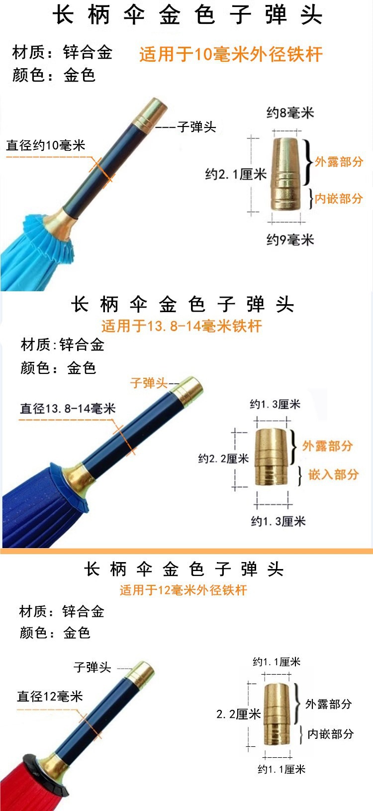长柄伞金色头两个适用8毫米铁杆 送胶棒; 金色头两个适用8毫米铁杆 加5个橡皮套; 长柄伞金色头两个适用10毫米铁杆 送胶棒; 金色头两个适用10毫米铁杆 加5个橡皮套; 长柄伞金色头两个适用14毫米铁杆 送胶棒; 金色头两个适用14毫米铁杆 加2个橡胶保护套; 长柄伞金色头两个适用12毫米铁杆 送胶棒; 金色头两个适用12毫米铁杆 加5个橡皮套; 长柄伞黑镍色头两个适用10毫米杆子 送胶棒; 镀黑镍头两个适用10毫米铁杆 加5个橡皮套; 长柄伞黑镍色头两个适用14毫米杆子 送胶棒; 镀黑镍头两个适用14毫米铁杆 加2个橡胶保护套; 纤维骨塑料头一个适用14毫米纤维杆 送胶棒; 长柄伞镀黑镍铁帽孔径14毫米5个 送皮帽花和胶棒; 长柄伞古铜色金属帽孔径14毫米5个 送皮帽花和胶棒; 长柄伞铝杆铝合金帽孔径14毫米5个 送皮帽花和胶棒; 长柄伞镀黑镍铁帽孔径12毫米5个 送皮帽花和胶棒; 长柄伞金色铁帽孔径10毫米5个 送皮帽花和胶棒; 长柄伞镀黑镍金属帽孔径10毫米5个 送皮帽花和胶棒; 木杆伞塑胶帽子5个孔径14毫米 送皮帽花和胶棒; 12和14毫米杆通用皮帽花5个