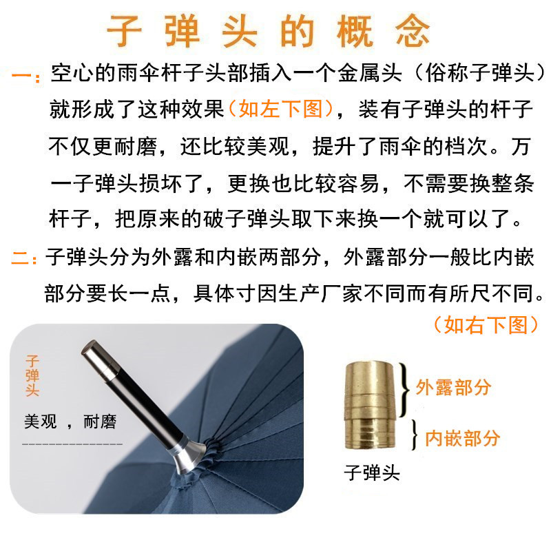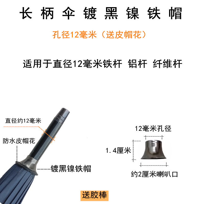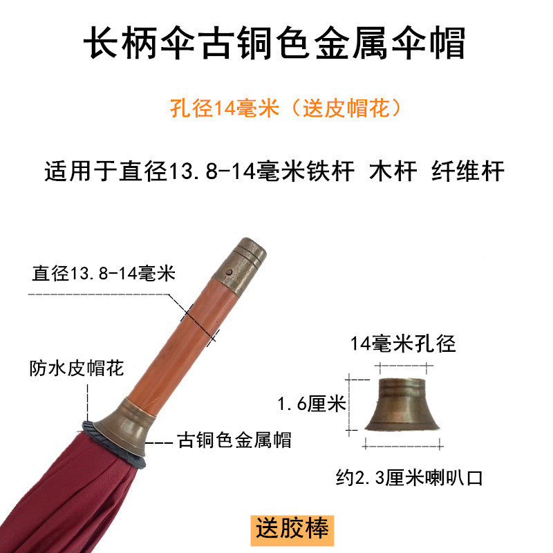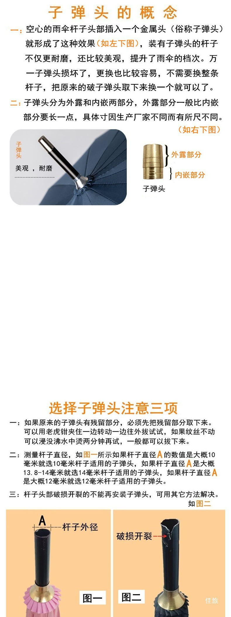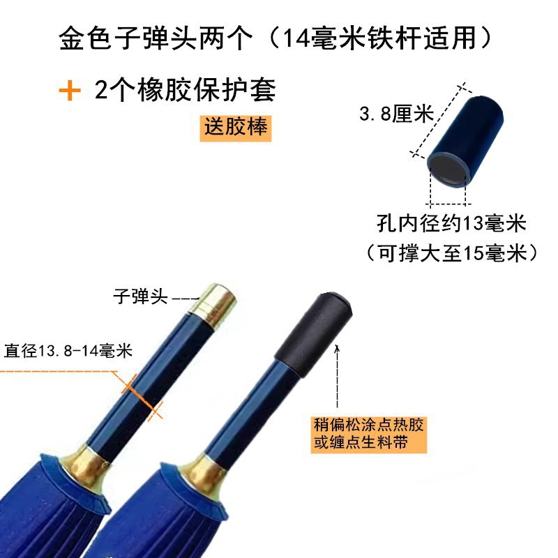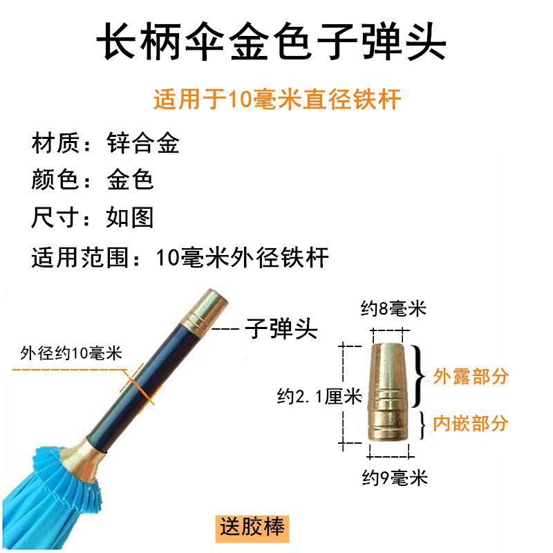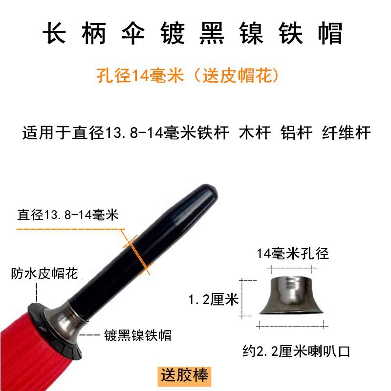 长柄伞金色头两个适用8毫米铁杆 送胶棒; 金色头两个适用8毫米铁杆 加5个橡皮套; 长柄伞金色头两个适用10毫米铁杆 送胶棒; 金色头两个适用10毫米铁杆 加5个橡皮套; 长柄伞金色头两个适用14毫米铁杆 送胶棒; 金色头两个适用14毫米铁杆 加2个橡胶保护套; 长柄伞金色头两个适用12毫米铁杆 送胶棒; 金色头两个适用12毫米铁杆 加5个橡皮套; 长柄伞黑镍色头两个适用10毫米杆子 送胶棒; 镀黑镍头两个适用10毫米铁杆 加5个橡皮套; 长柄伞黑镍色头两个适用14毫米杆子 送胶棒; 镀黑镍头两个适用14毫米铁杆 加2个橡胶保护套; 纤维骨塑料头一个适用14毫米纤维杆 送胶棒; 长柄伞镀黑镍铁帽孔径14毫米5个 送皮帽花和胶棒; 长柄伞古铜色金属帽孔径14毫米5个 送皮帽花和胶棒; 长柄伞铝杆铝合金帽孔径14毫米5个 送皮帽花和胶棒; 长柄伞镀黑镍铁帽孔径12毫米5个 送皮帽花和胶棒; 长柄伞金色铁帽孔径10毫米5个 送皮帽花和胶棒; 长柄伞镀黑镍金属帽孔径10毫米5个 送皮帽花和胶棒; 木杆伞塑胶帽子5个孔径14毫米 送皮帽花和胶棒; 12和14毫米杆通用皮帽花5个