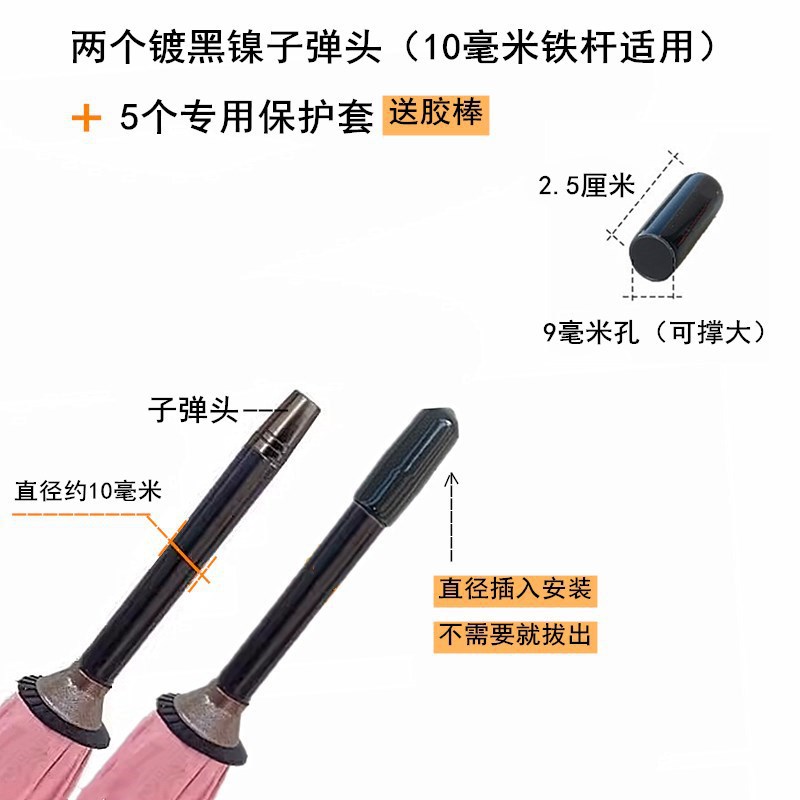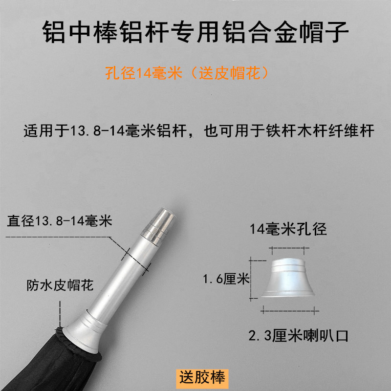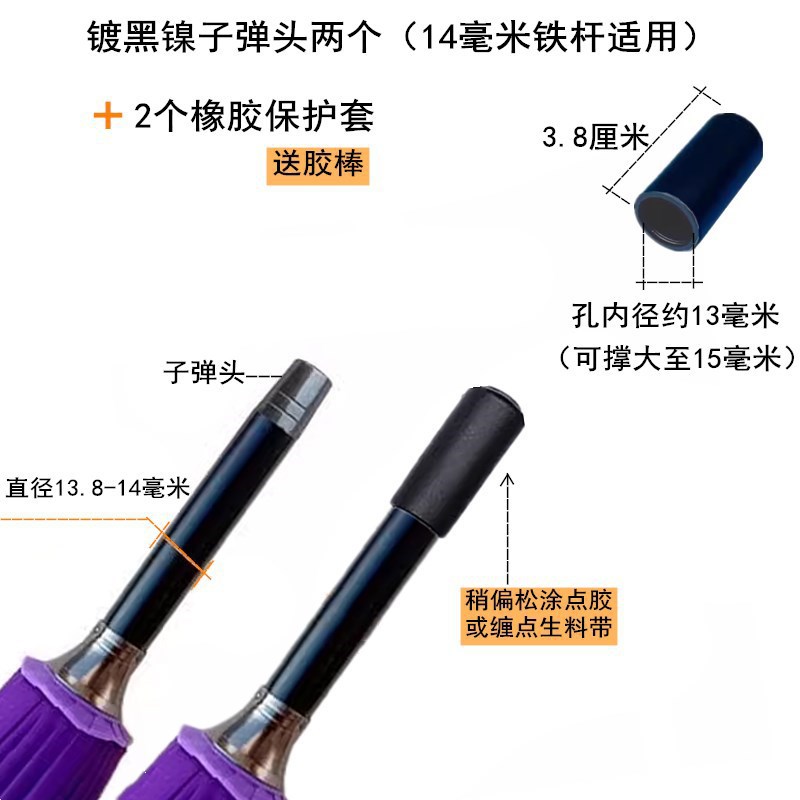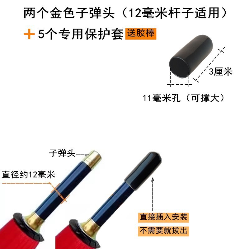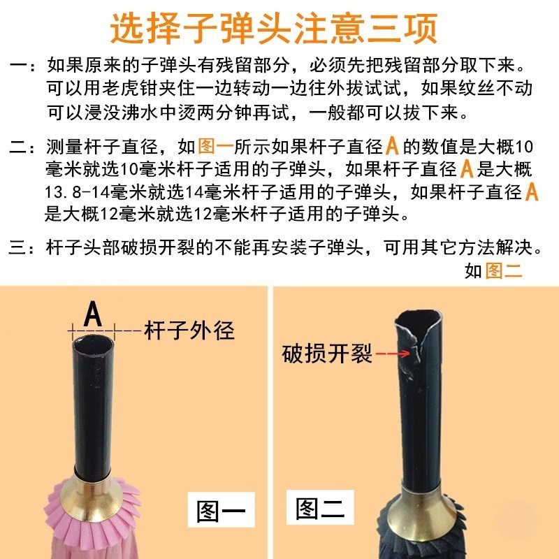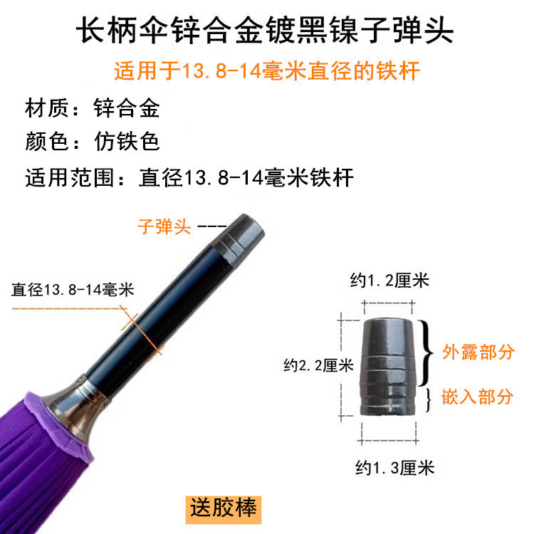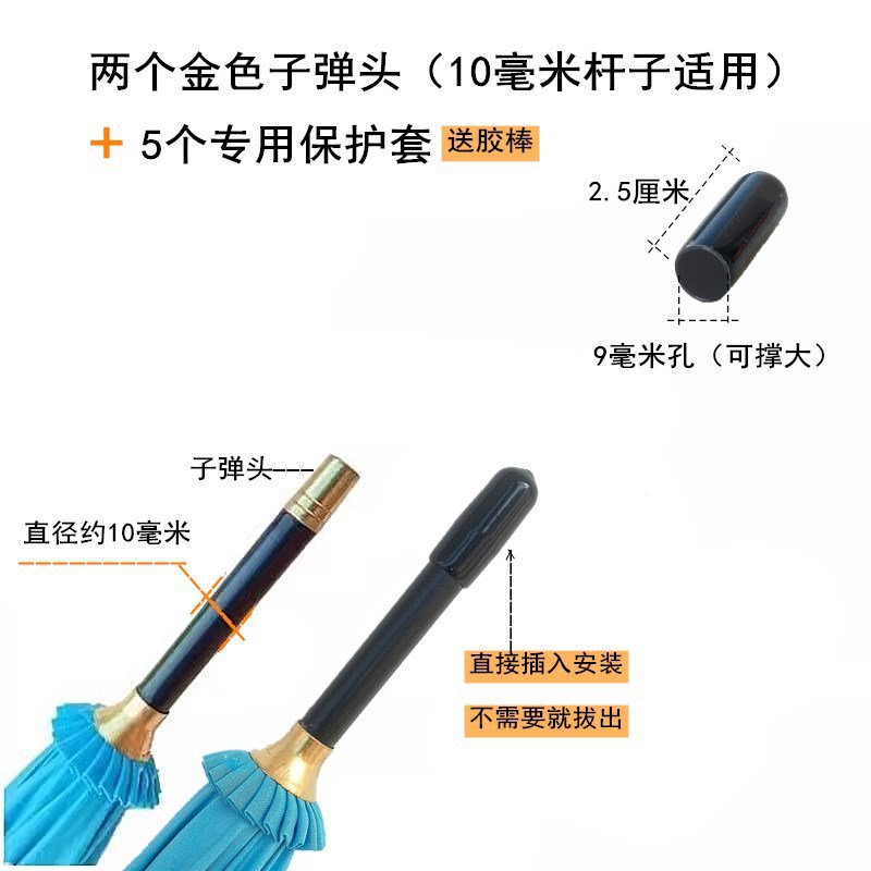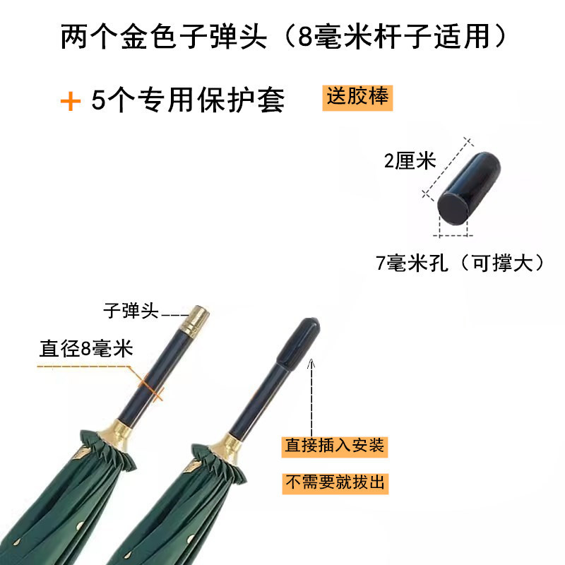 长柄伞金色头两个适用8毫米铁杆 送胶棒; 金色头两个适用8毫米铁杆 加5个橡皮套; 长柄伞金色头两个适用10毫米铁杆 送胶棒; 金色头两个适用10毫米铁杆 加5个橡皮套; 长柄伞金色头两个适用14毫米铁杆 送胶棒; 金色头两个适用14毫米铁杆 加2个橡胶保护套; 长柄伞金色头两个适用12毫米铁杆 送胶棒; 金色头两个适用12毫米铁杆 加5个橡皮套; 长柄伞黑镍色头两个适用10毫米杆子 送胶棒; 镀黑镍头两个适用10毫米铁杆 加5个橡皮套; 长柄伞黑镍色头两个适用14毫米杆子 送胶棒; 镀黑镍头两个适用14毫米铁杆 加2个橡胶保护套; 纤维骨塑料头一个适用14毫米纤维杆 送胶棒; 长柄伞镀黑镍铁帽孔径14毫米5个 送皮帽花和胶棒; 长柄伞古铜色金属帽孔径14毫米5个 送皮帽花和胶棒; 长柄伞铝杆铝合金帽孔径14毫米5个 送皮帽花和胶棒; 长柄伞镀黑镍铁帽孔径12毫米5个 送皮帽花和胶棒; 长柄伞金色铁帽孔径10毫米5个 送皮帽花和胶棒; 长柄伞镀黑镍金属帽孔径10毫米5个 送皮帽花和胶棒; 木杆伞塑胶帽子5个孔径14毫米 送皮帽花和胶棒; 12和14毫米杆通用皮帽花5个