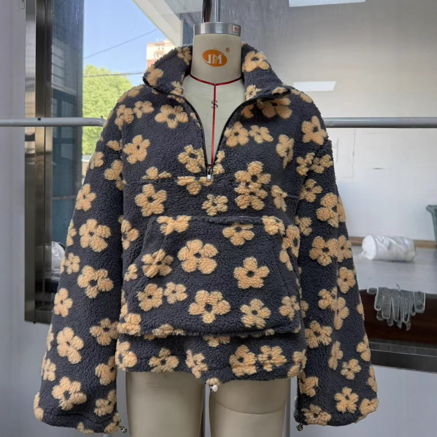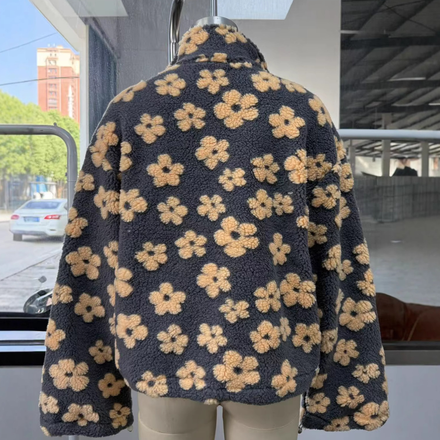 欧美跨境女装2025秋季新款时尚仿羊羔毛印花宽松拉链卫衣长袖上衣