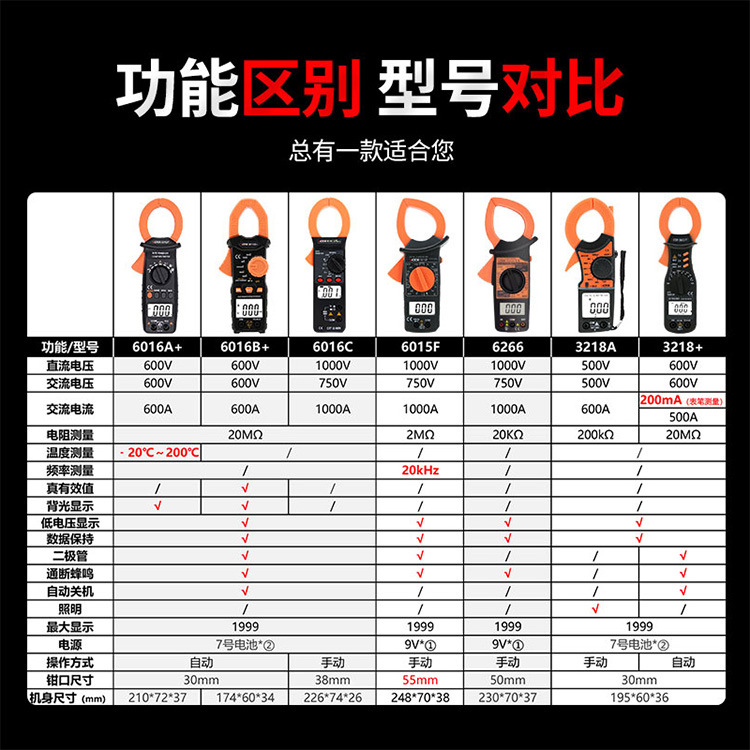 [DM6266 (ток переменного тока 1000 А) + большие губки [высокая стоимость]]; [VC6016B+ (переменный ток 600 А) + истинное среднеквадратичное значение]; [VC6016C (ток переменного тока 1000 А) + автоматический диапазон]; [VC6016A+ (переменный ток 600А) + измерение температуры]; [DM6015F (ток переменного тока 1000 А) + частота + большие губки]; [DM3218+ (ток переменного тока 600 А) + может измерять ток мАч]; [DM3218A (ток переменного тока 600А)]; DM6266 (ток переменного тока 1000 А) + большие губки [высокая стоимость]]; VC6016B + (переменный ток 600A)+ истинное эффективное значение; VC6016C (переменный ток 1000A)+ Автоматический диапазон; VC6016A + (AC 600A)+ измерение температуры; DM6015F (переменный ток 1000A)+ частота + большая губка; DM3218 + (AC 600A)+ может измерять миллиамперный ток; DM3218A (переменный ток 600A)