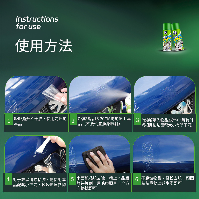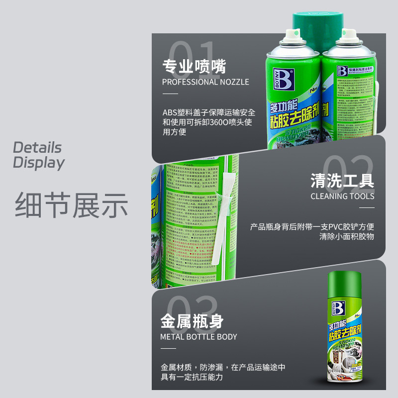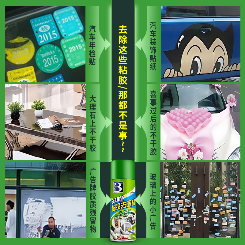 保赐利粘胶去除功能,可将贴在车窗或车身,油漆表面,大理石表面等处的不干胶等粘贴物撕下来,还可将不干胶撕掉后残留下的糨糊物质轻易去除,具有清新香味,一喷一擦,即可轻松去胶.适用于汽车,玻璃,广告牌等有粘贴物的表面,如汽车车身不干胶标签,挡风玻璃粘贴物,路边广告牌粘贴物,电线杆粘贴物等.