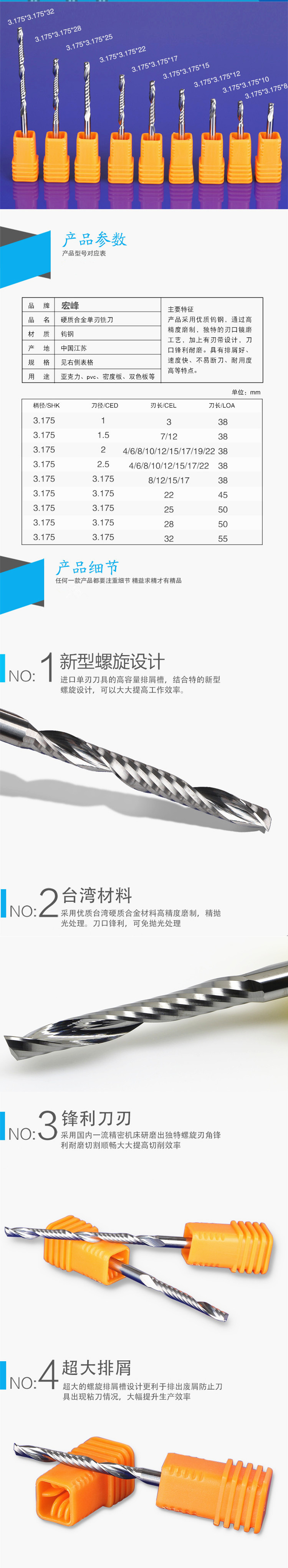 特点:采用优质的钨钢硬质合金材料磨制,刃口锋利,排屑顺畅,经久耐磨。排屑容量大,加上螺旋设计,可大大提高切削速度,切面光滑细腻,用途非常广泛。进口系列效果更好,加工寿命更长。主要应用于切割和勾槽,加工过程中不粘刀、无烟、无味、静音,镜面刃磨工艺设计,结合超大容量排屑槽,和螺旋刃锋利切削,大大提高产品加工效率和质量。
