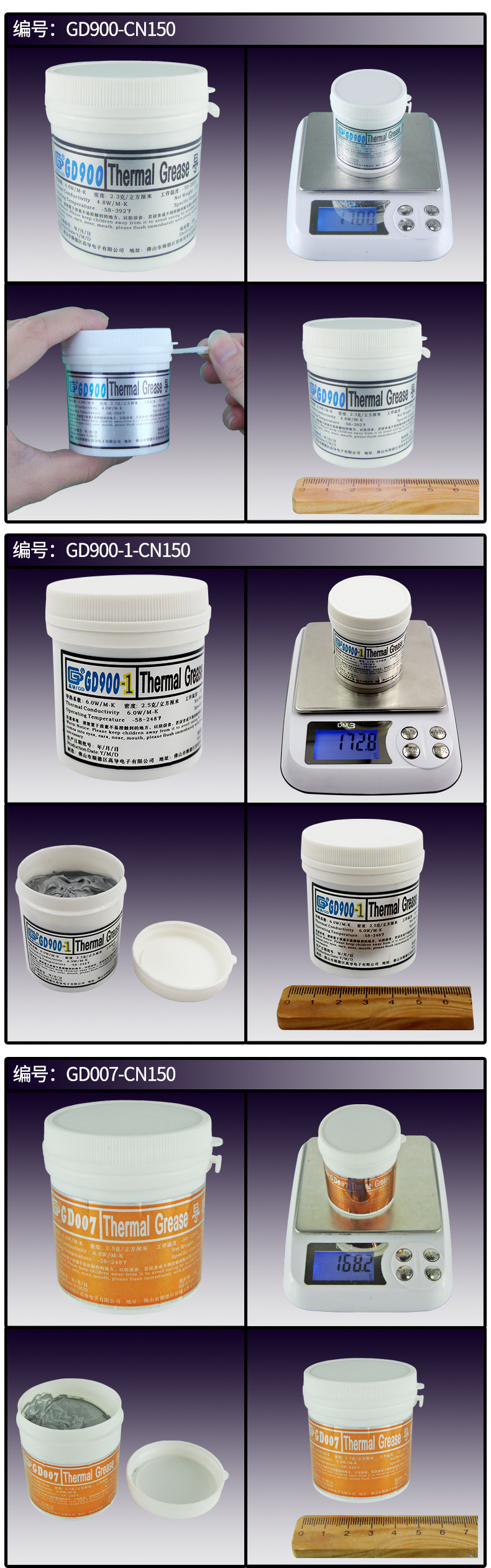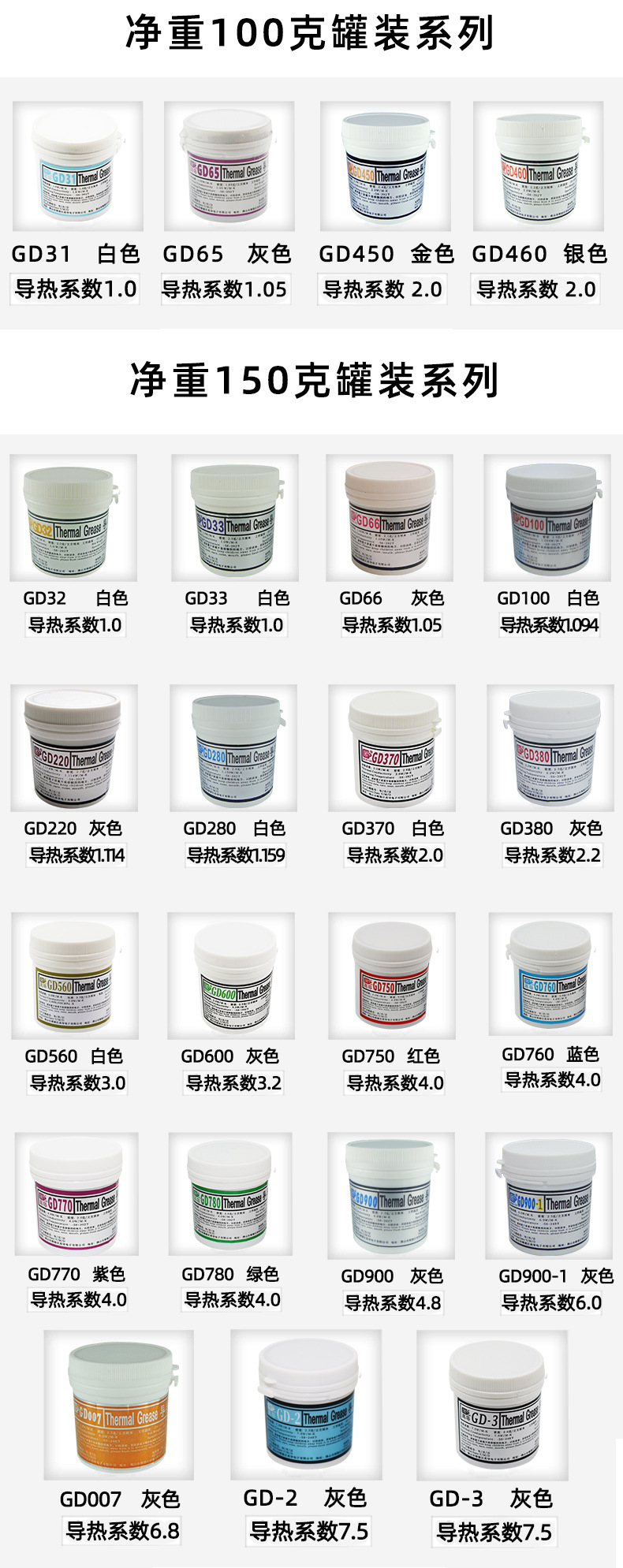 GD31-CN100 Белый 1,0 Вт/М-К Вес нетто 100 г банка; GD32-CN150 Белый 1,0 Вт/М-К Вес нетто 150 г в банке; GD33-CN150 Белый 1,0 Вт/М-К Вес нетто 150 г в банке; GD65-CN100 Серый 1,05 Вт/М-К Вес нетто 100 г в банке; GD66-CN150 Серый 1,05 Вт/М-К Вес нетто 150 г в банке; GD100-CN150 Белый 1,094 Вт/М-К Вес нетто 150 г в банке; GD220-CN150 Серый 1,114 Вт/М-К Вес нетто 150 г в банке; GD280-CN150 Белый 1,159 Вт/М-К Вес нетто 150 г в банке; GD370-CN150 Белый 2,0 Вт/М-К Вес нетто 150 г в банке; GD380-CN150 Серый 2,2 Вт/М-К Вес нетто 150 г в банке; GD450-CN100 Золото 2,0 Вт/М-К Вес нетто 100 г банка; GD460-CN100 Серебристый 2,0 Вт/М-К Вес нетто 100 г банка; GD560-CN150 Белый 3.0 Вт/М-К Чистый вес 150 г в упаковке; GD600-CN150 Серый 3,2 Вт/М-К Вес нетто 150 г в банке; GD750-CN150 красный 4,0 Вт/M-K вес нетто 150 г банка; GD760-CN150 Синий 4,0 Вт/М-К Вес нетто 150 г в банке; GD770-CN150 Фиолетовый 4,0 Вт/M-K Вес нетто 150 г банка; GD780-CN150 Зеленый 4,0 Вт/М-К Вес нетто 150 г в банке; GD900-CN150 Серый 4,8 Вт/М-К Вес нетто 150 г в банке; GD900-1-CN150 Серый 6,0 Вт/М-К Вес нетто 150 г в банке; GD007-CN150 Серый 6,8 Вт/М-К Вес нетто 150 г в банке; GD-2-CN150 Серый 7,5 Вт/М-К Вес нетто 150 г в банке; GD-3-CN150 серый 7,5 Вт/М-К вес нетто 150 г консервы