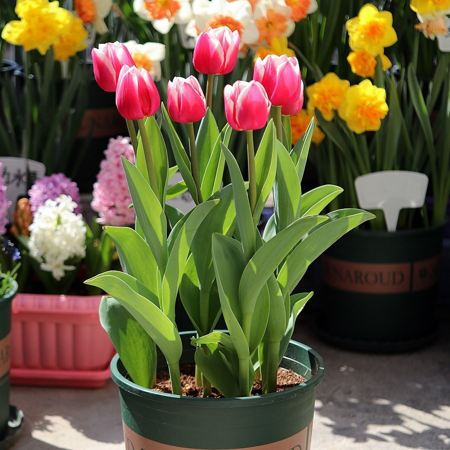 【花语】 博爱、体贴、高雅、富贵、能干、聪颖 。 【郁金香简介】 一.郁金香种球(郁金香种之前建议除去包在球根外面的褐色表皮 这样可以促进根系均一的生长,使的整个种植群整体齐生长和同步开花。种植初期尽量放置在有遮阴或半日照地方,需保持盆土湿润,郁金香忌干湿差距过大。种球类适宜11月-3月种植,整个发芽期大约在10-20天(视环境温度可有不同)。 二.使用松软透气的土壤。种球球根尖凸的部分朝上,较扁平的一面朝同一个方向种植,则长出来的叶子方向就会整齐,叶片 也比较漂亮. 三.郁金香在萌芽期、现蕾期都需要的营养,若土壤养分不足可施些观花肥料,如磷肥. 郁金香种植后的栽培与管理 一.当郁金香球根长出新芽以后就要移到日照充足的地方,并给予充分的水分。 二.出芽后可以适当提高生长环境的温度来缩短开花需要的时间。低于10度,生长相对缓慢些,但对生长开花没有影响. 三.开了花的郁金香盆栽,如果要延长花期,放在阴凉处,减少水分。 郁金香开花持久的秘诀 郁金香对温度极为敏感,既使是花瓣紧闭的郁金香,只要是放在温暖的地方,就会开始绽放。而开了花 的郁金香要延长花期,只要将它摆在凉爽且湿度低的场所,越冷花期越长。在摄氏四度的低温下甚至花期可长达一个月不凋谢呢!当您正担心花瓣要开尽掉落时,到了气温降低的夜晚又恢复了含苞的状态。 郁金香凋谢后的处理 当郁金香凋谢以后,可将花盆移到日照充足的地方,小心照顾,不要让叶子枯萎,郁金香的叶片形状优美,也可当观叶植物观赏,如此一来新球根就会在土壤中不【花语】 博爱、体贴、高雅、富贵、能干、聪颖 。