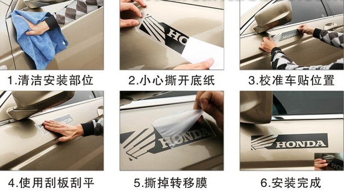 1、在决定装扮爱车前一个星期不要打蜡,蜡会让贴纸粘不牢;贴膜不可在车子发热的时候贴,必须洗干净车子,贴上后一个星期内不可以洗车,贴上后建议24小时内不要暴晒;车贴粘贴好后三天内请勿洗车,不要在阴雨天贴,这样效果会不好哦2、如贴纸需要贴在门缝上或其它需活动的地方,也不用担心,贴好后用快刀裁开即可。3、如自己实在不愿动手,请到当地贴太阳膜的地方请求帮助。4、反光材料非自发光!反光的晚上有灯光照射到的时候会反射光线,很炫而且可以起到警示作用。类似于警示牌那样的!【如何清除】用指甲轻轻地将贴纸边缘刮起,再整个地撕除,不会留痕亦不会伤害车漆。冬天如果天冷无法刮起边角,可用电吹风将胶纸适当加热,胶融软后即可轻易除去。