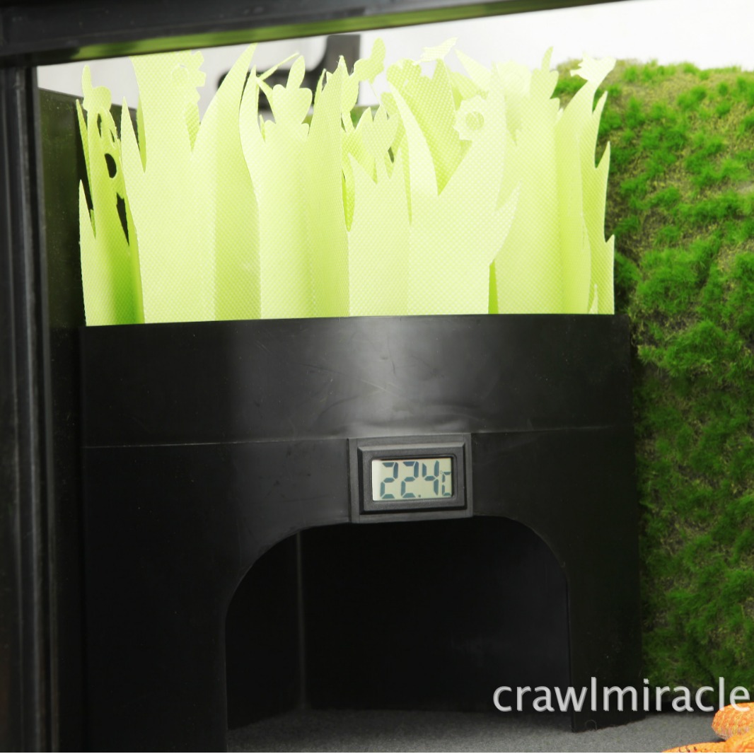 上半部可加水槽设计,方便使用加湿器或设置土壤种植植物,圆弧形面设计温度计,可随时观测洞内附近温度,下部扇形设计增大洞穴使用面积。采用ABS工程塑料,使用更安全,牢固。