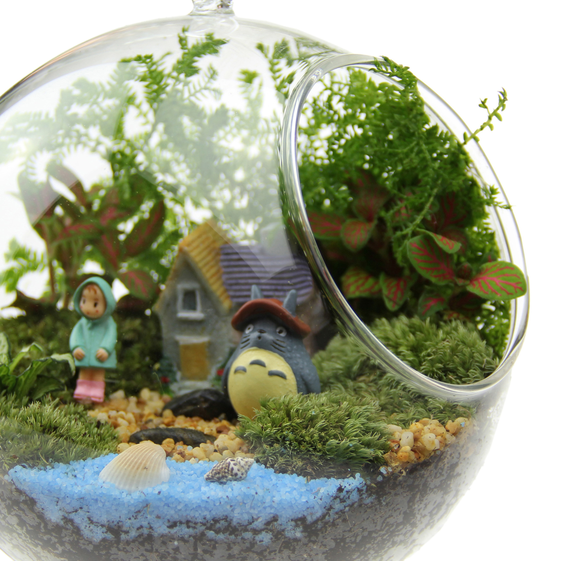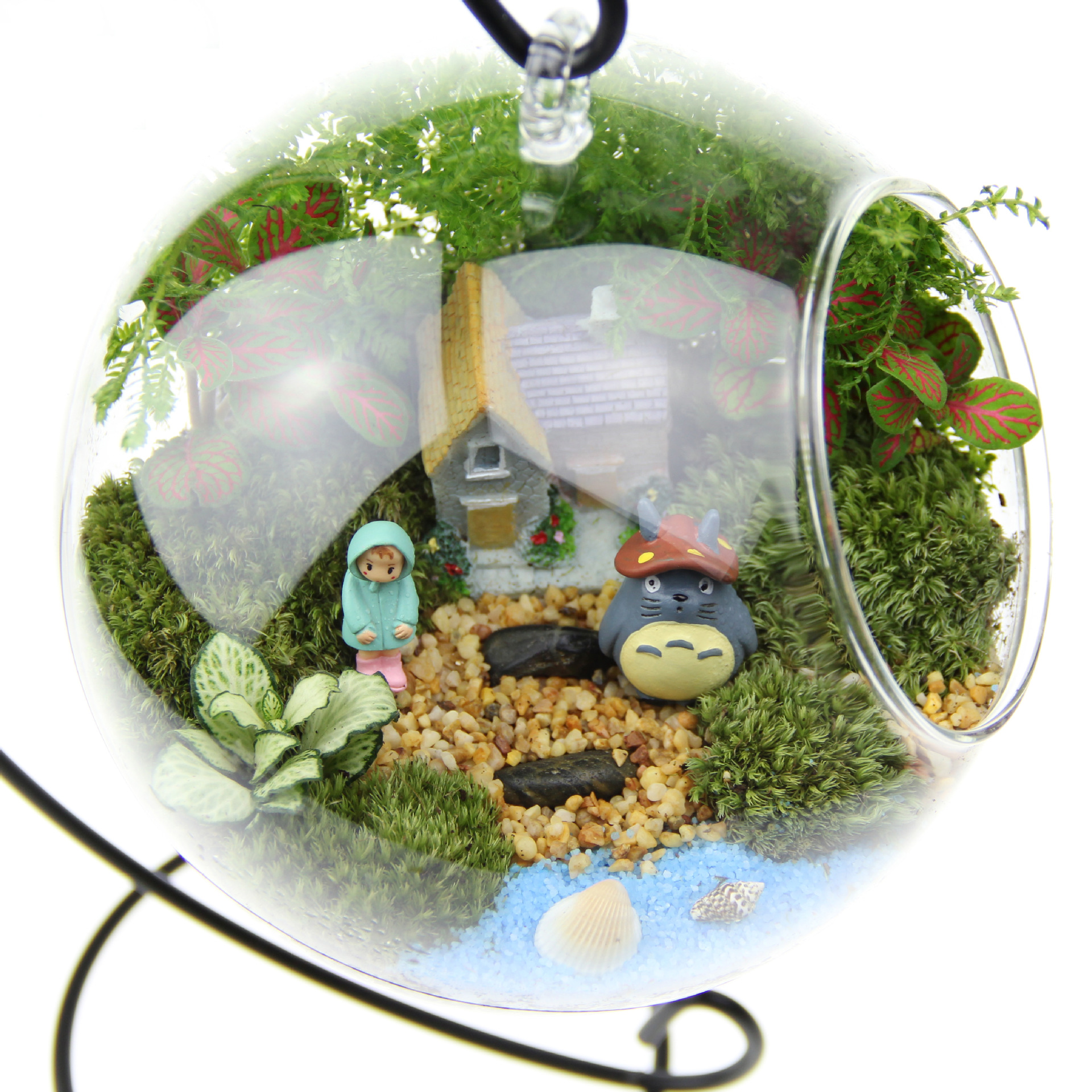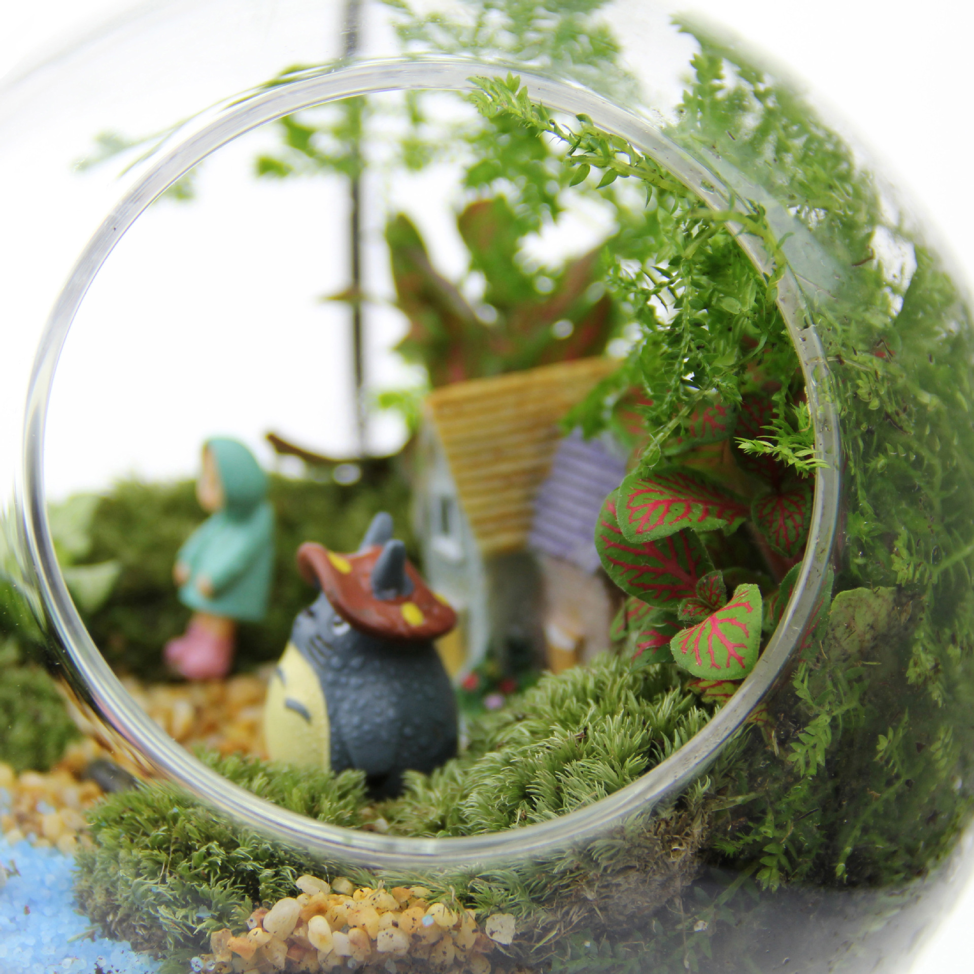 常用造景植物和配件苔藓微景观会选用一些植物与苔藓进行搭配造景,造景植物一般包括:狼尾蕨、网纹草、罗汉松、铜钱草、袖珍椰子等。此类植物形状美观、颜色翠绿且生长环境与苔藓类似,喜欢湿度较高的环境。特别是蕨类植物常用到。常见的苔藓微景观,其造景用的配件玩偶以宫崎骏系列动漫电影里的人物模型为主,尤其以龙猫系列玩偶为常见,可爱的龙猫,奔跑的小梅等都是经典的苔藓微景观玩偶搭配。另外,小蘑菇、沉木、小栅栏、鹅卵石、河川沙等都是常用的配件。这些小配件被恰到好处的运用到苔藓微景观布景中,取到丰富景观作用。