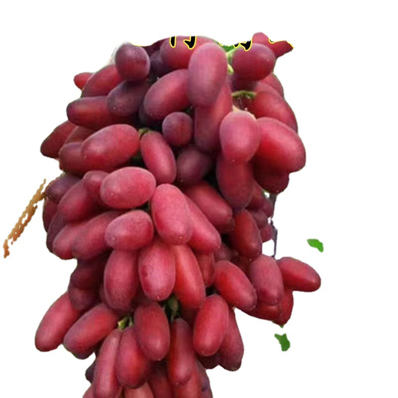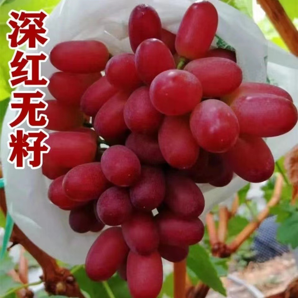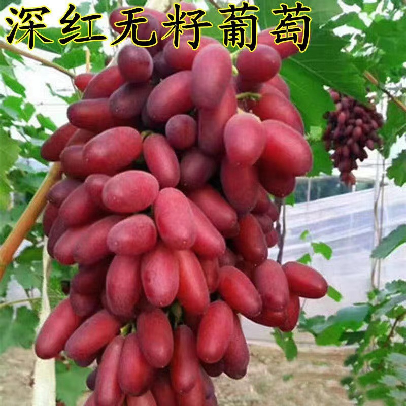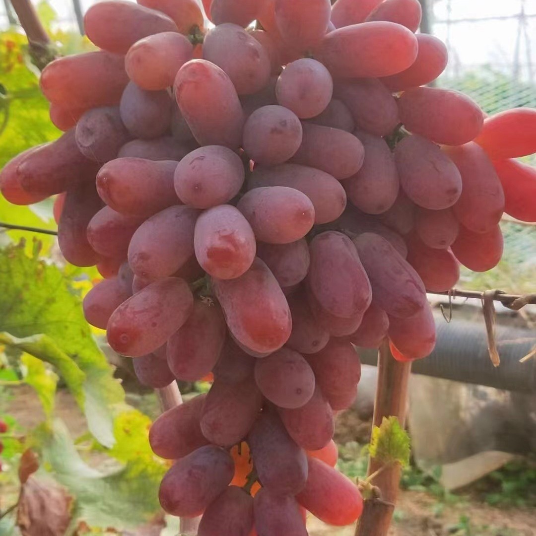 澳洲美人指:又名深红无核(英文名称Scarlotta Seedless):起源于美国最新注册的葡萄品种,大果穗,平均穗重750克,高达2000克,果长椭圆形,鲜红色深红色,深红宝石色,平均粒重可达10 - 12克,含糖量20 - 23%,无激素处理,自然无核,经拉长剂拉长果穗和果粒后,最大穗重可达4000克,果实长6-8厘米,果重18-25克,9月中旬果实完全成熟,比克瑞森早20天,果肉硬而脆。甜而多汁。