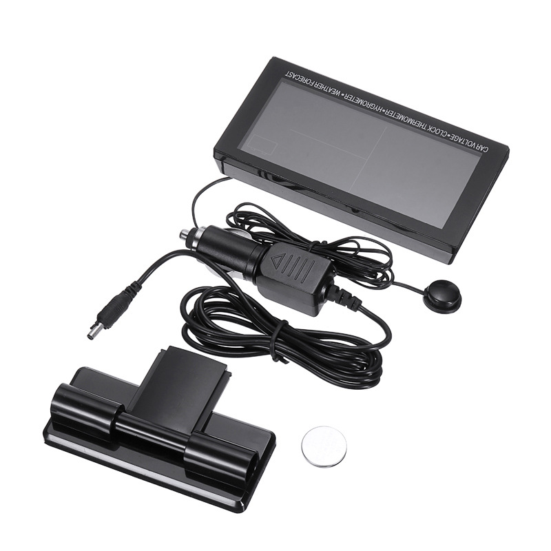1、 年、月、日、时、分及星期显示 2、12/24小时制转换 3、摄氏、华氏温度显示切换 4、测温范围:室外:-50~70度,室内:-10~60度 5、室内湿度测量功能 6、1分钟闹铃、5分钟贪睡功能 车用电源背光功能 7最高及最低温湿度报警设置 8、月亮圆缺显示 9、整点谐音 10、车内电瓶电压的实时监控,数字显示当前电压。电压的状态图案指示,电压过高或过低时,报警声提示 11、天气预报功能