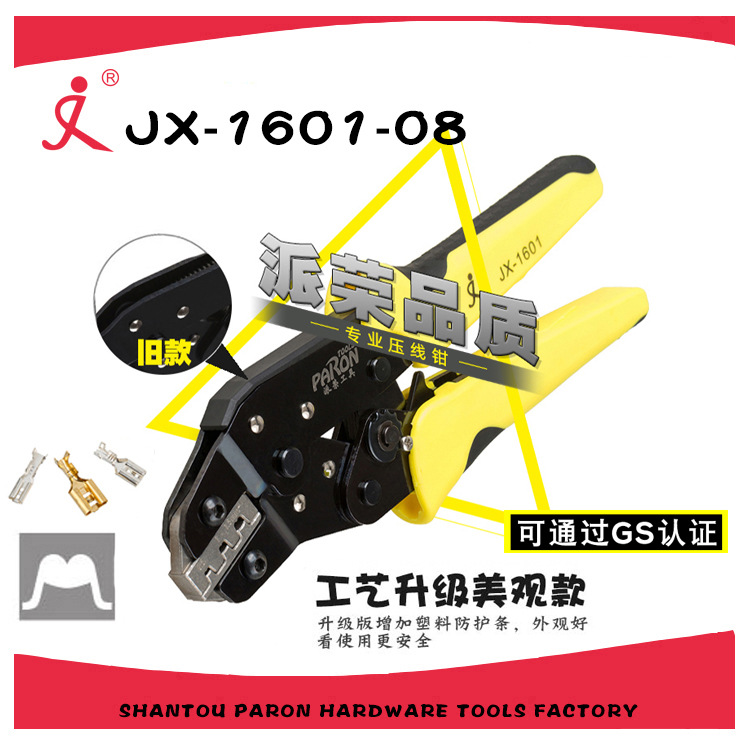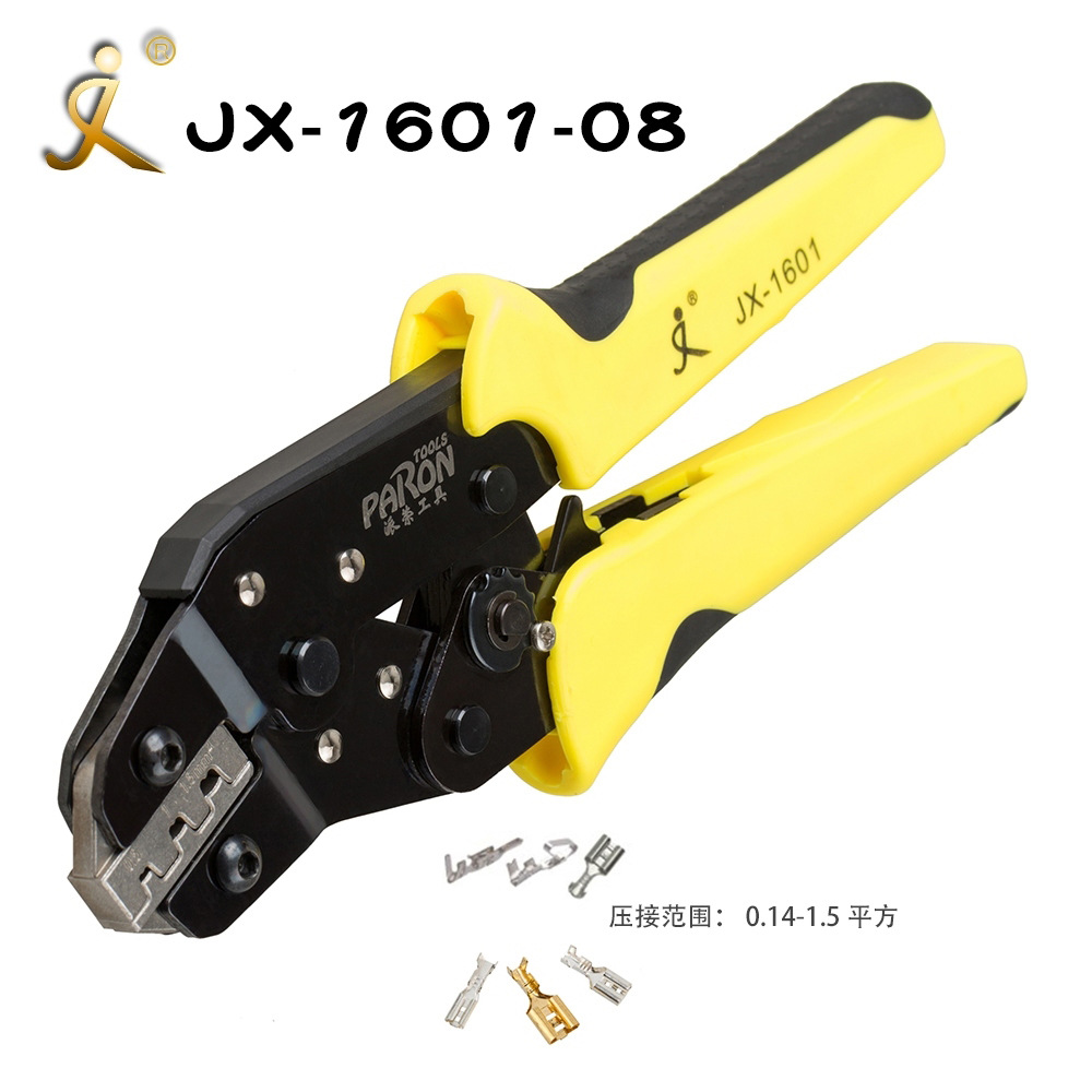 - 棘轮式省力压线钳 (JX-1601)由钢精制而成,耐用性高,使用寿命长,操作轻松省力快捷方便,钳头压线口模具采用进口合金钢精密制造,精准度高,压接更完美,不浪费接线端子,钳体经热处理并采用自研发工艺加工使得表面光亮金属感,钳头压线口模可更换其他规格口模,达到一钳多用的效果,是一款功能齐全的高档手工具,手柄设计手感与质感兼具,并采用较高难度工艺制造双色手柄,是电工、维修工及电气企业生产制造常备工具。