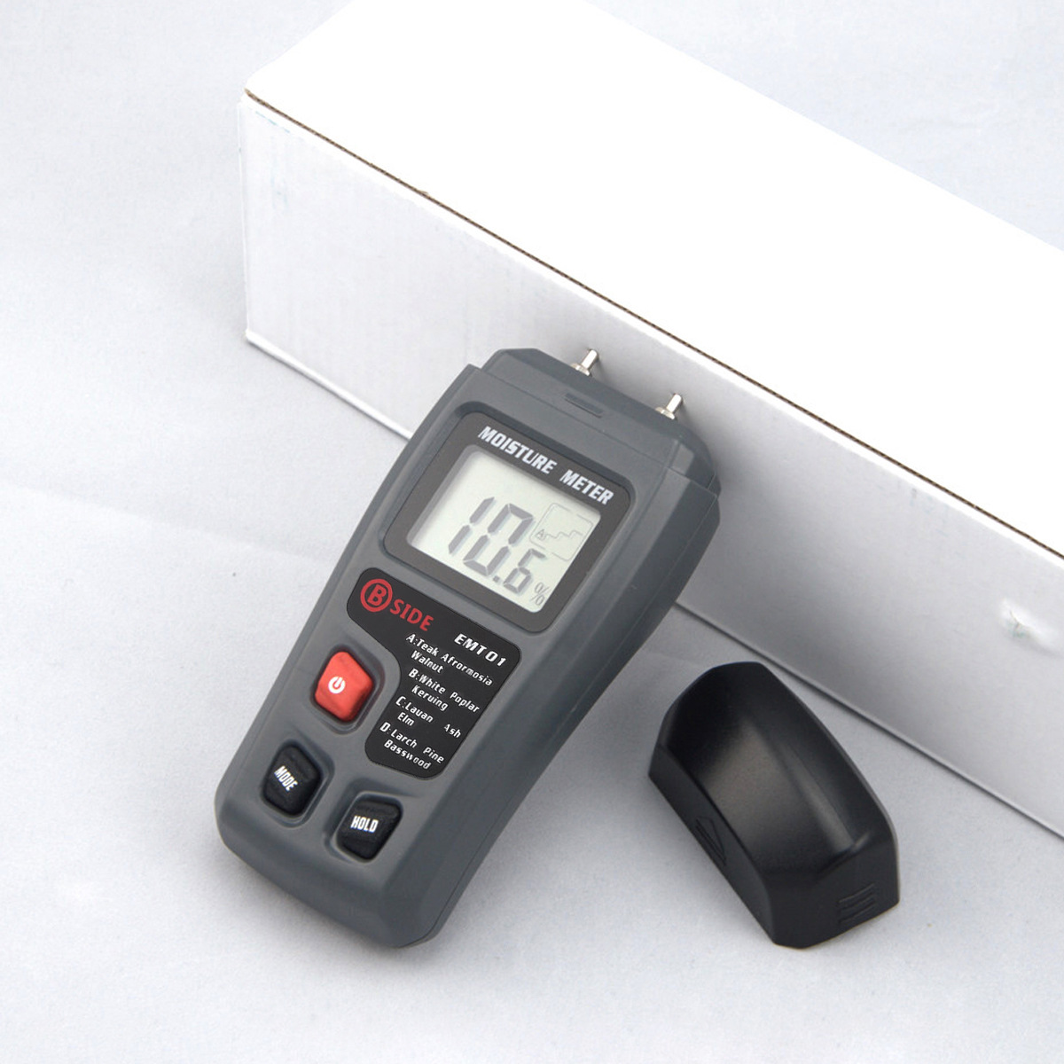 本木材水份测试仪,采用插针式电阻测试法,内部采用高精度电子元器件。可对100多种常规木材,进行分组模式的湿度测量. 外观采用人体工程力学,简易的按键操作模式,舒适的手感,让用户更轻松快捷的使用此仪表进行测量.