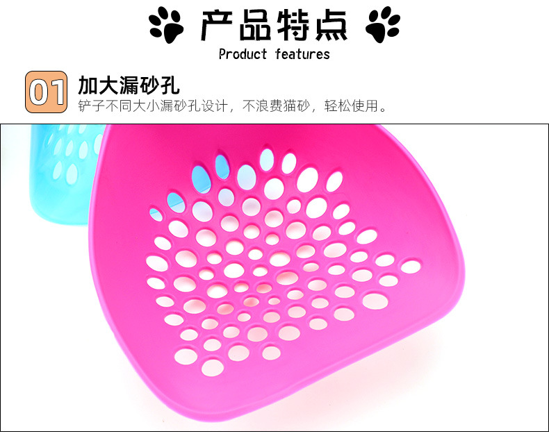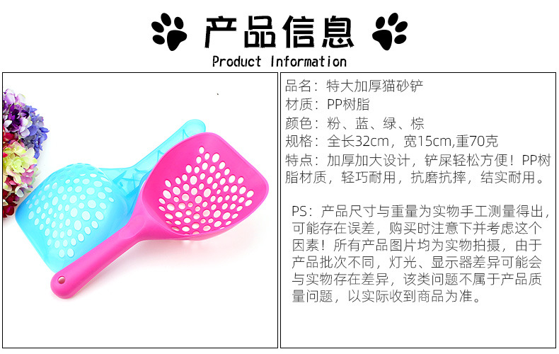【商品介绍】:加厚加大设计,铲屎轻松方便!PP树脂塑料制造,轻巧耐用,经济实惠;清理猫沙尿沙用的清洁铲,硬塑料制造,结实耐用。