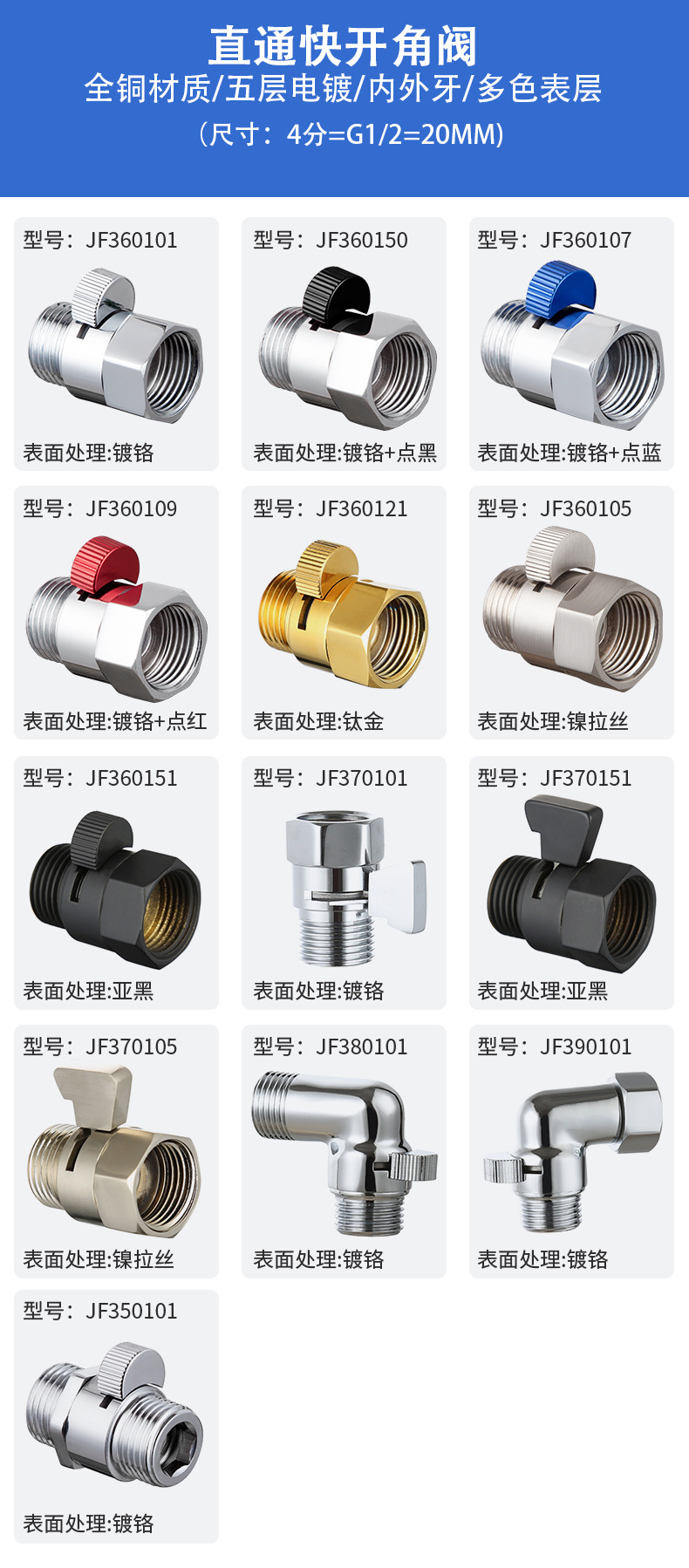 Хромированный переключательный клапан MF (JF360101); Хромированный переключающий клапан мм (JF350101); Хромированный + точечный черный переключающий клапан MF (JF360150); Хромированный + точечный синий переключающий клапан MF (JF360107); Хромированный + точечный красный переключатель клапана MF (JF360109); Клапан переключателя Яхии МФ (JF 360151 ); Титановый переключающий клапан расхода MF (JF360121); Никелированный матовый переключающий клапан MF (JF360105); Хромированный переключательный клапан MF (JF370101); Клапан переключателя Яхии МФ (JF370151); Никелированный матовый переключающий клапан MF (JF370105); Хромированный изогнутый клапан переключателя мм (JF380101); Хромированный изогнутый клапан переключателя MF (JF390101); Хромированный точечный красный переключатель, изогнутый клапан мм (JF380119); Хромированный точечный фиксированный клапан с синим переключателем мм (JF380117); Гальваническое поперечное соединение MF (JT006101); Матовый черный преобразовательный поток MF (JT006151); Никелированное матовое преобразовательное соединение MF (JT006105)