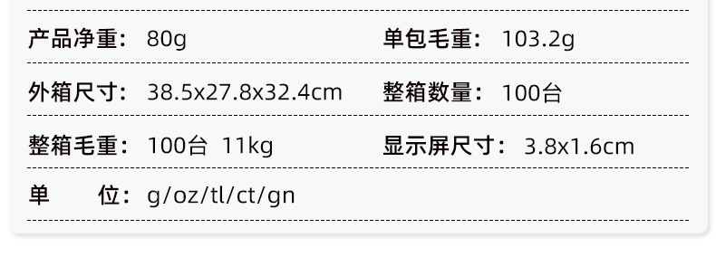 产品功能:单位切换/去皮清零/过载保护/低电显示/计数/校正/蓝屏LED开关/自动关机