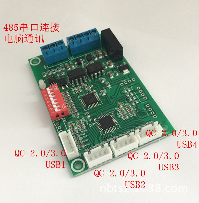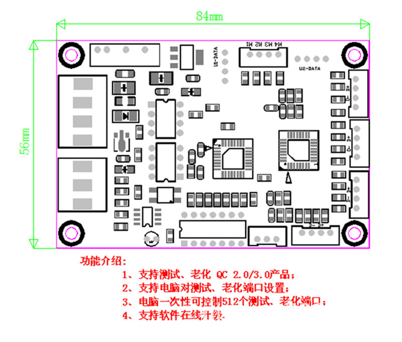 特点: 电脑智能监控板, 是一拖四的,四个白色插座可接四个老化位. 支持QC2.0,QC3.0快充充电器,也可支持TYPe-C充电器. 可监控,设置任意一组老化位的电流,电压,老化时间.统统在电脑上一键搞定.省人,省力,省时间.