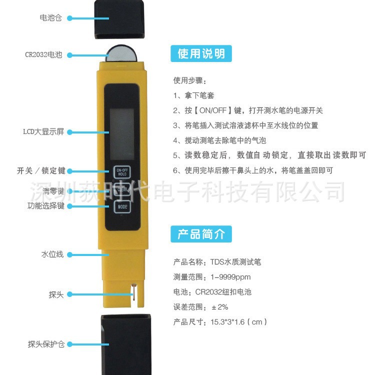 使用注意事项:避免将TDS笔全身浸泡到水中,避免阳光直射,远离高温,避免撞击重压和摔碰。