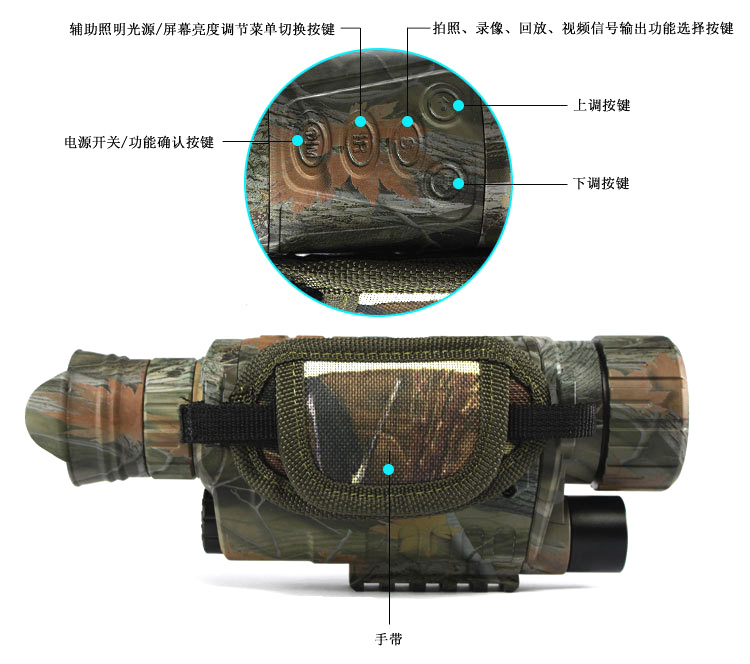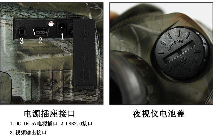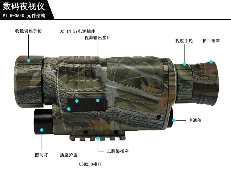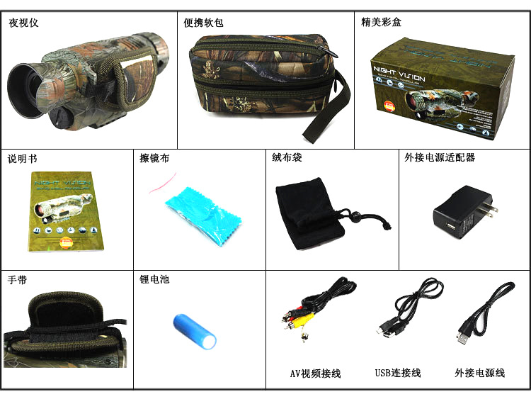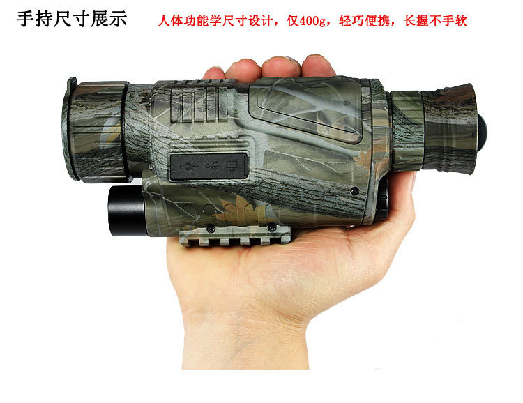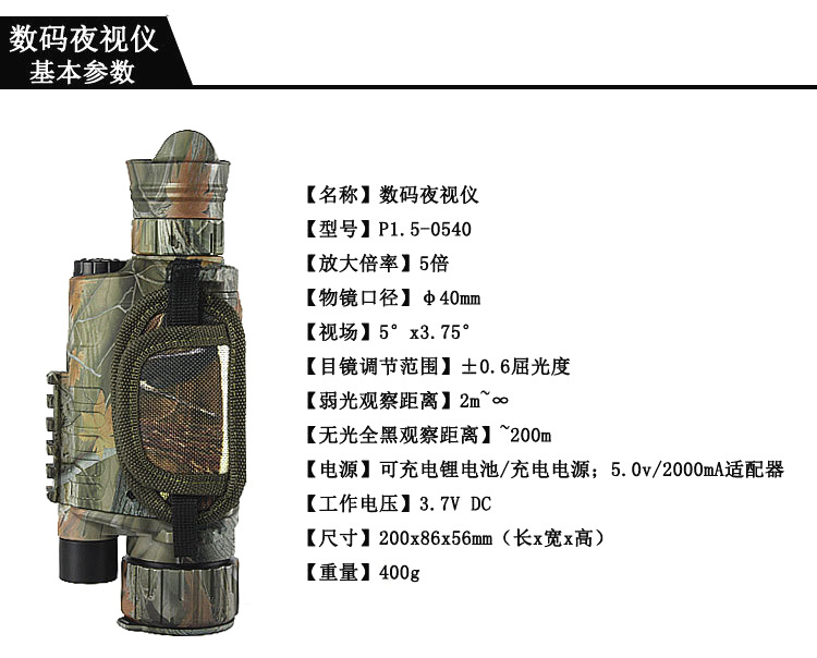 新款的数码夜视仪,在漆黑或微弱光线下观察物体,弱光观察距离无穷远,漆黑环境下可达200米,具有USB接口、视频输出接口和外接电源接口。功能齐全,可以在白天晚上正常使用,可拍照、录像 、回放等功能,5倍的放大倍数,电子变倍达到8倍。