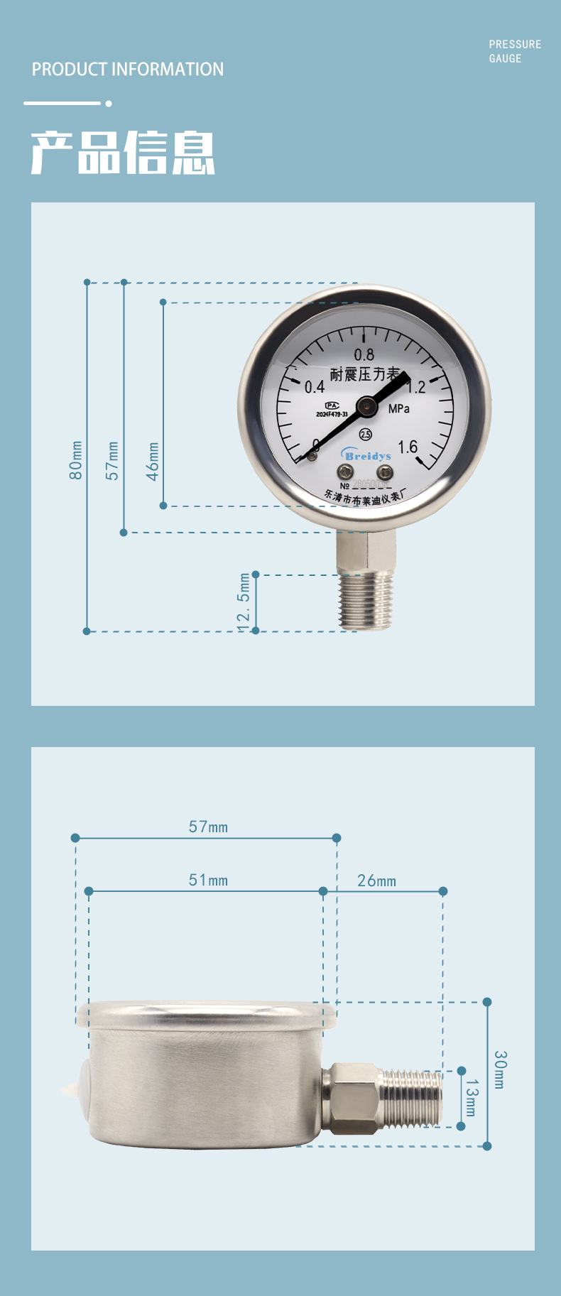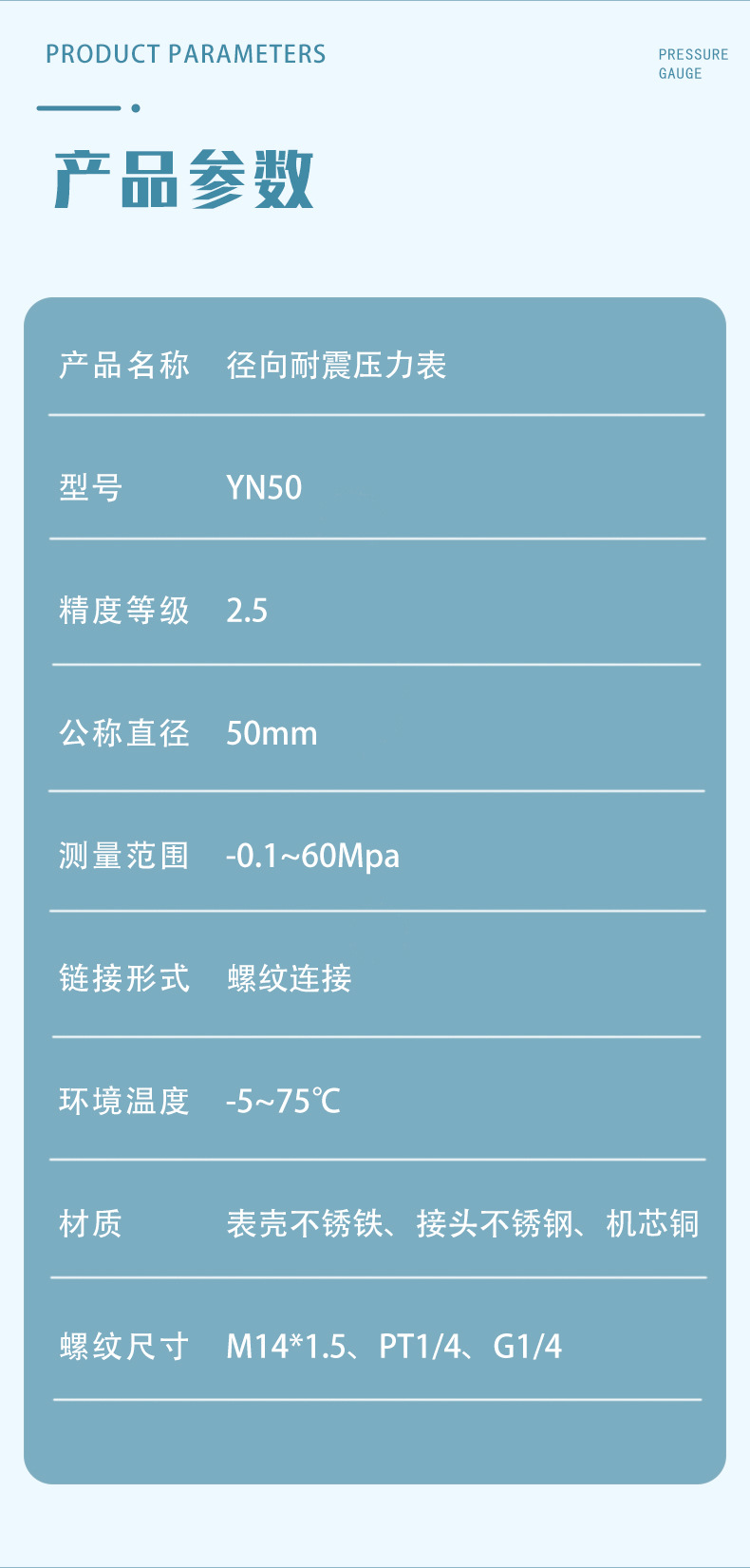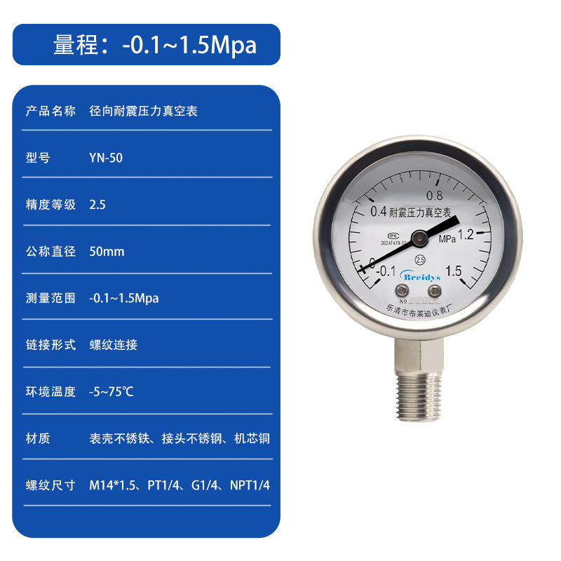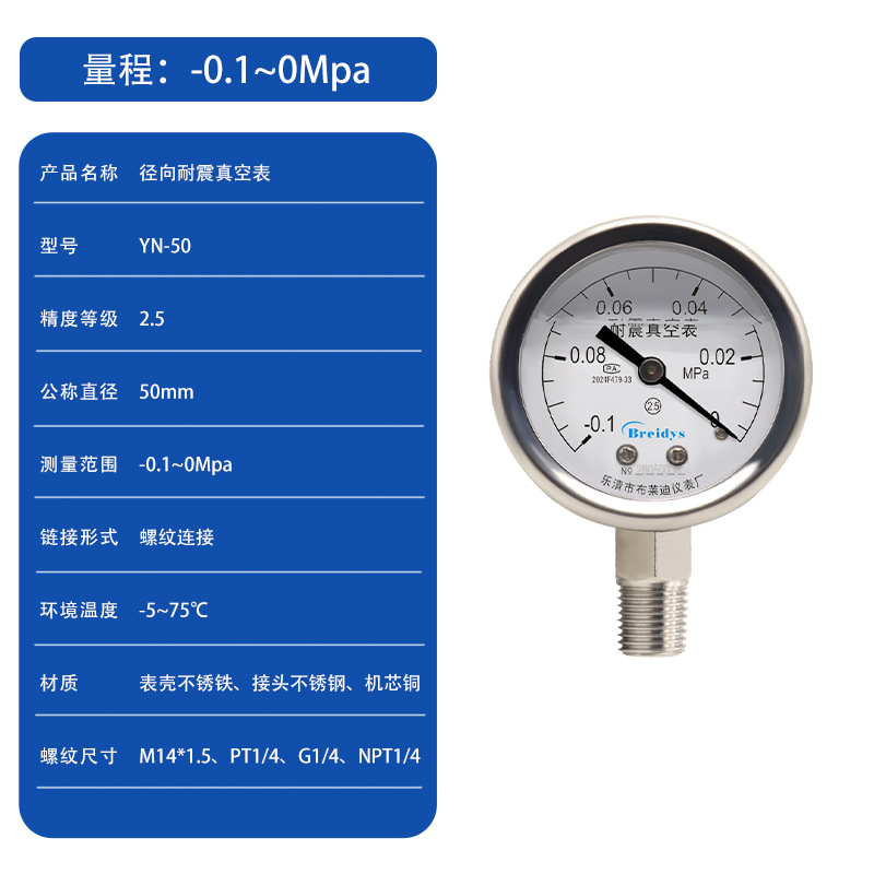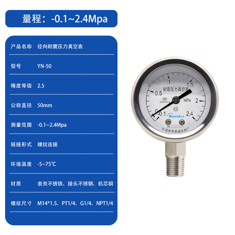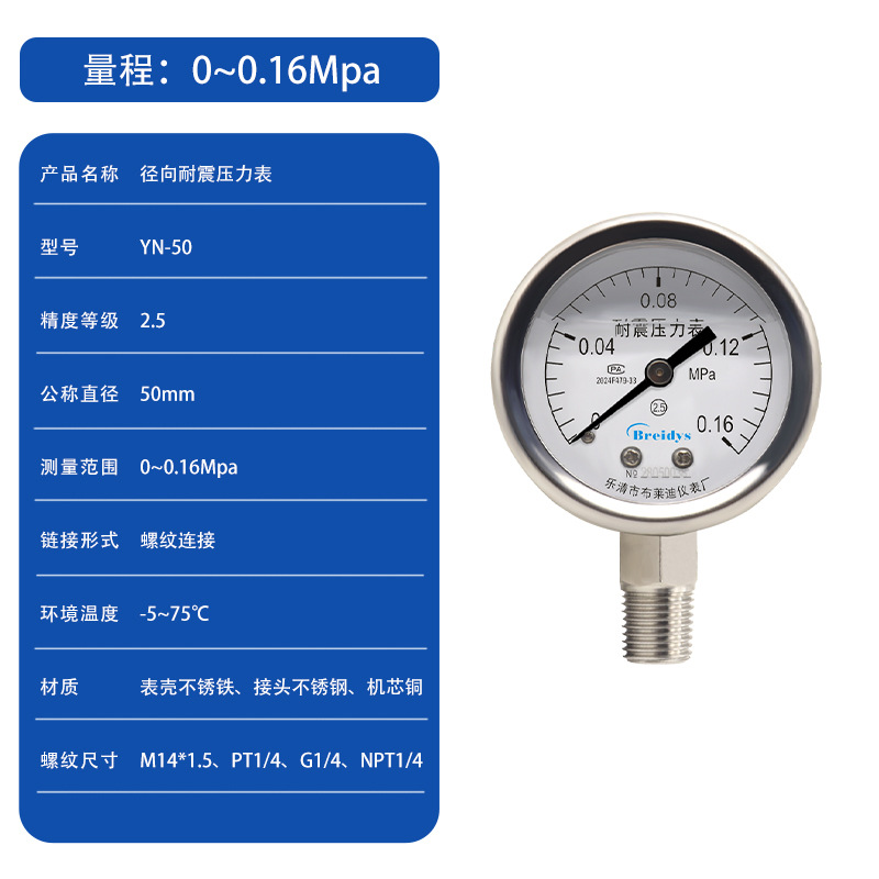 0.1Mpa; 0.16Mpa; 0.25Mpa; 0.4Mpa; 0.6Mpa; 1Mpa; 1.6Mpa; 2.5Mpa; 4Mpa; 6Mpa; 10Mpa; 16Mpa; 25Mpa; 40Mpa; 60Mpa; -0.1~0Mpa; -0.1~0.15Mpa; -0.1~0.3Mpa; -0.1~0.5Mpa; -0.1~0.9Mpa; -0.1~1.5Mpa; -0.1~2.4Mpa
